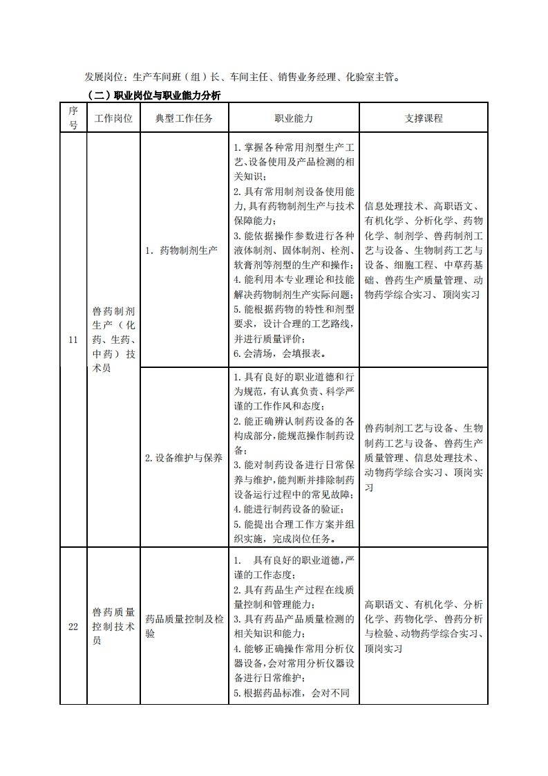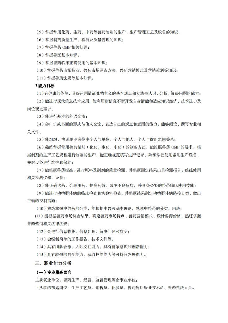 高等职业技术教育《动物药学》专业人才培养方案(普招三年制)专业代码:510303一、学制及招生对象(一)学制:三年(二)招生对象:高中(中职毕业生。(三)招生类型:文理兼收。二、培养目标与人才规格(一培养目标本专业培养德、智、体、美、劳全面发展,具有较高综合素质、良好职业道德、创新精神和创业意识,掌握兽药制剂的生产、兽药制剂的检测、兽药营销及售后服务等专业知识,具备兽药生产、检验、销售及服务、执法等能力,在兽用化药、生药及中药等制药企业从事有关兽药制剂生产、生产管理、质量控制、兽药销售及售后服务等工作的生产、建设、服务和管理第一线需要的高素质技术技能人才。(仁)人才规格1.素质目标(1)思想政治素质:拥护党的基本路线,具有坚定正确的政治方向;掌握毛泽东思想和邓小平理论以及“三个代表”的重要思想和科学发展观;具有正确的世界观、人生观和价值观,具有良好的诚信品质、敬业精神、责任意识、团队意识和诚信意识,格守公民基本道德规范。(2)职业素质:具有良好的职业安全、环境保护意识、职业道德,能够立足生产、建设、管理、服务一线,踏实进取,敬业奉献,善于合作,敢于竞争,勇于创新。(3)人文科学素质:具有宽阔的视野、良好的科学思维品质、高雅的审美情趣和正确的审美观:能够正确认识社会、主动适应社会,有较强文字和语言表达能力,有较强的人际交往能力和自我发展能力。(4)身体心理素质:具有健康的身体,良好的生活习惯,爱好体育运动,有一定的运动基础。具有健康积极的人生态度,良好的个性心理品质,有较强的心理调适能力和抗挫折能力。2知识目标(1)具有必须的公共英语听、说、读、写基本知识和职业英语知识;(2)具有必备的文化基础知识和人文社会科学知识:(3)具有计算机应用的基本知识:(4)掌握分析化学、有机化学及药物化学的基本知识: