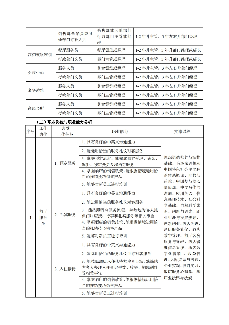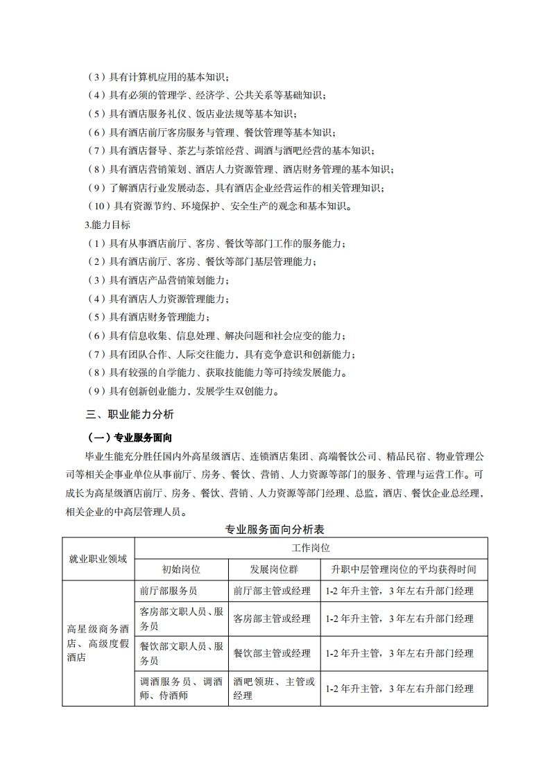 高等职业技术教育《酒店管理与数字化运营》专业人才培养方案(普招三年制)专业代码:540106一、学制及招生对象(一)学制:三年。(二)招生对象:高中(中职毕业生。(三)招生类型:文理兼收。二、培养目标与人才规格(一)培养目标酒店管理与数字化运营专业培养德、智、体、美、劳全面发展,具有较高综合素质、良好职业道德、创新精神和创业意识,掌握酒店管理基础理论和基本知识,有较强的职业素养和专业服务技能,具备精准服务、数字化运营、智慧化管理能力,在国内外高星级酒店、连锁酒店集团、高端餐饮公司、精品民宿、物业管理公司等相关企事业单位从事前厅、房务、餐饮、营销、人力资源等部门的服务、管理与运营第一线需要的高素质技术技能人才。(二)人才规格1.素质目标(1)思想政治素质:系统掌握马克思主义基本原理和马克思主义中国化理论成果,了解党史、新中国史、改革开放史、社会主义发展史,认识世情、国情、党情,深刻领会习近平新时代中国特色社会主义思想,培养运用马克思主义立场观点方法分析和解决问题的能力:自觉践行社会主义核心价值观,尊重和维护宪法法律权威,识大局、尊法治、修美德:矢志不渝听党话跟党走,争做社会主义合格建设者和可靠接班人。(2)职业素质:具有良好的职业安全、环境保护意识、职业道德、创新精神、创业意识,能够立足生产、建设、管理、服务一线,踏实进取,敬业奉献,善于合作,敢于竞争,勇于创新。(3)人文科学素质:具有宽阔的视野、良好的科学思维品质、高雅的审美情趣和正确的审美观:能够正确认识社会、主动适应社会,有较强文字和语言表达能力,有较强的人际交往能力和自我发展能力。(4)身体心理素质:具有健康的身体,良好的生活习惯,爱好体育运动,有一定的运动基础。具有健康积极的人生态度,良好的个性心理品质,有较强的心理调适能力和抗挫折能力。2.知识目标(1)具有必须的公共英语听、说、读、写基本知识和职业英语知识;(2)具有必备的文化基础知识和人文社会科学知识:
