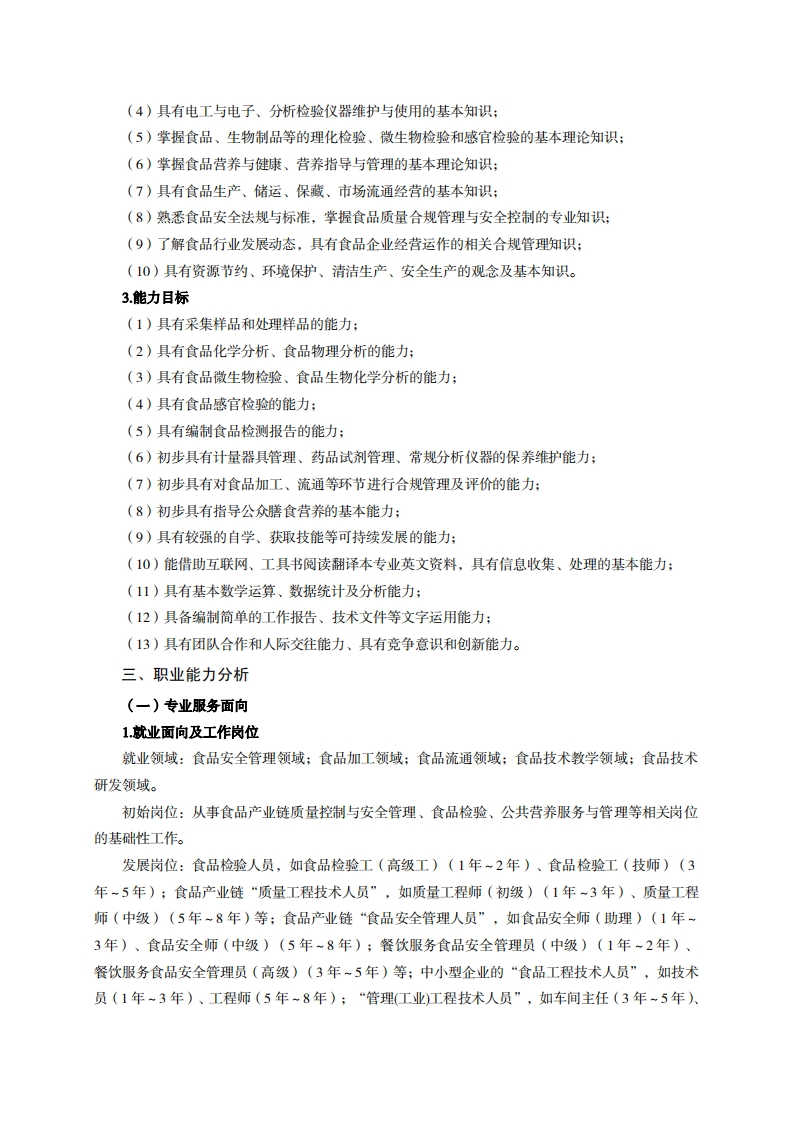 高等职业技术教育《食品检验检测技术》专业人才培养方案(普招三年制)专业代码:490104一、学制及招生对象(一)学制:三年。(二)招生对象:高中(中职)毕业生。(三)招生类型:理科。二、培养目标与人才规格(一)培养目标本专业培养德、智、体、美、劳全面发展,具有较高综合素质、良好职业道德、创新精神和创业意识,掌握食品检验检测、食品质量安全控制、食品营养与卫生、食品加工工艺的基本知识,具备食品检测、食品分析、食品安全控制、食品营养指导、食品运销等能力,在食品生产、流通、销售、检验等行业从事食品加工、食品检验、质量安全管理、营养指导与管理等方面工作的生产、建设、服务和管理第一线需要的高素质技术技能人才。(二)人才规格1.素质目标(1)思想政治素质:系统掌握马克思主义基本原理和马克思主义中国化理论成果,了解党史、新中国史、改革开放史、社会主义发展史,认识世情、国情、党情,深刻领会习近平新时代中国特色社会主义思想,培养运用马克思主义立场观点方法分析和解决问题的能力:自觉践行社会主义核心价值观,尊重和维护宪法法律权威,识大局、尊法治、修美德:矢志不渝听党话跟党走,争做社会主义合格建设者和可靠接班人。(2)职业素质:具有良好的职业安全、环境保护意识、职业道德、创新精神、创业意识,能够立足生产、建设、管理、服务一线,踏实进取,敬业奉献,善于合作,敢于竞争,勇于创新。(3)人文科学素质:具有宽阔的视野、良好的科学思维品质、高雅的审美情趣和正确的审美观;能够正确认识社会、主动适应社会,有较强文字和语言表达能力,有较强的人际交往能力和自我发展能力。(4)身体心理素质:具有健康的身体,良好的生活习惯,爱好体育运动,有一定的运动基础。具有健康积极的人生态度,良好的个性心理品质,有较强的心理调适能力和抗挫折能力。2.知识目标(1)具有本专业所必需的公共英语和职业英语知识:(2)具有必备的政治理论、计算机应用、数理基础,以及社会与人文知识:(3)具有有机化学、分析化学、食品生物化学等各类化学知识: