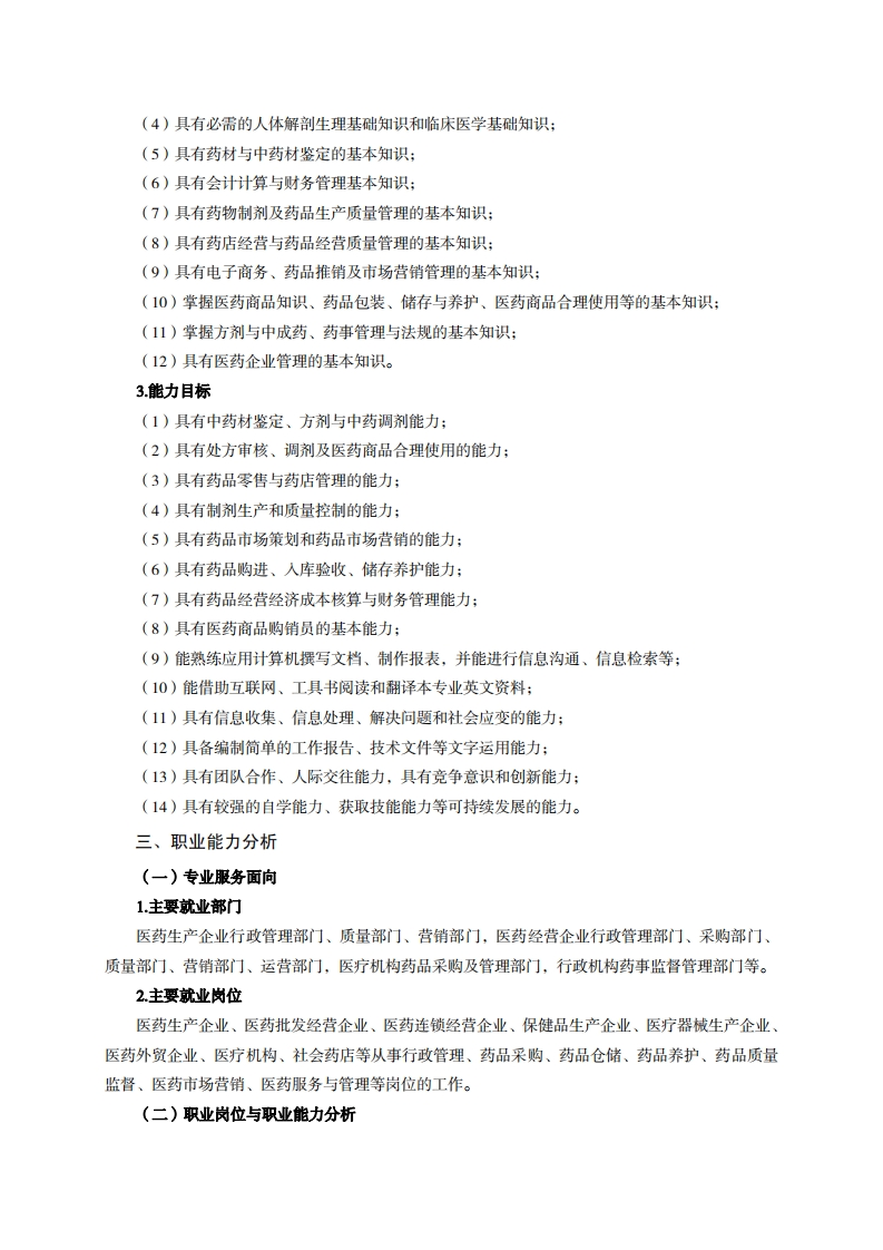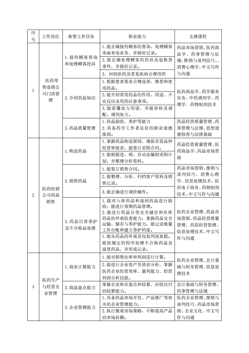 高等职业技术教育《药品经营与管理》专业人才培养方案(普招三年制)专业代码:590301一、学制及招生对象(一)学制:三年(二)招生对象:高中(中职)毕业生。(三)招生类型:文理兼收。二、培养目标与人才规格(一)培养目标本专业培养德、智、体、美、劳全面发展,具有较高综合素质、良好职业道德、创新精神和创业意识,掌握医药商品学、药理学、药事管理与法规、GS、医药市场营销、医药企业管理等基本知识,具备药品采购、验收、储存、养护与销售、药事服务、现代药品企业管理、药品市场营销策划、药店经营管理等能力,在医药行业从事医药商品经营、药政管理、医药市场营销等工作的生产、建设、服务和管理第一线需要的高素质技术技能人才。(二)人才规格1素质目标(1)思想政治素质:拥护党的基本路线,具有坚定正确的政治方向:掌握毛泽东思想和邓小平理论、“三个代表”重要思想和科学发展观,以及习近平新时代中国特色社会主义思想;具有正确的世界观、人生观和价值观,具有良好的诚信品质、敬业精神、责任意识和团队意识,格守公民基本道德规范。(2)职业素质:具有良好的职业安全、环境保护意识、职业道德、创新精神、创业意识,能够立足生产、建设、管理、服务一线,踏实进取,敬业奉献,善于合作,敢于竞争,勇于创新。(3)人文科学素质:具有宽阔的视野、良好的科学思维品质、高雅的审美情趣和正确的审美观:能够正确认识社会、主动适应社会,有较强语言和文字表达能力,有较强的人际交往能力和自我发展能力。(4)身体心理索质:具有健康的身体,良好的生活习惯,爱好体育运动,有一定的运动基础。具有健康积极的人生态度,良好的个性心理品质,有较强的心理调适能力和抗挫折能力。2.知识目标(1)具有公共英语听、说、读、写基本知识和职业英语知识:(2)具有文化基础知识和人文社会科学知识;(3)具有计算机应用的基本知识: