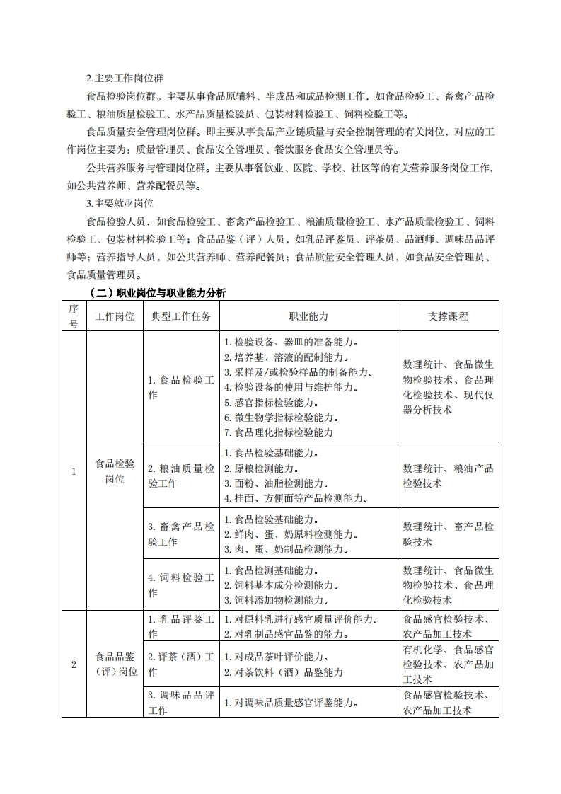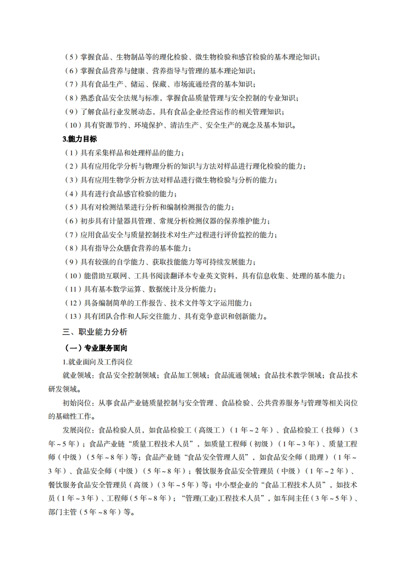 高等职业技术教育《食品营养与检测》专业人才培养方案(普招三年制)专业代码:590107一、学制及招生对象(一)学制:三年。(二)招生对象:高中(中职)毕业生。(三)招生类型:理科。二、培养目标与人才规格(一)培养目标本专业培养德、智、体、美、劳全面发展,具有较高综合素质、良好职业道德、创新精神和创业意识,掌握食品检验检测、食品质量安全控制、食品营养与卫生、食品加工工艺的基本知识,具备食品检测、食品分析、食品安全控制、食品营养指导、食品运销等能力,在食品生产、流通、销售、检验等行业从事食品加工、食品检验、质量安全管理、营养指导与管理等方面工作的生产、建设、服务和管理第一线需要的技术技能人才。(二)人才规格1.素质目标(1)思想政治素质:拥护党的基本路线,和坚定正确的政治方向;掌握毛泽东思想和邓小平理论以及“三个代表”的重要思想和科学发展观:具有正确的世界观、人生观和价值观,具有良好的诚信品质、敬业精神、责任意识、团队意识和诚信意识,恪守公民基本道德规范。(2)职业素质:具有良好的职业安全、环境保护意识、职业道德、创新精神、创业意识,能够立足生产、建设、管理、服务一线,踏实进取,敬业奉献,善于合作,敢于竞争,勇于创新。(3)人文科学素质:具有宽阔的视野、良好的科学思维品质、高雅的审美情趣和正确的审美观:能够正确认识社会、主动适应社会,有较强文字和语言表达能力,有较强的人际交往能力和自我发展能力。(4)身体心理素质:具有健康的身体,良好的生活习惯,爱好体育运动,有一定的运动基础:具有健康积极的人生态度,良好的个性心理品质,有较强的心理调适能力和抗挫折能力。2知识目标(1)具有本专业所必需的公共英语和职业英语知识:(2)具有必备的政治理论、计算机应用、数理基础,以及社会与人文知识:(3)具有有机化学、分析化学、食品生物化学等各类化学知识:(4)具有电工与电子、分析检验仪器维护与使用的基本知识: