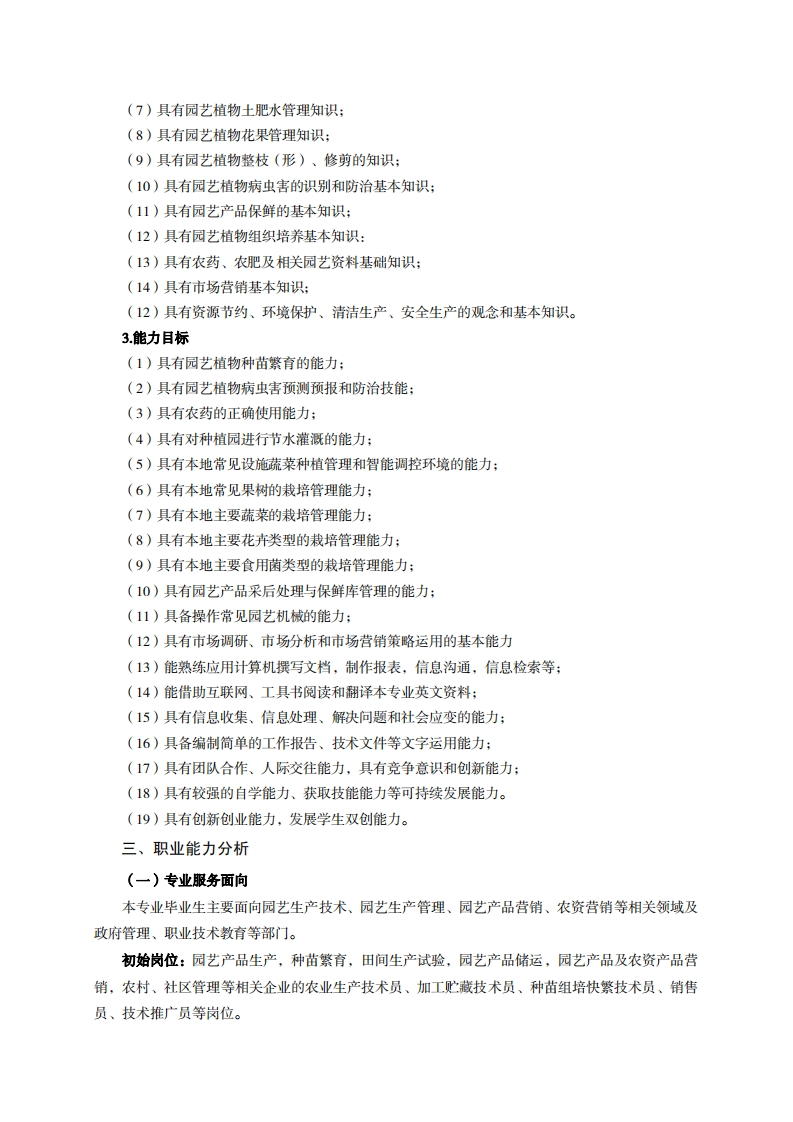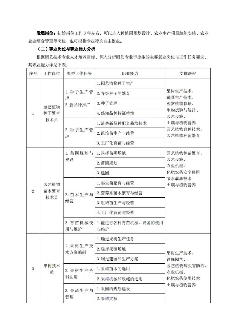 高等职业技术教育《园艺技术》专业人才培养方案(普招三年制)专业代码:410105一、学制及招生对象(一)学制:三年。(二)招生对象:高中(中职)毕业生。(三)招生类型:文理兼收二、培养目标与人才规格(一)培养目标本专业培养德、智、体、美、劳全面发展,具有较高综合素质、良好职业道德、创新精神和创业意识,掌握果树、蔬菜、花卉生产及农业生产资料使用、农业机械设备操作、农场经营管理等基本知识,具备从事果树、蔬菜、花卉生产管理及营销能力,在园艺生产相关企业和家庭园艺场从事生产、建设、服务和管理第一线需要的高素质技术技能人才。(二)人才规格1.素质目标(1)思想政治素质:系统掌握马克思主义基本原理和马克思主义中国化理论成果,了解党史、新中国史、改革开放史、社会主义发展史,认识世情、国情、党情,深刻领会习近平新时代中国特色社会主义思想,培养运用马克思主义立场观点方法分析和解决问题的能力;自觉践行社会主义核心价值观,尊重和维护宪法法律权威,识大局、尊法治、修美德:矢志不渝听党话跟党走,争做社会主义合格建设者和可靠接班人。(2)职业素质:具有良好的职业安全、环境保护意识、职业道德、创新精神、创业意识,能够立足生产、建设、管理、服务一线,踏实进取,敬业奉献,善于合作,敢于竞争,勇于创新。(3)人文科学素质:具有宽阔的视野、良好的科学思维品质、高雅的审美情趣和正确的审美观:能够正确认识社会、主动适应社会,有较强文字和语言表达能力,有较强的人际交往能力和自我发展能力。(4)身体心理素质:具有健康的身体,良好的生活习惯,爱好体育运动,有一定的运动基础。具有健康积极的人生态度,良好的个性心理品质,有较强的心理调适能力和抗挫折能力。2.知识目标(1)具有必备的文化基础知识和人文社会科学知识:(2)具有计算机应用的基本知识:(4)具有植物学、植物生理学、微生物学等基础知识:(5)具有园艺农资正确使用基本知识:(6)具有园艺植物种苗繁育基本知识: