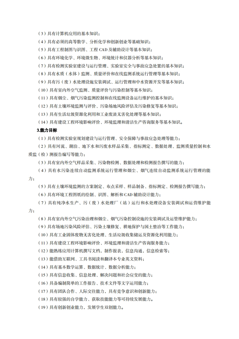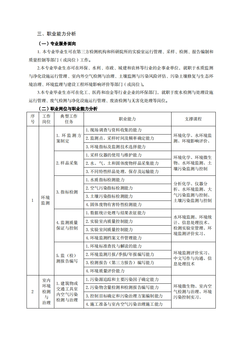高等职业技术教育《环境监测与控制技术》专业人才培养方案(普招三年制)专业代码:520801一、学制及招生对象(一)学制:三年。(二)招生对象:高中(中职)毕业生。(三)招生类型:理科。二、培养目标与人才规格(一)培养目标本专业培养德、智、体、美、劳全面发展,具有较高综合素质、良好职业道德、创新精神和创业意识,掌握空气、水体、土壤等环境的监测、分析、评价及污染控制等方面基本知识,具备环境监测与评价、污染控制与环境治理、工程监理与环保督查、环保设施运行管理、实验室建设与日常管理等能力,在环保、水利、市政、国土、城建、化工、医药和农林等行业的行政管理部门或企业,从事第三方检测服务、污(废)水监测与净化设施运行管理、室内外空气检测与治理、土壤检测与环境风险评估、污染土壤修复与生态环境治理、环境监理与建设工程环境影响评价等工作的生产、建设、服务和管理第一线需要的高素质技术技能人才。(二)人才规格1.素质目标(1)思想政治素质:拥护党的基本路线,具有坚定正确的政治方向;掌握毛泽东思想和邓小平理论以及“三个代表”的重要思想和科学发展观;具有正确的世界观、人生观和价值观,具有良好的诚信品质、敬业精神、责任意识、团队意识和诚信意识,恪守公民基本道德规范。(2)职业素质:具有良好的职业安全、环境保护意识、职业道德、创新精神、创业意识,能够立足生产、建设、管理、服务一线,踏实进取,敏业奉献,善于合作,敢于竞争,勇于创新。(3)人文科学素质:具有宽阔的视野、良好的科学思维品质、高雅的审美情趣和正确的审美观;能够正确认识社会、主动适应社会,有较强文字和语言表达能力,有较强的人际交往能力和自我发展能力。(4)身体心理素质:具有健康的身体,良好的生活习惯,爱好体育运动,有一定的运动基础。具有健康积极的人生态度,良好的个性心理品质,有较强的心理调适能力和抗挫折能力。2.知识目标(1)具有必须的公共英语听、说、读、写基本知识和职业英语知识:(2)具有必备的文化基础知识和人文社会科学知识: