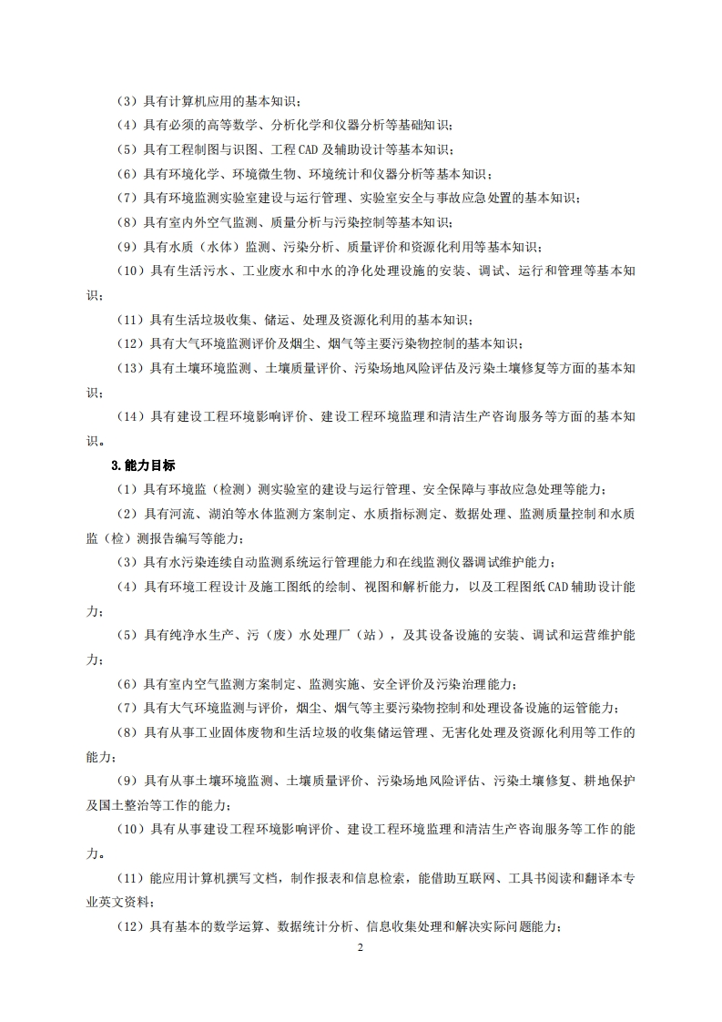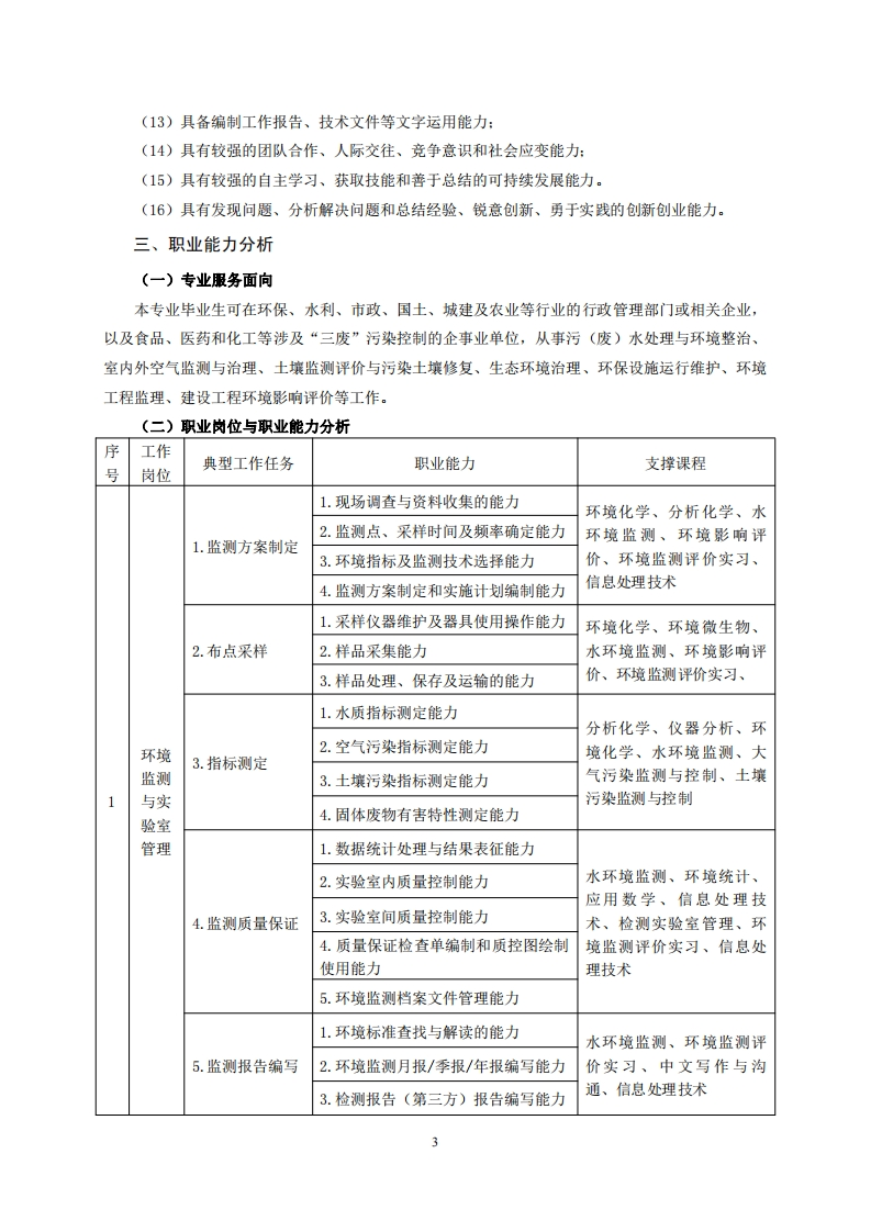 高等职业技术教育《环境监测与控制技术》专业人才培养方案(普招三年制)专业代码:520801一、学制及招生对象(一)学制:三年。(二)招生对象:高中(中职)毕业生。(三)招生类型:理科。二、培养目标与人才规格(一)培养目标本专业培养德、智、体全面发展,具有较高综合素质、良好职业道德、创新精神和创业意识,掌握空气、水体、土壤等环境的监测、分析、评价及污染控制等方面基本知识,具备环境监测与评价、污染控制与环境治理、工程监理与环保督查、室内污染检测与治理等能力,在环保、水利、市政、国土、城建及农业等行业的行政管理部门或食品、医药、化工等涉及“三废”处理的相关企业,从事污水处理与环境整治、室内外空气检测与治理、耕地保护与污染土壤修复、生态环境治理、环保设施运行维护、环境工程监理、建设工程环境影响评价等工作的生产、建设、服务和管理第一线需要的高素质技术技能人才。(二)人才规格1.素质目标(1)思想政治素质:拥护党的基本路线,具有坚定正确的政治方向:掌握毛泽东思想和邓小平理论以及“三个代表”的重要思想和科学发展观:具有正确的世界观、人生观和价值观,具有良好的诚信品质、敬业精神、责任意识、团队意识和诚信意识,恪守公民基本道德规范。(2)职业素质:具有良好的职业素养、创新意识和进取精神,立足生产、建设、管理、服务一线,勤奋努力,敬业奉献,善于合作,敢于担当,勇于创新。(3)人文科学素质:具有广阔的视野、良好的科学思维、高雅的审美情趣和正确的审美观:能够正确认识社会、主动适应社会,有较强文字和语言表达能力,有较强的人际交往能力和自我发展能力。(4)身体心理素质:具有健康的身体,良好的生活习惯,爱好体育运动,有一定的运动基础。具有健康积极的人生态度,良好的个性心理品质,有较强的心理调适能力和抗挫折能力。2.知识目标(1)具有必须的公共英语听、说、读、写基本知识和职业英语知识:(2)具有必备的文化基础知识和人文社会科学知识: