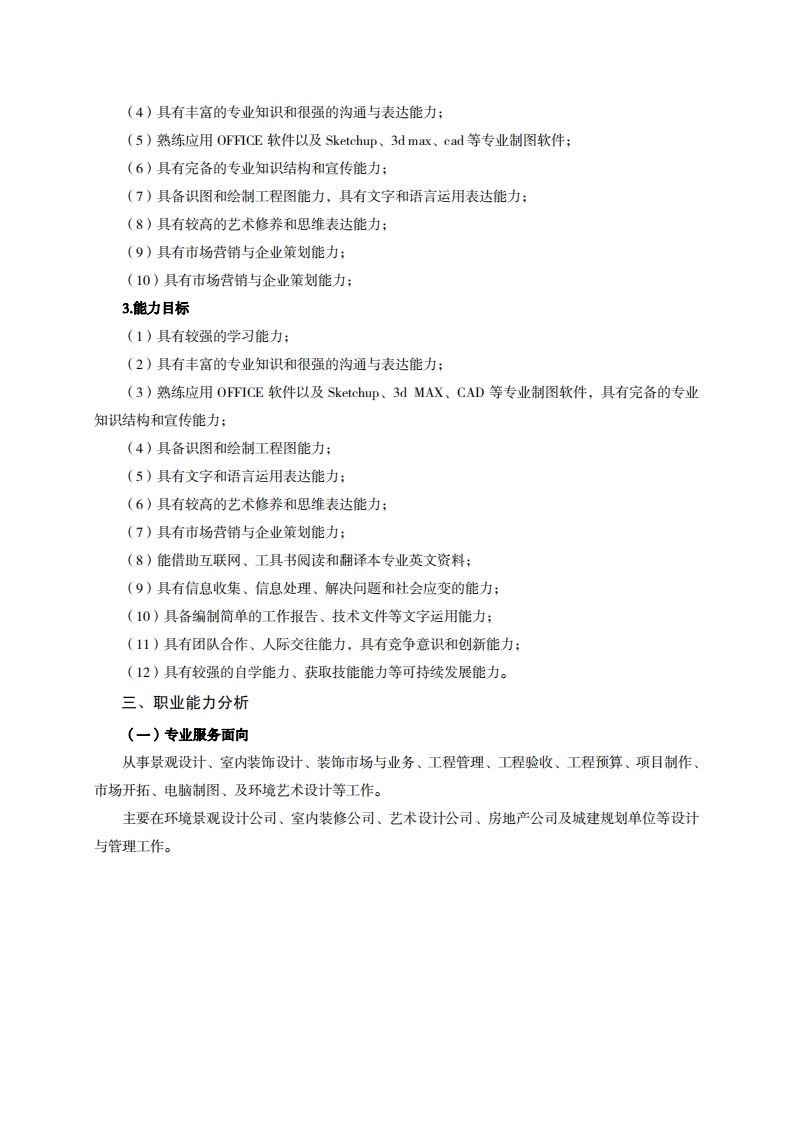 高等职业技术教育《环境艺术设计》专业人才培养方案(普招三年制)专业代码:650111一、学制及招生对象(一)学制:三年。(二)招生对象:高中(中职)毕业生。(三)招生类型:文理兼收。二、培养目标与人才规格(一)培养目标本专业培养德、智、体、美、劳全面发展,具有较高综合素质、良好职业道德、创新精神和创业意识,掌握园林景观设计与建筑室内装饰设计知识,具备园林景观和建筑室内装饰设计与施工组织管理能力,在园林景观行业或室内装饰行业从事设计、施工及组织管理工作的第一线需要的高素质技术技能人才。(二)人才规格1素质目标(1)思想政治素质:拥护党的基本路线,具有坚定正确的政治方向:掌握毛泽东思想和邓小平理论以及“三个代表”的重要思想、科学发展观和习近平新时代中国特色社会主义思想;具有正确的世界观、人生观和价值观,具有良好的诚信品质、敬业精神、责任意识、团队意识和诚信意识,恪守公民基本道德规范。(2)职业素质:具有良好的职业安全、环境保护意识、职业道德、创新精神、创业意识,能够立足生产、建设、管理、服务一线,踏实进取,敬业奉献,善于合作,敢于竞争,勇于创新。(3)人文科学素质:具有宽阔的视野、良好的科学思维品质、高雅的审美情趣和正确的审美观:能够正确认识社会、主动适应社会,有较强文字和语言表达能力,有较强的人际交往能力和自我发展能力。(4)身体心理素质:具有健康的身体,良好的生活习惯,爱好体育运动,有一定的运动基础。具有健康积极的人生态度,良好的个性心理品质,有较强的心理调适能力和抗挫折能力。2知识目标(1)具有必须的公共英语听、说、读、写基本知识和职业英语知识:(2)具有必备的文化基础知识和人文社会科学知识:(3)具有计算机应用的基本知识: