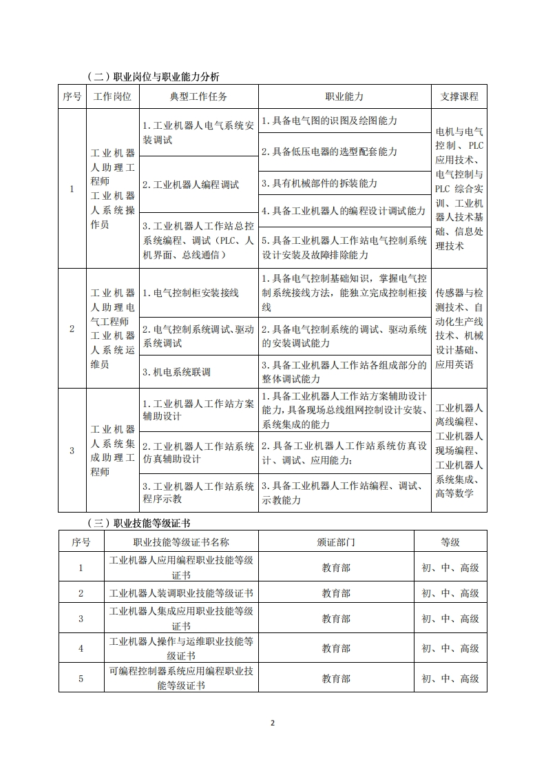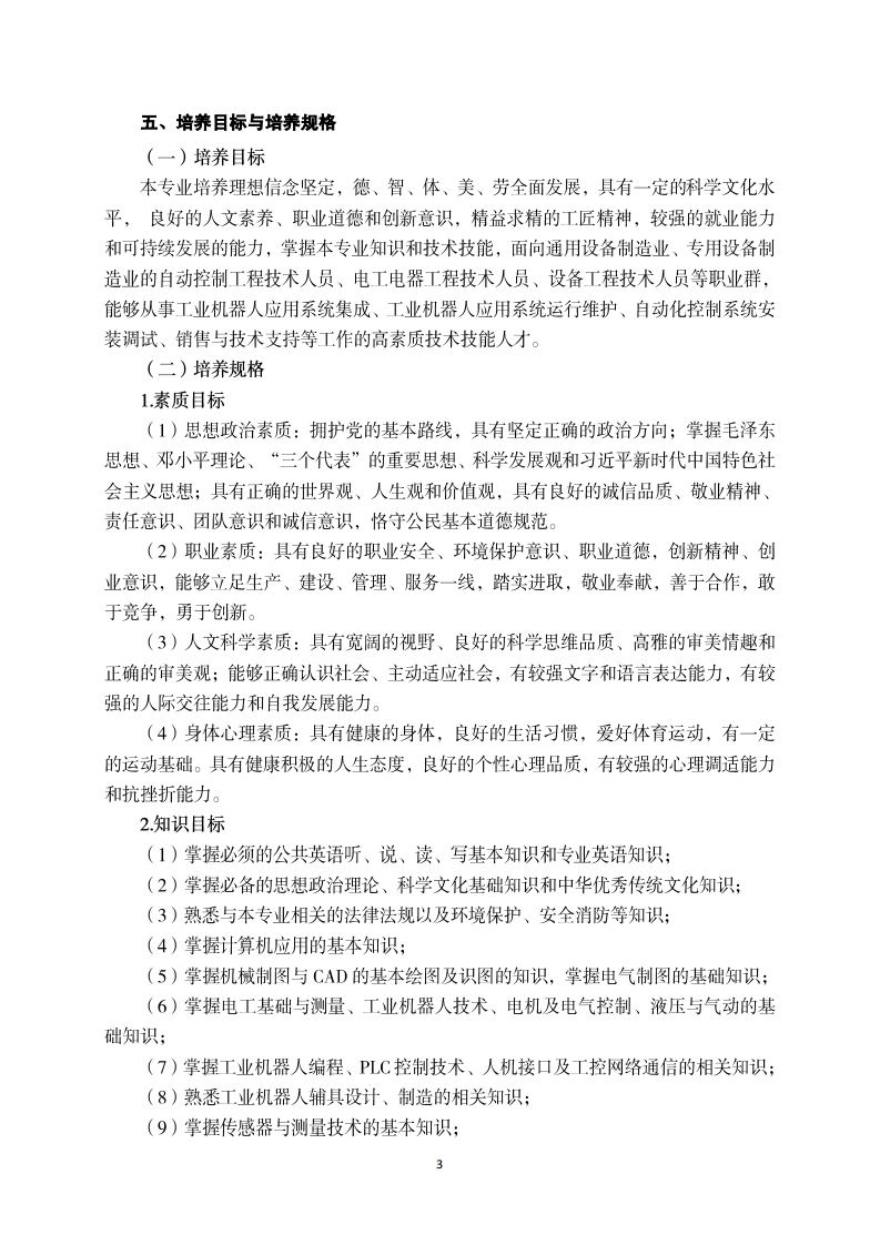 高等职业技术教育《工业机器人技术》专业人才培养方案(2019级)一,专业名称及代码专业名称:工业机器人技术专业代码:560309二、入学要求招生对象:普通高级中学毕业、中等职业学校毕业或具备同等学力招生类型:理科三、修业年限三年(全日制)》四、职业面向(一)专业服务面向工业机器人技术专业(560309)属于装备制造大类(56)自动化类(5603)。本专业面向机电、自动化及装备制造大类中生产性企事业单位,主要从事工业机器人工作站的电气设计、电气制造、系统集成、现场编程、调试维护等生产技术管理工作,以及工业机器人销售和售后服务及安全管理等工作。所属专业大类所属专业类对应行业主要职业类别主要岗位群或技(代码)(代码)(代码)(代码)术领域举例工业机器人系统操作员工业机器人助理(6-30-99-00):工程师:工业机器工业机器人系统运维员通用设备制人系统操作员:工装备制造大类自动化类造业(34):(6-31-01-10):业机器人助理电(56)(5603)专用设备制自动控制工程技术人员(2-02-07-07):气工程师:工业机造业(35)器人系统运维员:电工电器工程技术人员工业机器人系统(2-02-11-01):集成助理工程师设备工程技术人员(2-02-07-04)1