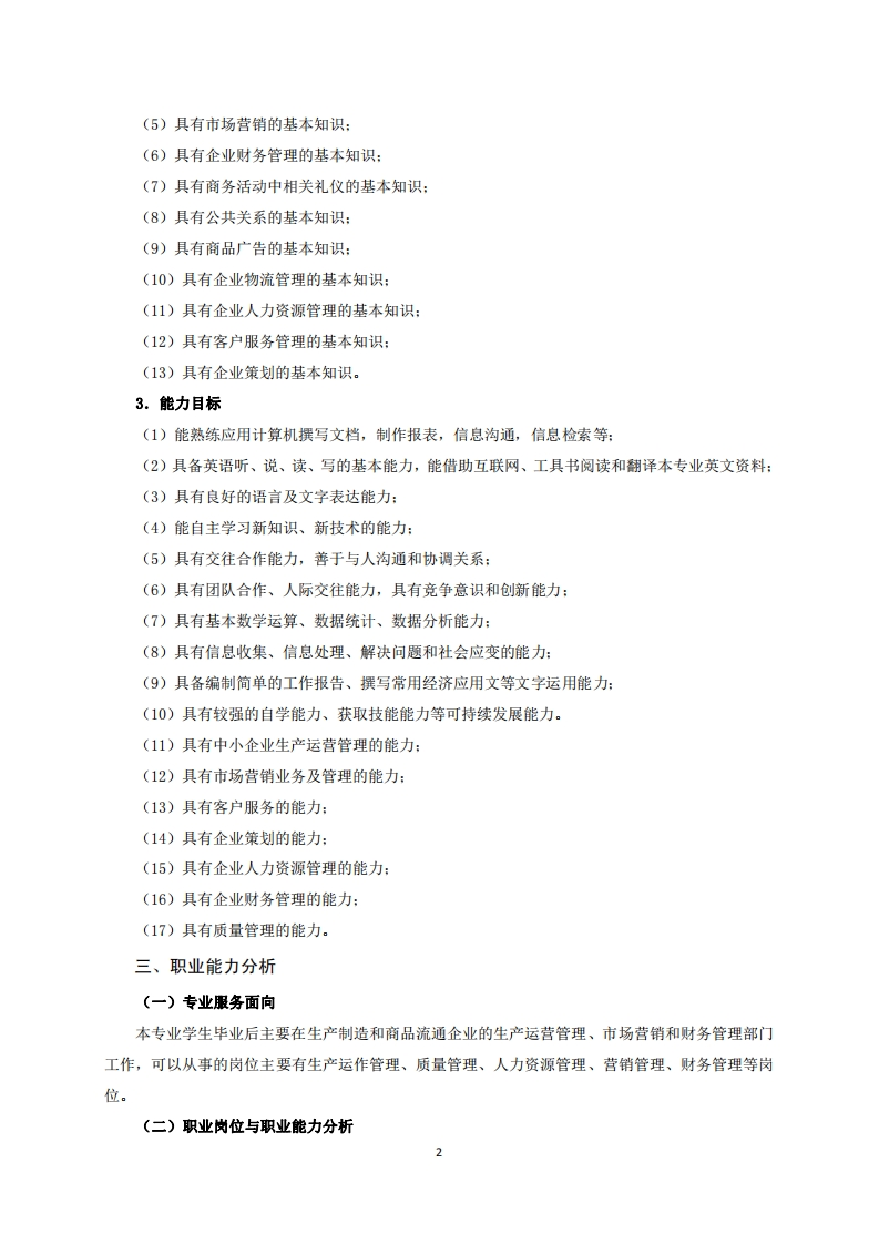 高等职业技术教育《工商企业管理》专业人才培养方案(普招三年制)专业代码:630601一、学制及招生对象(一)学制:三年。(二)招生对象:高中(中职)毕业生。(三)招生类型:文史。二、培养目标及人才规格(一)培养目标本专业培养德、智、体全面发展,具有较高的综合素质和良好的职业道德、创新精神、自主创业意识,掌握企业市场运营、财务管理、人力资源、客户服务等相关理论知识,具有企业运营管理能力、市场营销能力和企业理财能力,在生产制造和商品流通企业的管理、服务一线,从事企业生产运营、产品销售、客户服务、人力资源管理及财务管理等工作的技术技能人才。(二)人才规格1.素质目标(1)思想政治素质:拥护党的基本路线,具有坚定正确的政治方向:掌握毛泽东思想和邓小平理论以及“三个代表”的重要思想和科学发展观:具有正确的世界观、人生观和价值观,具有良好的诚信品质、敬业精神、责任意识、团队意识和诚信意识,恪守公民基本道德规范。(2)职业素质:具有良好的职业安全、职业道德、创新精神、创业意识,能够立足生产、建设、管理、服务一线,踏实进取,敬业奉献,善于合作,敢于竞争,勇于创新。(3)人文科学素质:具有宽阔的视野、良好的科学思维品质、高雅的审美情趣和正确的审美观:能够正确认识社会、主动适应社会,有较强文字和语言表达能力,有较强的人际交往能力和自我发展能力。(4)身体心理素质:具有健康的身体,良好的生活习惯,爱好体育运动,有一定的运动基础。具有健康积极的人生态度,良好的个性心理品质,有较强的心理调适能力和抗挫折能力。2.知识目标(1)具有必须的公共英语听、说、读、写基本知识和职业英语知识:(2)具有必须的人文社会科学知识:(3)具有社会主义市场经济运行的基本知识:(4)具有企业生产运营管理的基本知识: