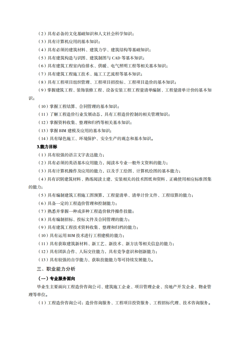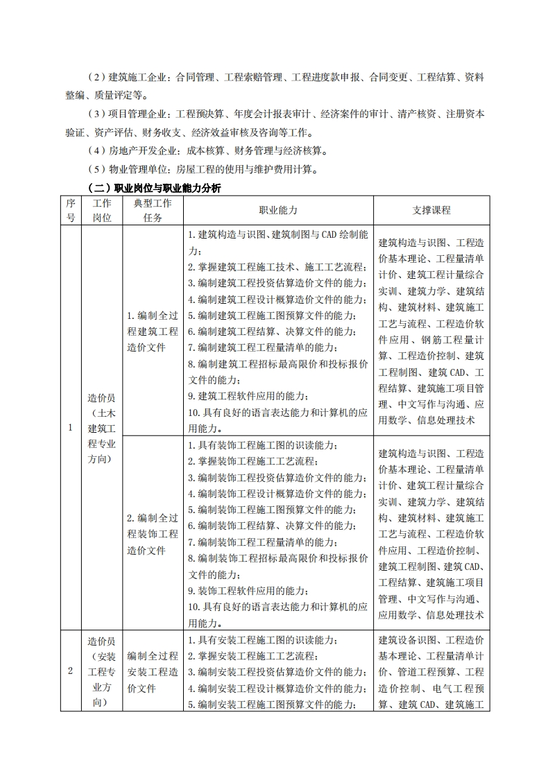 高等职业技术教育《工程造价》专业人才培养方案(普招三年制)专业代码:440501一、学制及招生对象(一)学制:三年。(二)招生对象:高中(中职)毕业生。(三)招生类型:文理兼收。二、培养目标与人才规格(一)培养目标本专业培养德、智、体、美、劳全面发展,具有较高综合素质、良好职业道德、创新精神和创业意识,掌握建筑工程招投标、建筑工程计量与计价、工程结算、合同管理等知识,具备工程计量与计价及造价控制能力,在工程造价咨询、建筑施工、工程项目管理等企事业单位,在造价员、资料员、BM建筑信息模型技术员等岗位从事施工图预算、工程量清单计价、工程结算编制、投资控制、工程招标代理、工程资料整编等工作的生产、建设、服务和管理第一线需要的高素质技术技能人才。(二)人才规格1.素质目标(1)思想政治素质:系统掌握马克思主义基本原理和马克思主义中国化理论成果,了解党史、新中国史、改革开放史、社会主义发展史,认识世情、国情、党情,深刻领会习近平新时代中国特色社会主义思想,培养运用马克思主义立场观点方法分析和解决问题的能力;自觉践行社会主义核心价值观,尊重和维护宪法法律权威,识大局、尊法治、修美德;矢志不渝听党话跟党走,争做社会主义合格建设者和可靠接班人。(2)职业素质:具有良好的职业安全、环境保护意识、职业道德、创新精神、创业意识,能够立足生产、建设、管理、服务一线,踏实进取,敬业奉献,善于合作,敢于竞争,勇于创新。(3)人文科学素质:具有宽阔的视野、良好的科学思维品质、高雅的审美情趣和正确的审美观:能够正确认识社会、主动适应社会,有较强文字和语言表达能力,有较强的人际交往能力和自我发展能力。(4)身体心理素质:具有健康的身体,良好的生活习惯,爱好体育运动,有一定的运动基础。具有健康积极的人生态度,良好的个性心理品质,有较强的心理调适能力和抗挫折能力。2.知识目标(1)具有必须的公共英语听、说、读、写基本知识和职业英语知识: