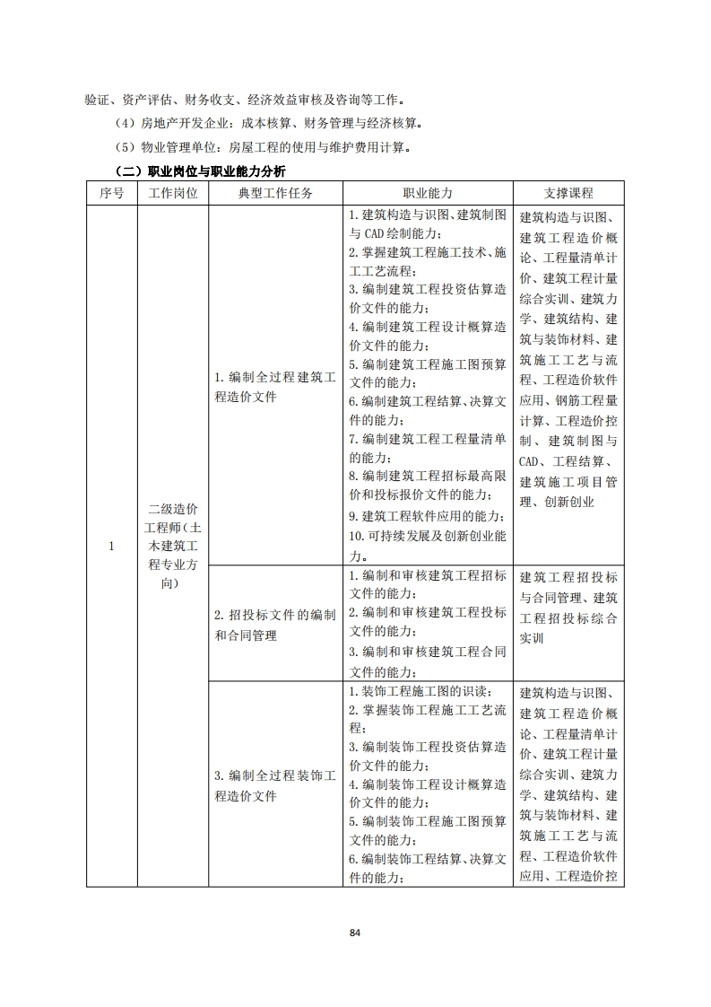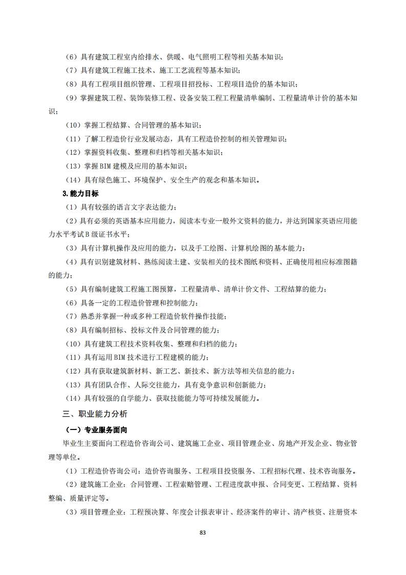 高等职业技术教育《工程造价》专业人才培养方案((普招三年制)专业代码:540502一、学制及招生对象(一)学制:三年。(二)招生对象:高中(中职)毕业生。(三)招生类型:文理兼收。二、培养目标与人才规格(一)培养目标本专业培养德、智、体全面发展,具有较高综合素质、良好职业道德、创新精神和创业意识,掌握建筑工程招投标、建筑工程计量与计价、工程结算、合同管理等知识,具备工程计量与计价及造价控制能力,在工程造价咨询、建筑施工、工程项目管理等企事业单位,在造价员、招标员、资料员、质量员等岗位,从事施工图预算、工程量清单计价、工程结算编制、投资控制、工程招标代理、工程资料整编等工作的生产、建设、服务和管理第一线需要的高素质技术技能人才。(二)人才规格1.素质目标(1)思想政治素质:拥护党的基本路线,具有坚定正确的政治方向:掌握毛泽东思想和邓小平理论以及“三个代表”的重要思想和科学发展观:具有正确的世界观、人生观和价值观,具有良好的诚信品质、敬业精神、责任意识、团队意识和诚信意识,格守公民基本道德规范。(2)职业素质:具有良好的职业安全、环境保护意识、职业道德、创新精神、创业意识,能够立足生产、建设、管理、服务一线,踏实进取,敬业奉献,善于合作,敢于竞争,勇于创新。(3)人文科学素质:具有宽阔的视野、良好的科学思维品质、高雅的审美情趣和正确的审美观:能够正确认识社会、主动适应社会,有较强文字和语言表达能力,有较强的人际交往能力和自我发展能力。(4)身体心理素质:具有健康的身体,良好的生活习惯,爱好体育运动,有一定的运动基础。具有健康积极的人生态度,良好的个性心理品质,有较强的心理调适能力和抗挫折能力。2.知识目标(1)具有必须的公共英语听、说、读、写基本知识和职业英语知识:(2)具有必备的文化基础知识和人文社会科学知识:(3)具有计算机应用的基本知识:(4)具有必须的建筑材料、建筑力学、建筑结构等基础知识:(5)具有建筑构造与识图、建筑制图与CAD等基本知识:82