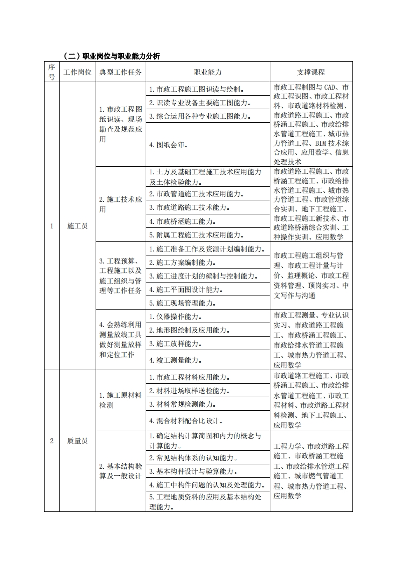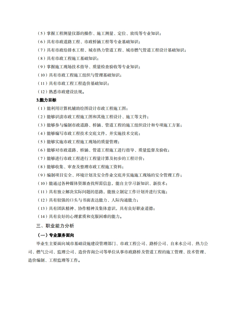 高等职业技术教育《市政工程技术》专业人才培养方案(普招三年制)专业代码:540601一、学制及招生对象(一)学制:三年。(二)招生对象:高中(中职)毕业生。(三)招生类型:理科。二、培养目标与人才规格(一)培养目标本专业培养德、智、体、美、劳全面发展,具有较高综合素质、良好职业道德、创新精神和创业意识,掌握市政工程技术的基本理论知识,具备市政管道、市政道路、桥梁施工与技术管理等方面职业能力:在市政行业企业从事组织施工、技术管理、市政设施维护等工作的生产、建设、服务和管理第一线需要的高素质技术技能型人才。(二)人才规格1素质目标(1)思想政治素质:拥护党的基本路线,具有坚定正确的政治方向:掌握毛泽东思想和邓小平理论以及“三个代表”的重要思想和科学发展观;具有正确的世界观、人生观和价值观,具有良好的诚信品质、敬业精神、责任意识、团队意识和诚信意识,格守公民基本道德规范。(2)职业素质:具有良好的职业安全、环境保护意识、职业道德、创新精神、创业意识,能够立足生产、建设、管理、服务一线,踏实进取,敬业奉献,善于合作,敢于竞争,勇于创新。(3)人文科学素质:具有宽阔的视野、良好的科学思维品质、高雅的审美情趣和正确的审美观:能够正确认识社会、主动适应社会,有较强文字和语言表达能力,有较强的人际交往能力和自我发展能力。(4)身体心理素质:具有健康的身体,良好的生活习惯,爱好体育运动,有一定的运动基础。具有健康积极的人生态度,良好的个性心理品质,有较强的心理调适能力和抗挫折能力。2知识目标(1)具有高职毕业生必备的数学、应用文写作、英语、体育运动和计算机应用的基础知识:(2)领会毛泽东思想和中国特色社会主义理论基本原理,具有思想道德修养与法律基础知识,掌握辩证唯物主义的思想方法;(3)具有市政工程制图及计算机辅助设计的基础知识:(4)掌握市政工程常用的建筑材料及试验检测等专业知识: