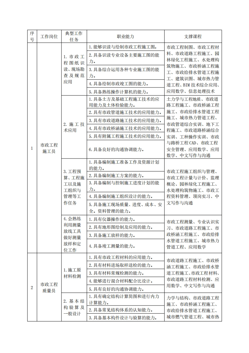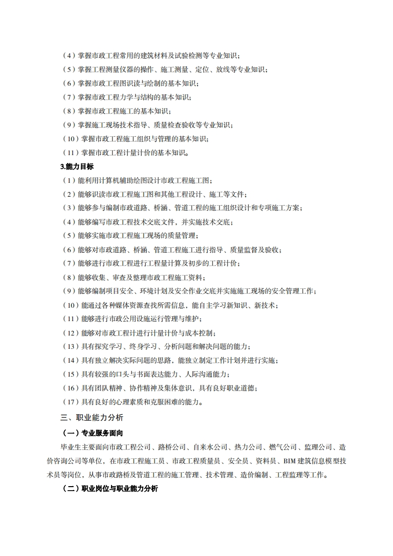 高等职业技术教育《市政工程技术》专业人才培养方案(普招三年制)专业代码:440601一、学制及招生对象(一)学制:三年。(二)招生对象:高中(中职)毕业生。(三)招生类型:文理兼收。二、培养目标与人才规格(一)培养目标本专业培养德、智、体、美、劳全面发展,具有较高综合素质、良好职业道德、创新精神和创业意识,掌握市政工程材料、识图、测量、施工工艺、项目管理等专业知识,具备市政管道、市政道路、桥梁施工与技术管理等方面职业能力:在市政行业企业从事组织施工、技术管理、市政设施维护等工作的生产、建设、服务和管理第一线需要的高素质技术技能人才。(二)人才规格1.素质目标(1)思想政治素质:系统掌握马克思主义基本原理和马克思主义中国化理论成果,了解党史、新中国史、改革开放史、社会主义发展史,认识世情、国情、党情,深刻领会习近平新时代中国特色社会主义思想,培养运用马克思主义立场观点方法分析和解决问题的能力;自觉践行社会主义核心价值观,尊重和维护宪法法律权威,识大局、尊法治、修美德;矢志不渝听党话跟党走,争做社会主义合格建设者和可靠接班人。(2)职业素质:具有良好的职业安全、环境保护意识、职业道德、创新精神、创业意识,能够立足生产、建设、管理、服务一线,踏实进取,敬业奉献,善于合作,敢于竞争,勇于创新。(3)人文科学素质:具有宽阔的视野、良好的科学思维品质、高雅的审美情趣和正确的审美观:能够正确认识社会、主动适应社会,有较强文字和语言表达能力,有较强的人际交往能力和自我发展能力。(4)身体心理素质:具有健康的身体,良好的生活习惯,爱好体育运动,有一定的运动基础。具有健康积极的人生态度,良好的个性心理品质,有较强的心理调适能力和抗挫折能力。2.知识目标(1)具有必须的公共英语听、说、读、写基本知识和职业英语知识;(2)具有必备的文化基础知识和人文社会科学知识:(3)具有计算机应用的基础知识: