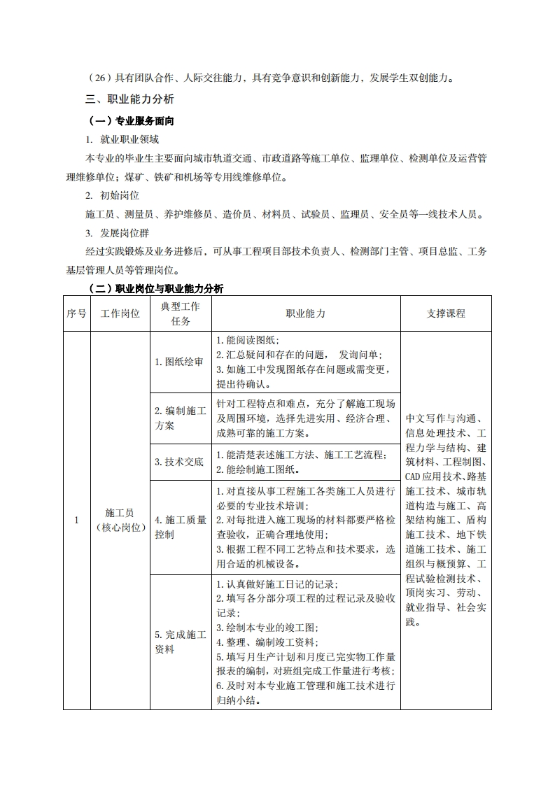 高等职业技术教育《城市轨道交通工程技术》专业人才培养方案(普招三年制)专业代码:600605一、学制及招生对象(一)学制:三年。(二)招生对象:高中(中职)毕业生。(三)招生类型:文理兼收。二、培养目标与人才规格(一)培养目标本专业培养德、智、体、美、劳全面发展,具有较高综合素质、良好职业道德、创新精神和创业意识,掌握轨道工程构造、基本施工方法和工程管理等知识,具备城市轨道交通土建工程施工、检测、现场管理、监理与养护技能的能力,在城市轨道行业从事土建工程的生产、建设、服务和管理一线需要的高素质技术技能人才。(二)人才规格1.素质目标(1)思想政治素质:拥护党的基本路线,具有坚定正确的政治方向;掌握毛泽东思想和邓小平理论以及“三个代表”的重要思想和科学发展观;具有正确的世界观、人生观和价值观,具有良好的诚信品质、敬业精神、责任意识、团队意识和诚信意识,格守公民基本道德规范。(2)职业素质:具有良好的职业安全、环境保护意识、职业道德、创新精神、创业意识,能够立足生产、建设、管理、服务一线,踏实进取,敬业奉献,善于合作,敢于竞争,勇于创新。(3)人文科学素质:具有宽阔的视野、良好的科学思维品质、高雅的审美情趣和正确的审美观;能够正确认识社会、主动适应社会,有较强文字和语言表达能力,有较强的人际交往能力和自我发展能力。(4)身体心理索质:具有健康的身体,良好的生活习惯,有一定的运动基础。具有健康积极的人生态度,良好的个性心理品质,有较强的心理调适能力和抗挫折能力。2.知识目标(1)具有必须的公共英语听、说、读、写基本知识和职业英语知识:(2)具有必备的文化基础知识和人文社会科学知识;(3)具有信息处理技术的基本知识:(4)具有必须的线路工程、桥隧工程、轨道工程、沿线服务设施等基础知识:(5)具有工程制图与识图、计算机绘图软件、施工图纸识读的基本知识: