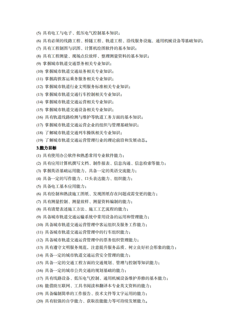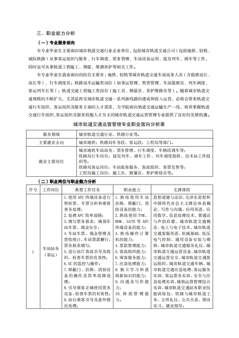 高等职业技术教育《城轨道交通运营管理》专业人才培养方案(普招三年制)专业代码:500606一、学制及招生对象(一)学制:三年。(二)招生对象:高中(中职)毕业生。(三)招生类型:文理兼收。二、培养目标与人才规格(一)培养目标本专业培养德、智、体、美、劳全面发展,具有较高综合素质、良好职业道德、创新精神和创业意识,掌握城市轨道基本行车组织和客运组织知识,以及票务、站务、乘务、行业文明服务标准及相关法律法规等专业知识,具备城市轨道交通的运营管理、安全管理等专业能力,在大中城市轨道交通运营管理企业从事轨道交通安全管理、调度指挥、车站值班、信号控制、站务、乘务及设备检修维护等工作的生产、建设、服务和管理第一线需要的高素质技术技能人才。(二)人才规格1.素质目标()思想政治素质:系统掌握马克思主义基本原理和马克思主义中国化理论成果,了解党史、新中国史、改革开放史、社会主义发展史,认识世情、国情、党情,深刻领会习近平新时代中国特色社会主义思想,培养运用马克思主义立场观点方法分析和解决问题的能力;自觉践行社会主义核心价值观,尊重和维护宪法法律权威,识大局、尊法治、修美德;矢志不渝听党话跟党走,争做社会主义合格建设者和可靠接班人。(②)职业素质:具有良好的职业安全、环境保护意识、职业道德、创新精神、创业意识,能够立足生产、建设、管理、服务一线,踏实进取,敬业奉献,善于合作,敢于竞争,勇于创新。(③)人文科学素质:具有宽阔的视野、良好的科学思维品质、高雅的审美情趣和正确的审美观:能够正确认识社会、主动适应社会,有较强文字和语言表达能力,有较强的人际交往能力和自我发展能力。(④身体心理素质:具有健康的身体,良好的生活习惯,爱好体育运动,有一定的运动基础。具有健康积极的人生态度,良好的个性心理品质,有较强的心理调适能力和抗挫折能力。2.知识目标(1)具有必须的公共英语听、说、读、写基本知识和职业英语知识;(②)具有必备的文化基础知识和人文社会科学知识:(③)具有工程制图与识图、计算机辅助设计软件基本操作知识:(④具有常用办公软件、工程计算软件和互联网的应用知识: