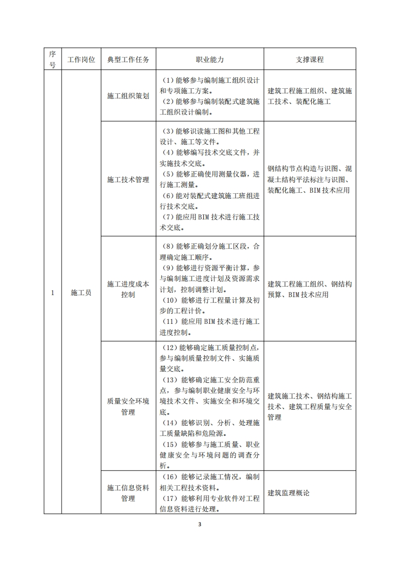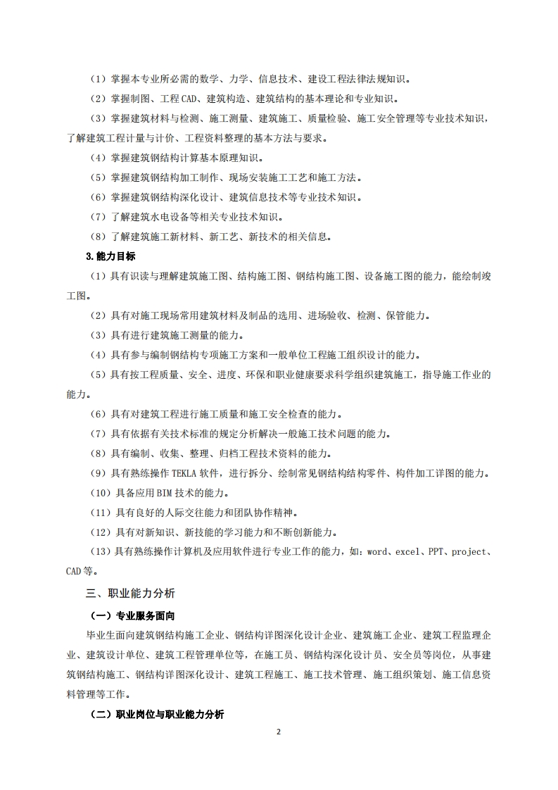 高等职业技术教育《建筑工程技术》专业人才培养方案(普招三年制)(建筑钢结构工程施工技术方向)专业代码:540301一、学制及招生对象(一)学制:三年。(二)招生对象:高中(中职)毕业生。(三)招生类型:理科。二、培养目标与人才规格(一)培养目标本专业培养德、智、体、美全面发展,具有较高综合素质、良好职业道德、创新精神和创业意识,掌握建筑材料及钢结构材料、识图、测量、施工工艺、项目管理等专业知识,具备识图、钢结构深化设计、施工测量、工程技术文件编制及施工现场管理能力,在钢结构施工企业、建筑工程施工、工程管理等企业,从事钢结构详图深化设计、施工组织策划、施工技术管理、施工进度成本控制、施工信息资料管理、作业安全管理、安全资料管理等工作的生产、建设、服务和管理第一线需要的高素质技术技能人才。(二)人才规格1.素质目标(1)思想政治素质:拥护党的基本路线,具有坚定正确的政治方向:掌握毛泽东思想和邓小平理论以及“三个代表”的重要思想和科学发展观:具有正确的世界观、人生观和价值观,具有良好的诚信品质、敬业精神、责任意识、团队意识和诚信意识,恪守公民基本道德规范。(2)职业素质:具有良好的职业安全、环境保护意识、职业道德、创新精神、创业意识,能够立足生产、建设、管理、服务一线,踏实进取,散业奉献,善于合作,敢于竞争,勇于创新。(3)人文科学素质:具有宽阔的视野、良好的科学思维品质、高雅的审美情趣和正确的审美观:能够正确认识社会、主动适应社会,有较强文字和语言表达能力,有较强的人际交往能力和自我发展能力。(4)身体心理素质:具有健康的身体,良好的生活习惯,爱好体育运动,有一定的运动基础。具有健康积极的人生态度,良好的个性心理品质,有较强的心理调适能力和抗挫折能力。2.知识目标