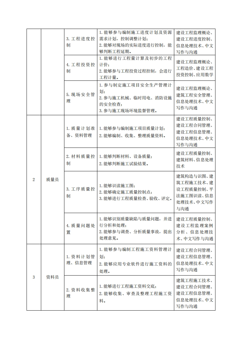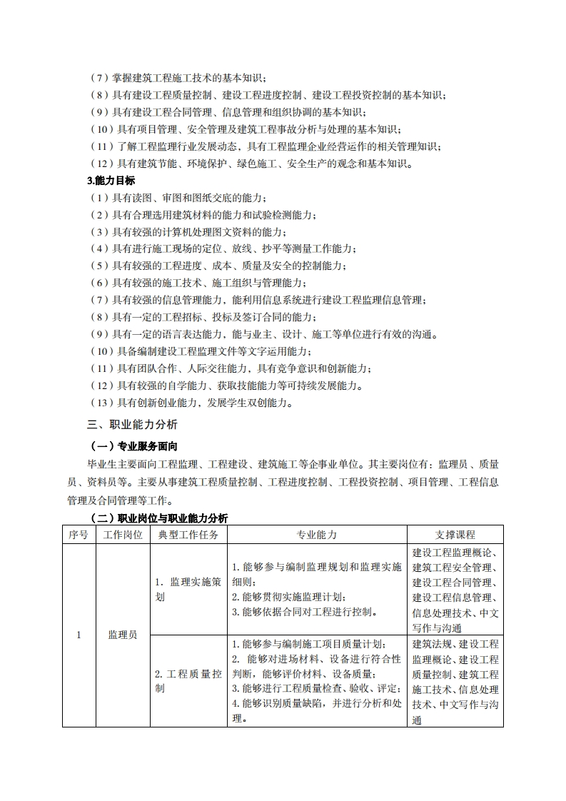 高等职业技术教育《建设工程监理》专业人才培养方案(普招三年制)专业代码:540505一、学制及招生对象(一)学制:三年。(二)招生对象:高中(中职)毕业生。(三)招生类型:理科。二、培养目标与人才规格(一)培养目标本专业培养德、智、体、美、劳全面发展,具有较高综合素质、良好职业道德、创新精神和创业意识,掌握建设法规、工程技术、工程监理等知识,具备建设工程现场规划、管理、控制及协调、资料档案管理的能力,面向工程监理及相关单位,在监理员、质量员、资料员等岗位,从事建筑工程质量控制、工程进度控制、工程投资控制、合同管理和信息管理等工作的生产、建设、服务和管理第一线需要的高素质技术技能人才。(二)人才规格1素质目标(1)思想政治素质:拥护党的基本路线,具有坚定正确的政治方向:掌握毛泽东思想和邓小平理论以及“三个代表”的重要思想和科学发展观;具有正确的世界观、人生观和价值观,具有良好的诚信品质、敬业精神、责任意识、团队意识和诚信意识,恪守公民基本道德规范。(2)职业索质:具有良好的职业安全、环境保护意识、职业道德,能够立足生产、建设、管理、服务一线,踏实进取,敬业奉献,善于合作,敢于竞争,勇于创新。(3)人文科学素质:具有宽阔的视野、良好的科学思维品质、高雅的审美情趣和正确的审美观:能够正确认识社会、主动适应社会,有较强文字和语言表达能力,有较强的人际交往能力和自我发展能力。(4)身体心理素质:具有健康的身体,良好的生活习惯,爱好体育运动,有一定的运动基础。具有健康积极的人生态度,良好的个性心理品质,有较强的心理调适能力和抗挫折能力。2.知识目标(1)具有必须的公共英语听、说、读、写基本知识和职业英语知识:(2)具有必备的文化基础知识和人文社会科学知识:(3)具有计算机应用的基本知识:(4)具有建筑材料、建筑力学、建筑结构、建筑构造、建筑法规等的基础知识:(5)具有建筑工程制图与识图的基本知识:(6)具有工程测量的基本知识: