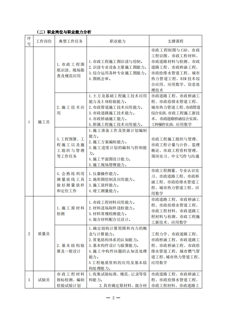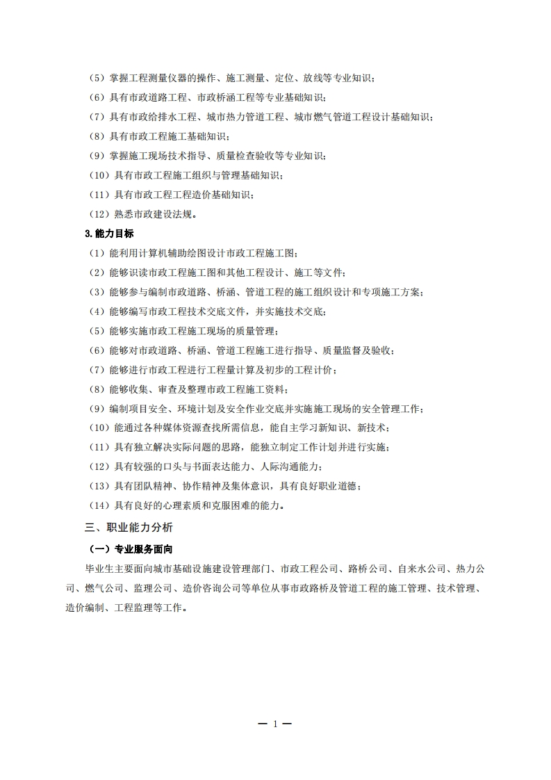 高等职业技术教育《市政工程技术》专业人才培养方案(普招三年制)专业代码:540601一、学制及招生对象(一)学制:三年。(二)招生对象:高中(中职)毕业生。(三)招生类型:理科。二、培养目标与人才规格(一)培养目标本专业培养德、智、体全面发展,具有较高综合素质、良好职业道德、创新精神和创业意识,掌握市政工程技术的基本理论知识,具备市政管道、市政道路、桥梁施工与技术管理等方面职业能力:在市政行业企业从事组织施工、技术管理、市政设施维护等工作的生产、建设、服务和管理第一线需要的高素质技术技能型人才。(二)人才规格1.素质目标(1)思想政治素质:拥护党的基本路线,具有坚定正确的政治方向:掌握毛泽东思想和邓小平理论以及“三个代表”的重要思想和科学发展观:具有正确的世界观、人生观和价值观,具有良好的诚信品质、敬业精神、责任意识、团队意识和诚信意识,恪守公民基本道德规范。(2)职业素质:具有良好的职业安全、环境保护意识、职业道德、创新精神、创业意识,能够立足生产、建设、管理、服务一线,踏实进取,敬业奉献,善于合作,敢于竞争,勇于创新。(3)人文科学素质:具有宽阔的视野、良好的科学思维品质、高雅的审美情趣和正确的审美观:能够正确认识社会、主动适应社会,有较强文字和语言表达能力,有较强的人际交往能力和自我发展能力。(4)身体心理素质:具有健康的身体,良好的生活习惯,爱好体育运动,有一定的运动基础。具有健康积极的人生态度,良好的个性心理品质,有较强的心理调适能力和抗挫折能力。2.知识目标(1)具有高职毕业生必备的数学、应用文写作、英语、体育运动和计算机应用的基础知识:(2)领会毛泽东思想和中国特色社会主义理论基本原理,具有思想道德修养与法律基础知识,掌握辩证唯物主义的思想方法:(3)具有市政工程制图及计算机辅助设计的基础知识:(4)掌握市政工程常用的建筑材料及试验检测等专业知识: