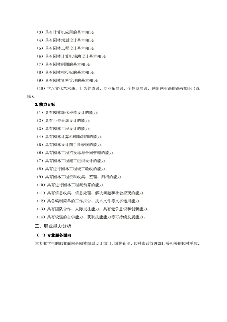 高等职业技术教育《风景园林设计》专业人才培养方案(普招三年制)专业代码:540105一、学制及招生对象(一)学制:三年。(二)招生对象:高中(中职)毕业生。(三)招生类型:文理兼收。二、培养目标与人才规格(一)培养目标本专业培养德、智、体全面发展,具有较高综合素质、良好职业道德、创新精神和创业意识,掌握园林规划设计、园林植物景观设计、计算机辅助设计等基本知识,具备园林绿地规划设计与表现能力、园林工程设计与施工能力、园林园林植物景观设计能力,能在园林企业园林规划设计部门、园林工程施工管理部门、园林市政管理部门等相关单位第一线,从事园林规划设计、园林制图、园林招投标、园林资料管理、园林工程造价、园林工程施工与养护管理等工作的生产、建设、服务和管理的第一线需要高素质技术技能人才。(二)人才规格1.素质目标(1)思想政治素质:拥护党的基本路线,具有坚定正确的政治方向:掌握毛泽东思想和邓小平理论以及“三个代表”的重要思想和科学发展观:具有正确的世界观、人生观和价值观,具有良好的诚信品质、敬业精神、责任意识、团队意识和诚信意识,恪守公民基本道德规范。(2)职业素质:具有良好的职业安全、环境保护意识、职业道德,能够立足生产、建设、管理、服务一线,踏实进取,敬业奉献,善于合作,敢于竞争,勇于创新。(3)人文科学素质:具有宽阔的视野、良好的科学思维品质、高雅的审美情趣和正确的审美观:能够正确认识社会、主动适应社会,有较强文字和语言表达能力,有较强的人际交往能力和自我发展能力。(4)身体心理素质:具有健康的身体,良好的生活习惯,爱好体育运动,有一定的运动基础。具有健康积极的人生态度,良好的个性心理品质,有较强的心理调适能力和抗挫折能力。2.知识目标(1)具有必须的公共英语听、说、读、写基本知识和职业英语知识:(2)具有必备的文化基础知识和人文社会科学知识: