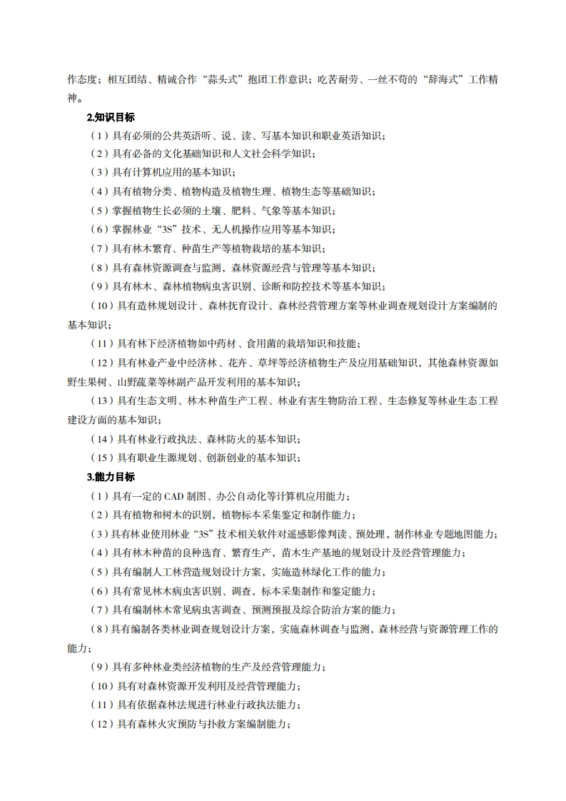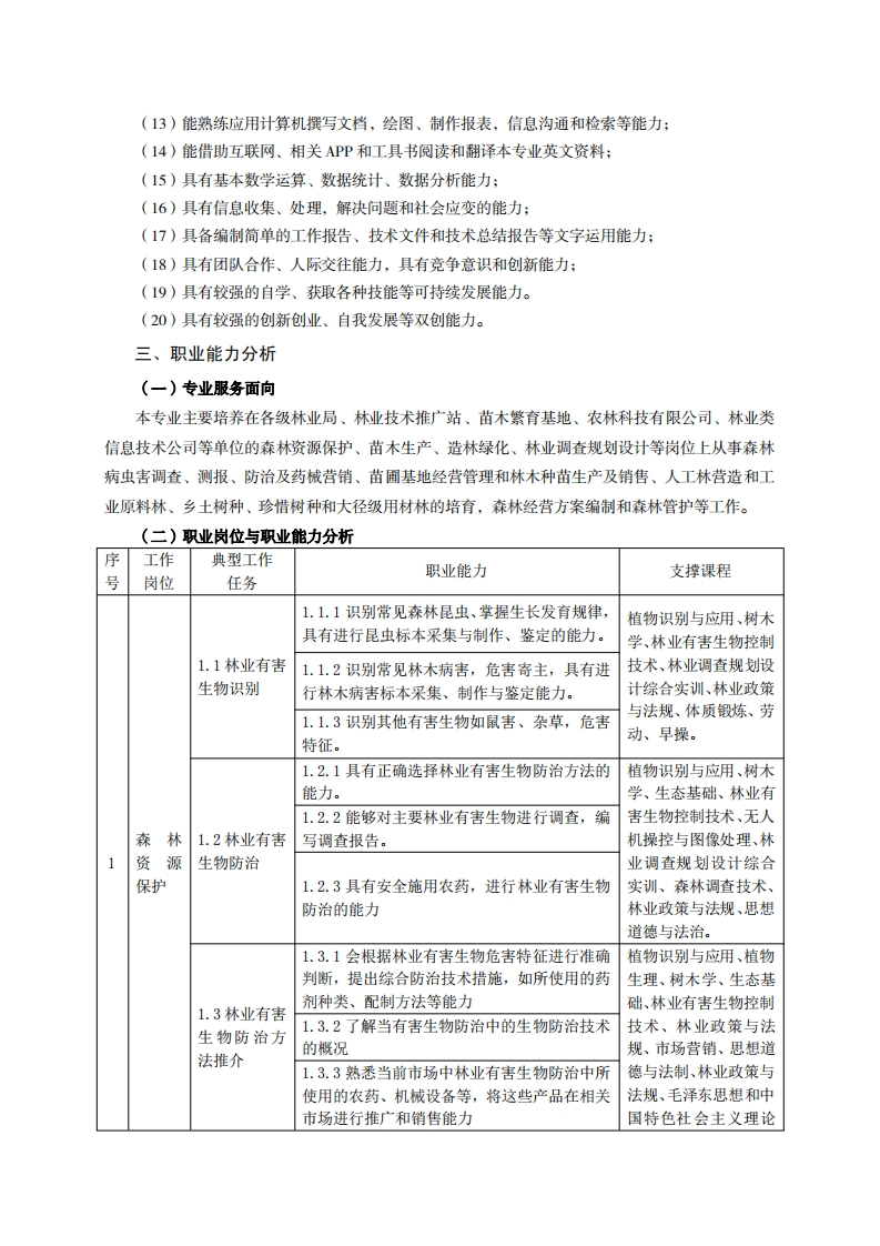 高等职业技术教育《林业技术》专业人才培养方案(普招三年制)专业代码:410201一、学制及招生对象(一)学制:三年。(二)招生对象:高中(中职)毕业生。(三)招生类型:文理兼收。二、培养目标与人才规格(一)培养目标本专业培养德、智、体、美、劳全面发展,具有较高综合素质、良好职业道德、创新精神和创业意识,掌握植物和树木、生态学、种苗繁育、森林资源调查、森林营造、森林资源经营、森林资源管理、林业有害生物控制、林业政策与法规等知识,具备林木种苗生产经营管理、各类人工林营造、林业有害生物控制、林业调查规划设计、森林资源开发管理、生态工程建设等能力。在各级林业局、林业站、生态林场、苗木繁育基地、农林科技公司、农林信息科技公司等单位,从事林木种苗生产经营管理、林木良种选育、造林绿化、林木病虫害防治、各类森林和草业资源调查与监测评估、森林资源管理与管护、森林资源综合利用、林业生态工程建设与生态修复工程建设等工作的生产、建设、服务和管理第一线需要的高素质技术技能人才。(二)人才规格1.素质目标(1)思想政治素质:系统掌握马克思主义基本原理和马克思主义中国化理论成果,了解党史、新中国史、改革开放史、社会主义发展史,认识世情、国情、党情,深刻领会习近平新时代中国特色社会主义思想,培养运用马克思主义立场观点方法分析和解决问题的能力;自觉践行社会主义核心价值观,尊重和维护宪法法律权威,识大局、尊法治、修美德;矢志不渝听党话跟党走,争做社会主义合格建设者和可靠接班人。(2)职业素质:具有良好的职业安全、环境保护意识、职业道德、创新精神、创业意识,能够立足生产、建设、管理、服务一线,踏实进取,敬业奉献,善于合作,敢于竞争,勇于创新。(3)人文科学素质:具有宽阔的视野、良好的科学思维品质、高雅的审美情趣和正确的审美观:能够正确认识社会、主动适应社会,有较强文字和语言表达能力,有较强的人际交往能力和自我发展能力。(4)身体心理索质:具有健康的身体,良好的生活习惯,爱好体育运动,有一定的运动基础。具有健康积极的人生态度,良好的个性心理品质,有较强的心理调适能力和抗挫折能力。(5)具有爱学校、爱专业、爱老师的“爱国主义”情怀;科学求实、精益求精的“工匠式”工