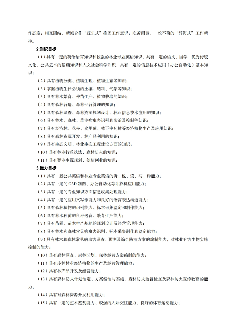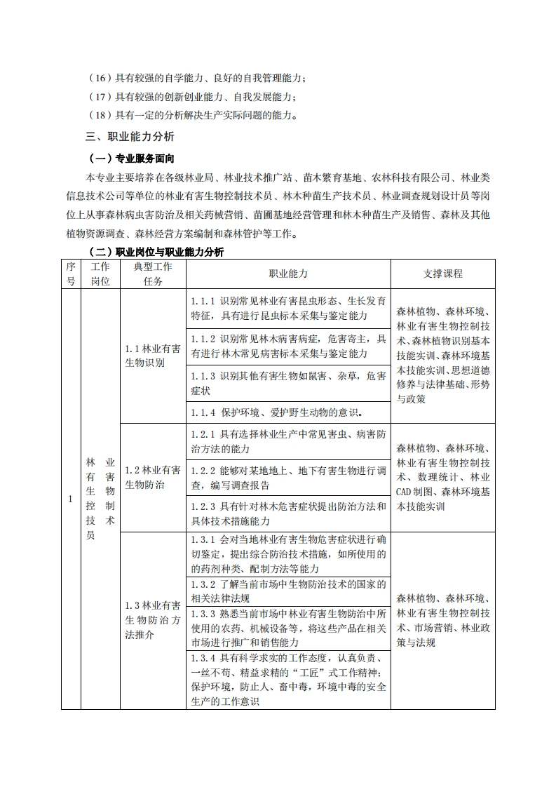 高等职业技术教育《林业技术》专业人才培养方案(普招三年制)专业代码:510201一、学制及招生对象(一)学制:三年(二)招生对象:高中(中职)毕业生(三)招生类型:文理兼收。二、培养目标与人才规格(一)培养目标本专业培养德、智、体、美、劳全面发展,具有较高综合素质、良好职业道德、创新精神和创业意识,掌握森林植物、森林生态、种苗繁育、林业调查规划设计、森林营造、森林资源经营与管理、森林有害生物控制等知识,具备林木种苗生产经营管理、各类人工林营造、林业有害生物控制、林业调查规划设计、森林资源开发管理、生态工程建设等能力。能够在林业生产单位、林业局、林业站、林场、苗木繁育基地、农林科技公司、农林信息科技公司等单位,从事林木种苗生产经营管理、林木良种选育、造林绿化、林木病虫害防治、各类森林和草业资源调查与监测评估、森林资源管理与管护、森林资源开发利用、林业生态工程建设等工作的生产、建设、服务和管理第一线需要的高素质技术技能人才。(二)人才规格1素质目标(1)思想政治素质:拥护党的基本路线,具有坚定正确的政治方向:掌握毛泽东思想和邓小平理论以及“三个代表”的重要思想和科学发展观:具有正确的世界观、人生观和价值观,具有良好的诚信品质、敬业精神、责任意识、团队意识和诚信意识,格守公民基本道德规范。(2)职业素质:具有安全生产意识、环境保护意识和良好的职业道德。能够遵纪守法,有良好的行为规范和社会诚信,具有较强的创新精神、创业意识,能够立足林业行业生产、建设、管理、服务一线,踏实进取,敬业奉献,吃苦耐劳,善于合作,敢于竞争,勇于创新。(3)人文科学素质:具有开阔的视野、良好的科学思维品质、高雅的审美情趣和正确的审美观,能够正确认识社会、主动适应社会,善于发现问题和解决问题,有较强的文字和语言表达能力、人际交往能力和自我发展能力。(4)身体心理素质:具有健康的身体,爱好体育运动;具有健康积极的人生态度和良好的个性心理品质,具有较强的心理调适能力和抗挫折能力:具有良好的生活习惯、卫生习惯、文明意识和礼仪行为,具有正确的劳动观念。(5)具有爱学校、爱专业、爱老师的“爱国主义”情怀;科学求实、精益求精的“工匠式”工