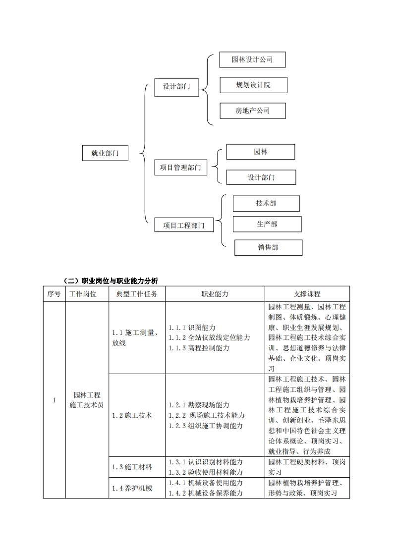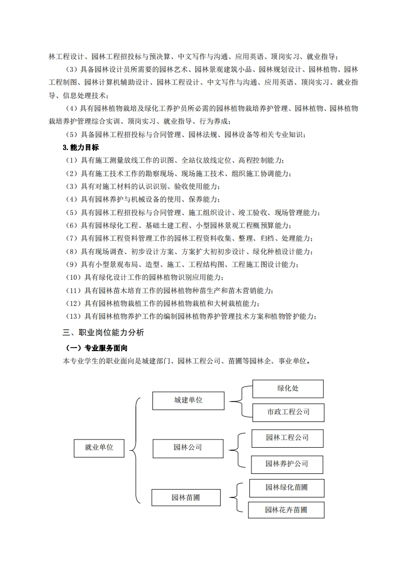 高等职业技术教育《园林工程技术》专业人才培养方案(普招三年制)专业代码:540106一、学制及招生对象(一)学制:三年。(二)招生对象:高中(中职)毕业生。(三)招生类型:文理兼收。二、培养目标与人才规格(一)培养目标本专业培养德、智、体等方面全面发展,具有较高综合素质、良好职业道德、创新精神和创业意识,掌握园林工程施工技术、园林植物栽培与养护管理、园林预算与资料管理、园林施工组织管理、园林规划设计、园林工程设计、园林机械等知识,具备园林工程施工、园林植物栽培与养护管理、预算与资料管理等能力,在城建部门、园林工程公司、厂矿企业、物业及房地产企业等从事园林工程施工、园林工程管理、园林规划与工程设计、园林植物栽培与养护等方面工作的生产、建设、服务和管理第一线需要的高素质技术技能人才。(二)人才规格1.素质目标(1)思想政治素质:拥护党的基本路线,具有坚定正确的政治方向:掌握毛泽东思想和邓小平理论以及“三个代表”的重要思想和科学发展观:具有正确的世界观、人生观和价值观,具有良好的诚信品质、敬业精神、责任意识、团队意识和诚信意识,格守公民基本道德规范。(2)职业素质:具有良好的职业安全、环境保护意识、职业道德,能够立足生产、建设、管理、服务一线,踏实进取,散业奉献,善于合作,敢于竞争,勇于创新。(3)人文科学素质:具有宽阔的视野、良好的科学思维品质、高雅的审美情趣和正确的审美观:能够正确认识社会、主动适应社会,有较强文字和语言表达能力,有较强的人际交往能力和自我发展能力。(4)身体心理素质:具有健康的身体,良好的生活习惯,爱好体育运动,有一定的运动基础。具有健康积极的人生态度,良好的个性心理品质,有较强的心理调适能力和抗挫折能力。2.知识目标(1)具备园林工程施工技术人员必备的专业知识,包括园林工程测量、园林工程制图、体质锻炼、心理健康、职业生涯发展规划、园林工程硬质材料、园林工程施工技术、思想道德修养与法律基础、企业文化、顶岗实习、园林植物栽培养护管理、创新创业、毛泽东思想和中国特色社会主义理论体系概论、就业指导:(2)具备园林工程资料管理预算员所需要的园林工程施工组织与管理、园林工程施工技术、园