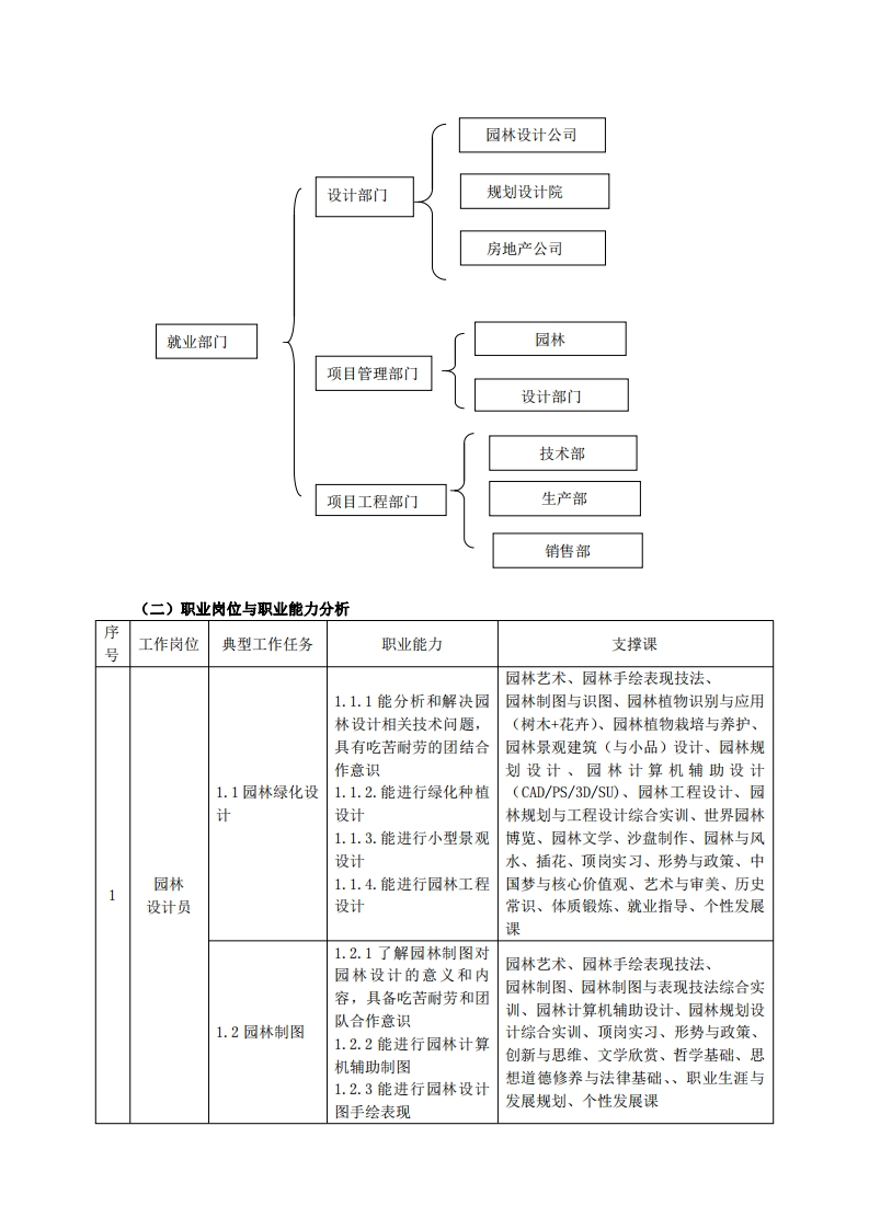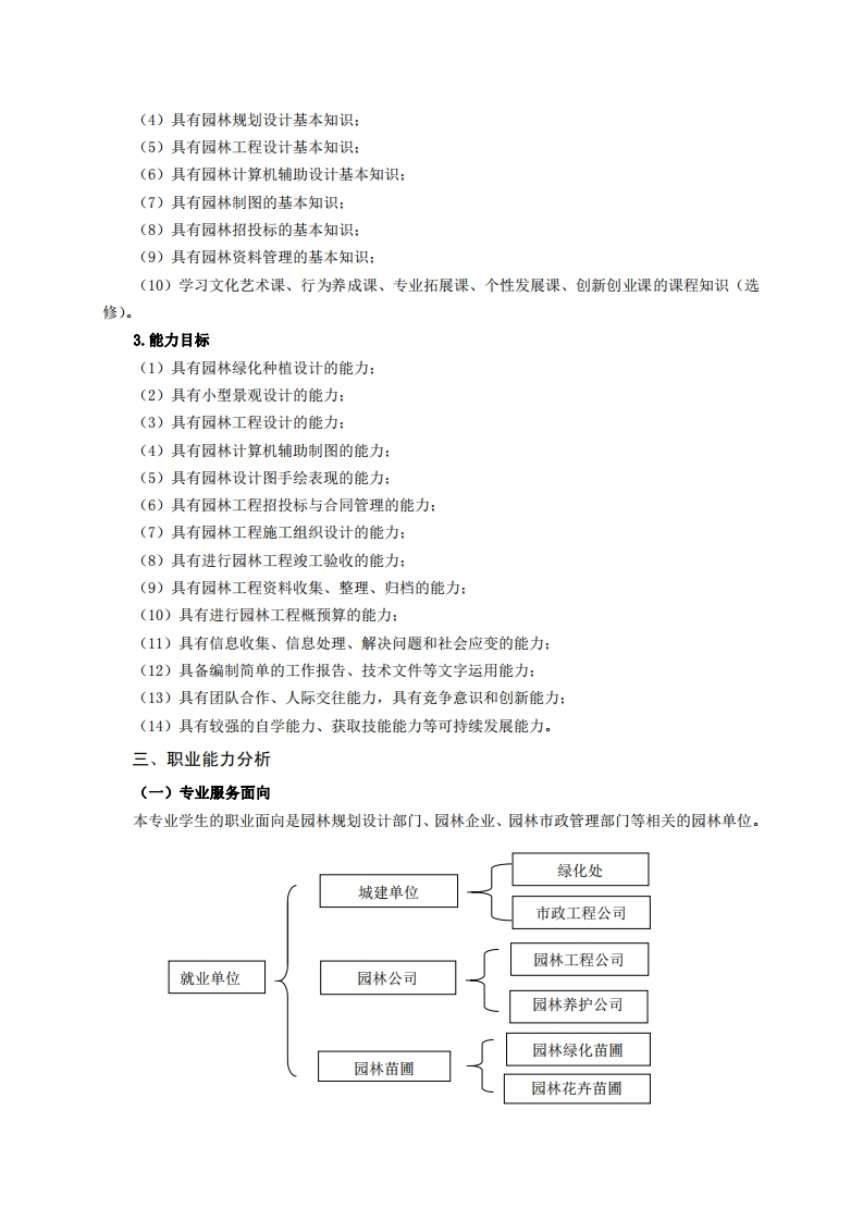 高等职业技术教育《园林工程技术》专业人才培养方案(普招三年制)(园林规划设计方向)专业代码:540106一、学制及招生对象(一)学制:三年。(二)招生对象:高中(中职)毕业生。(三)招生类型:文理兼收。二、培养目标与人才规格(一)培养目标本专业培养德、智、体全面发展,具有较高综合素质、良好职业道德、创新精神和创业意识,掌握园林规划设计、园林工程设计、园林工程管理等基本知识,具备园林绿地规划设计与表现能力园林工程设计与施工能力、园林工程管理能力,能在园林企业园林规划设计部门、园林工程施工管理部门、园林市政管理部门等相关单位第一线,从事园林设计、园林招投标、园林资料管理、园林工程造价、园林工程施工与养护管理等工作的生产、建设、服务和管理的第一线需要高素质技术技能人才。(二)人才规格1.素质目标(1)思想政治素质:拥护党的基本路线,具有坚定正确的政治方向:掌握毛泽东思想和邓小平理论以及“三个代表”的重要思想和科学发展观:具有正确的世界观、人生观和价值观,具有良好的诚信品质、敬业精神、责任意识、团队意识和诚信意识,恪守公民基本道德规范。(2)职业素质:具有良好的职业安全、环境保护意识、职业道德,能够立足生产、建设、管理、服务一线,踏实进取,敬业奉献,善于合作,敢于竞争,勇于创新。(3)人文科学素质:具有宽阔的视野、良好的科学思维品质、高雅的审美情趣和正确的审美观:能够正确认识社会、主动适应社会,有较强文字和语言表达能力,有较强的人际交往能力和自我发展能力。(4)身体心理素质:具有健康的身体,良好的生活习惯,爱好体育运动,有一定的运动基础。具有健康积极的人生态度,良好的个性心理品质,有较强的心理调适能力和抗挫折能力。2.知识目标(1)具有必须的公共英语听、说、读、写基本知识和职业英语知识:(2)具有必备的文化基础知识和人文社会科学知识:(3)具有计算机应用的基本知识: