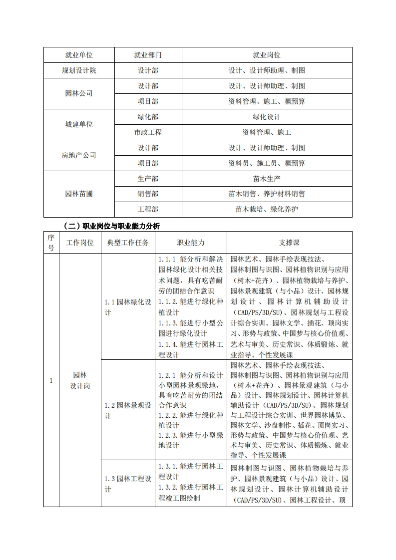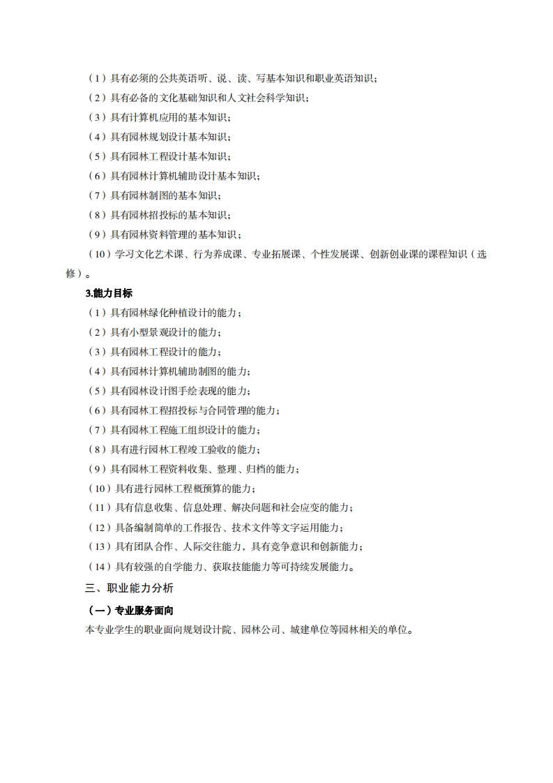 高等职业技术教育《园林工程技术》专业人才培养方案(普招三年制)(园林规划设计方向)专业代码:540106一、学制及招生对象(一)学制:三年。(二)招生对象:高中(中职)毕业生。(三)招生类型:文理兼收。二、培养目标与人才规格(一)培养目标本专业培养德、智、体、美、劳全面发展,具有较高综合素质、良好职业道德、创新精神和创业意识,掌握园林规划设计、园林工程设计、园林工程管理等基本知识,具备园林绿地规划设计与表现能力、园林工程设计与施工能力、园林工程管理能力,能在园林企业园林规划设计部门、园林工程施工管理部门、园林市政管理部门等相关单位第一线,从事园林设计、园林招投标、园林资料管理、园林工程造价、园林工程施工与养护管理等工作的生产、建设、服务和管理的第一线需要高素质技术技能人才。(二)人才规格1.素质目标(1)思想政治素质:拥护党的基本路线,具有坚定正确的政治方向;掌握毛泽东思想和邓小平理论以及“三个代表”的重要思想和科学发展观;具有正确的世界观、人生观和价值观,具有良好的诚信品质、敬业精神、责任意识、团队意识和诚信意识,恪守公民基本道德规范。(2)职业素质:具有良好的职业安全、环境保护意识、职业道德,能够立足生产、建设、管理、服务一线,踏实进取,敬业奉献,善于合作,敢于竞争,勇于创新。(3)人文科学素质:具有宽阔的视野、良好的科学思维品质、高雅的审美情趣和正确的审美观:能够正确认识社会、主动适应社会,有较强文字和语言表达能力,有较强的人际交往能力和自我发展能力。(4)身体心理素质:具有健康的身体,良好的生活习惯,爱好体育运动,有一定的运动基础。具有健康积极的人生态度,良好的个性心理品质,有较强的心理调适能力和抗挫折能力。2.知识目标