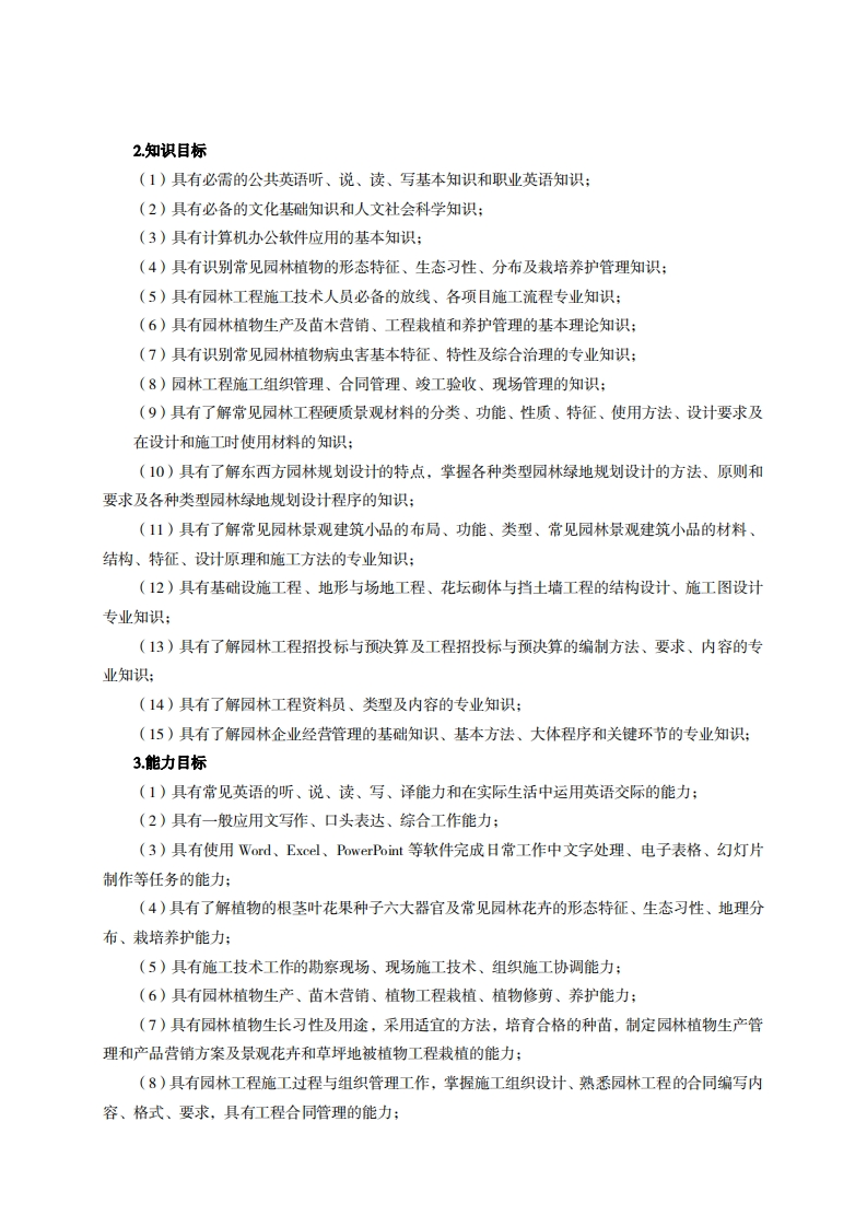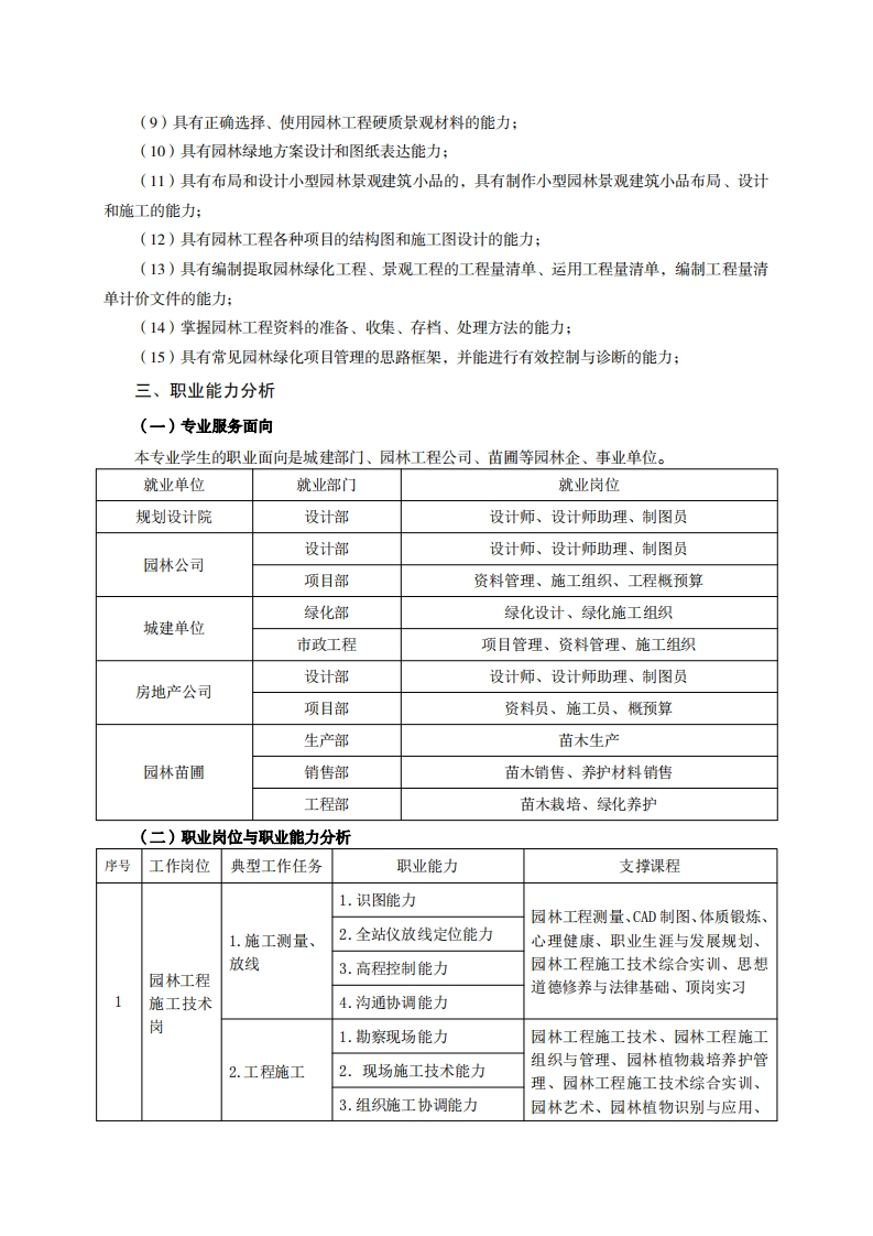 高等职业技术教育《园林工程技术》专业人才培养方案(普招三年制)专业代码:440104一、学制及招生对象(一)学制:三年。(二)招生对象:高中(中职)毕业生。(三)招生类型:文理兼收。二、培养目标与人才规格(一)培养目标本专业培养德、智、体、美、劳全面发展,具有较高综合素质、良好职业道德、创新精神和创业意识,掌握生态学、园林花卉识别与应用、植物识别与应用、园林植物栽培与养护管理、园林植物病虫害防治、园林工程施工技术、园林施工组织管理、园林预算与资料管理、园林工硬质景观材料、园林工程设计、园林规划设计等知识,具备园林工程专业必备的理论基础和创新创业能力,适应各类园林绿地设计、施工、预决算以及园林植物栽培、养护、应用以及管理等现代园林工程第一线的能力。在城建部门、园林工程公司、厂矿企业、物业及房地产企业等从事园林工程施工、园林工程项目管理、园林植物栽培与养护、园林规划与工程设计等方面工作的生产、建设、服务和管理第一线需要的高素质技术技能人才。(二)人才规格1素质目标(1)思想政治素质:系统掌握马克思主义基本原理和马克思主义中国化理论成果,了解党史」新中国史、改革开放史、社会主义发展史,认识世情、国情、党情,深刻领会习近平新时代中国特色社会主义思想,培养运用马克思主义立场观点方法分析和解决问题的能力:自觉践行社会主义核心价值观,尊重和维护宪法法律权威,识大局、尊法治、修美德;矢志不渝听党话跟党走,争做社会主义合格建设者和可靠接班人。(2)职业素质:具有良好的职业安全、环境保护意识、职业道德、创新精神、创业意识,能够立足生产、建设、管理、服务一线,踏实进取,敬业奉献,善于合作,敢于竞争,勇于创新。(3)人文科学素质:具有宽阔的视野、良好的科学思维品质、高雅的审美情趣和正确的审美观:能够正确认识社会、主动适应社会,有较强文字和语言表达能力,有较强的人际交往能力和自我发展能力。(4)身体心理索质:具有健康的身体,良好的生活习惯,爱好体育运动,有一定的运动基础。具有健康积极的人生态度,良好的个性心理品质,有较强的心理调适能力和抗挫折能力。