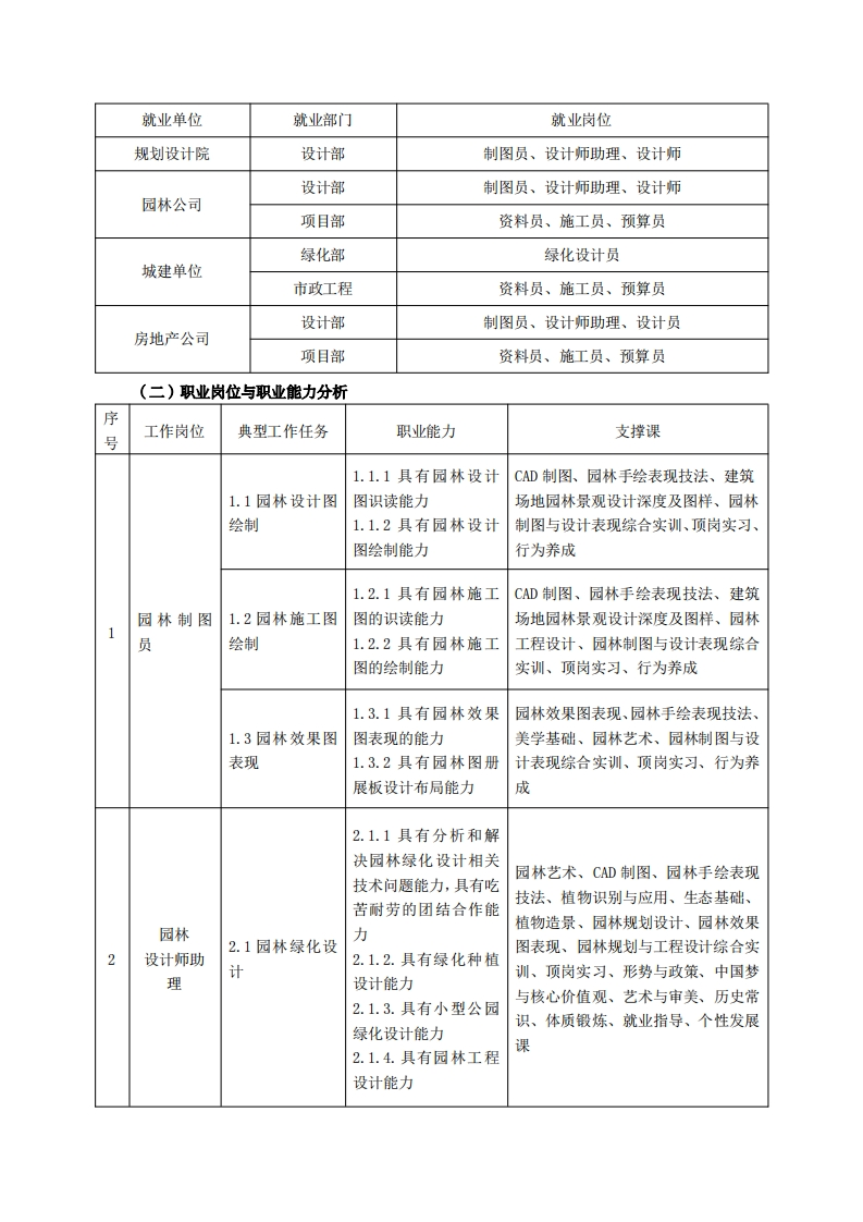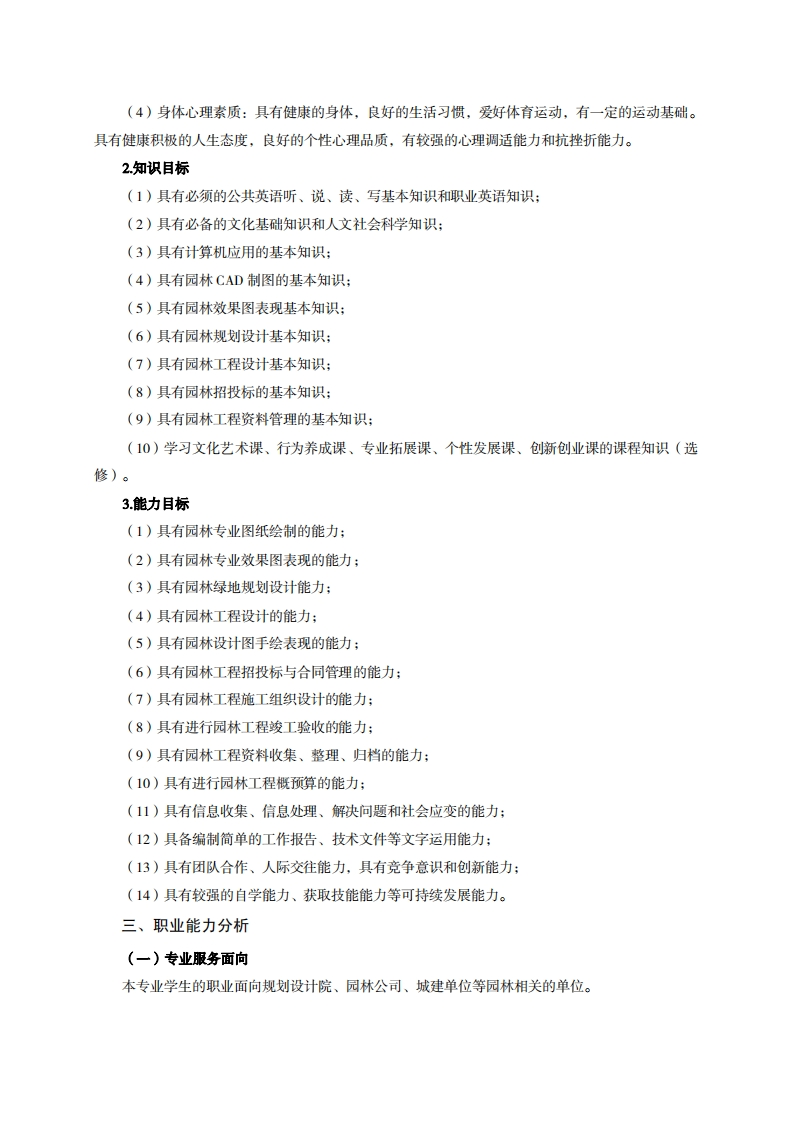 高等职业技术教育《园林工程技术》专业人才培养方案(普招三年制)(园林规划设计方向)专业代码:440104-1一、学制及招生对象(一)学制:三年。(二)招生对象:高中(中职)毕业生。(三)招生类型:文理兼收。二、培养目标与人才规格(一)培养目标本专业培养德、智、体、美、劳全面发展,具有较高综合素质、良好职业道德、创新精神和创业意识,掌握CAD制图、园林效果图表现、园林规划设计、园林工程设计、园林工程招投标与概预算、园林工程资料管理等基本知识,具备园林规划设计图与园林工程施工图绘制和效果图表现能力、园林绿地规划设计和施工图设计能力、园林工程资料管理能力,能在园林规划设计部门、园林工程施工管理部门、园林市政管理部门等相关单位第一线,从事园林相关的工程制图、园林规划设计、园林施工图设计、园林工程项目管理等工作的生产、建设、服务和管理的第一线需要的高素质技术技能人才。(二)人才规格1素质目标(1)思想政治素质:系统掌握马克思主义基本原理和马克思主义中国化理论成果,了解党史、新中国史、改革开放史、社会主义发展史,认识世情、国情、党情,深刻领会习近平新时代中国特色社会主义思想,培养运用马克思主义立场观点方法分析和解决问题的能力:自觉践行社会主义核心价值观,尊重和维护宪法法律权威,识大局、尊法治、修美德;矢志不渝听党话跟党走,争做社会主义合格建设者和可靠接班人。(2)职业素质:具有良好的职业安全、环境保护意识、职业道德、创新精神、创业意识,能够立足生产、建设、管理、服务一线,踏实进取,敬业奉献,善于合作,敢于竞争,勇于创新。(3)人文科学素质:具有宽阔的视野、良好的科学思维品质、高雅的审美情趣和正确的审美观:能够正确认识社会、主动适应社会,有较强文字和语言表达能力,有较强的人际交往能力和自我发展能力。
