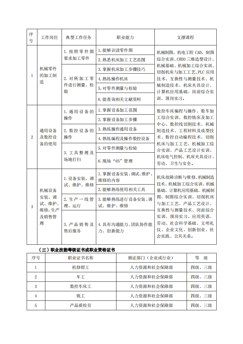 高等职业技术教育《机械制造与自动化》专业人才培养方案(普招三年制)专业代码:560102一、学制及招生对象(一)学制:三年。(二)招生对象:高中毕业生。(三)招生类型:理科。二、培养目标与人才规格(一)培养目标本专业培养德、智、体、美、劳全面发展,具有较高的综合素质、良好的职业道德、创新精神和创业意识,掌握计算机应用、机械工程材料、机械制图、机械基础、机械加工设备操作与维护、机械装配、机械设备维护修理等知识,具备计算机操作、机械零件测绘、机械零件设计与加工、电气控制、普通机床与数控机床操作、维护、调试、零件加工工艺规程编制、工装设计等能力,在机械加工企业、装备制造业、事业单位从事机械加工工艺规程编制,通用设备、数控设备的安装、使用、维护、营销工作的生产、服务和管理第一线需要的高素质技术技能人才。(二)人才规格1素质目标(1)思想政治素质:拥护党的基本路线,具有坚定正确的政治方向:掌握毛泽东思想和邓小平理论以及“三个代表”的重要思想和科学发展观;具有正确的世界观、人生观和价值观,具有良好的诚信品质、敬业精神、责任意识、团队意识和诚信意识,格守公民基本道德规范。(2)职业素质:具有良好的职业安全、环境保护意识、职业道德、创新精神、创业意识,能够立足生产、建设、管理、服务一线,踏实进取,敏业奉献,善于合作,敢于竞争,勇于创新。(3)人文科学素质:具有宽阔的视野、良好的科学思维品质、高雅的审美情趣和正确的审美观:能够正确认识社会、主动适应社会,有较强文字和语言表达能力,有较强的人际交往能力和自我发展能力。(4)身体心理素质:具有健康的身体,良好的生活习惯,爱好体育运动,有一定的运动基础。具有健康积极的人生态度,良好的个性心理品质,有较强的心理调适能力和抗挫折能力。2知识目标(1)具有必须的公共英语听、说、读、写基本知识和职业英语知识:(2)具有必备的文化基础知识和人文社会科学知识: