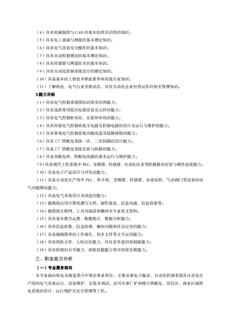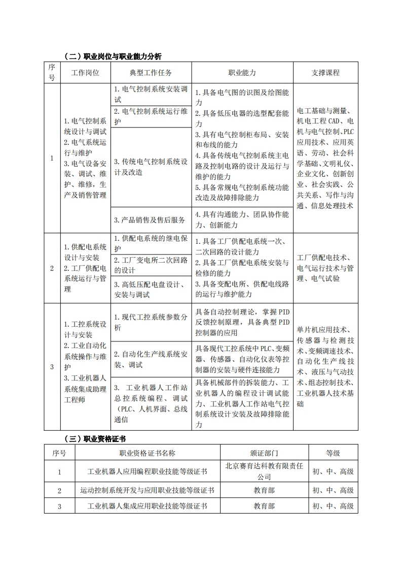 高等职业技术教育《电气自动化技术》专业人才培养方案(普招三年制)专业代码:460306一、学制及招生对象(一)学制:三年。(二)招生对象:高中(中职)毕业生。(三)招生类型:理科。二、培养目标与人才规格(一)培养目标本专业培养德、智、体、美、劳全面发展,具有较高综合素质、良好职业道德、创新精神和创业意识,掌握电气设备及自动化生产线所需的理论知识,具备电气设备运行管理、自动化生产线安装与检修、调试维护、产品销售和技术服务能力,在各大中型生产企业、供用电企业、厂矿企业、事业单位,从事电气设备选型配套、工业自动化控制、电气系统运行及生产、建设、服务和管理等一线需要的高素质技术技能人才。(二)人才规格1.素质目标(1)思想政治素质:系统掌握马克思主义基本原理和马克思主义中国化理论成果,了解党史、新中国史、改革开放史、社会主义发展史,认识世情、国情、党情,深刻领会习近平新时代中国特色社会主义思想,培养运用马克思主义立场观点方法分析和解决问题的能力:自觉践行社会主义核心价值观,尊重和维护宪法法律权威,识大局、尊法治、修美德:矢志不渝听党话跟党走,争做社会主义合格建设者和可靠接班人。(2)职业素质:具有良好的职业安全、环境保护意识、职业道德、创新精神、创业意识,能够立足生产、建设、管理、服务一线,踏实进取,敬业奉献,善于合作,敢于竞争,勇于创新。(3)人文科学素质:具有宽阔的视野、良好的科学思维品质、高雅的审美情趣和正确的审美观:能够正确认识社会、主动适应社会,有较强文字和语言表达能力,有较强的人际交往能力和自我发展能力。(4)身体心理素质:具有健康的身体,良好的生活习惯,爱好体育运动,有一定的运动基础。具有健康积极的人生态度,良好的个性心理品质,有较强的心理调适能力和抗挫折能力。2知识目标(1)具有必须的公共英语听、说、读、写基本知识和职业英语知识:(2)具有必备的文化基础知识和人文社会科学知识:(3)具有计算机应用的基本知识: