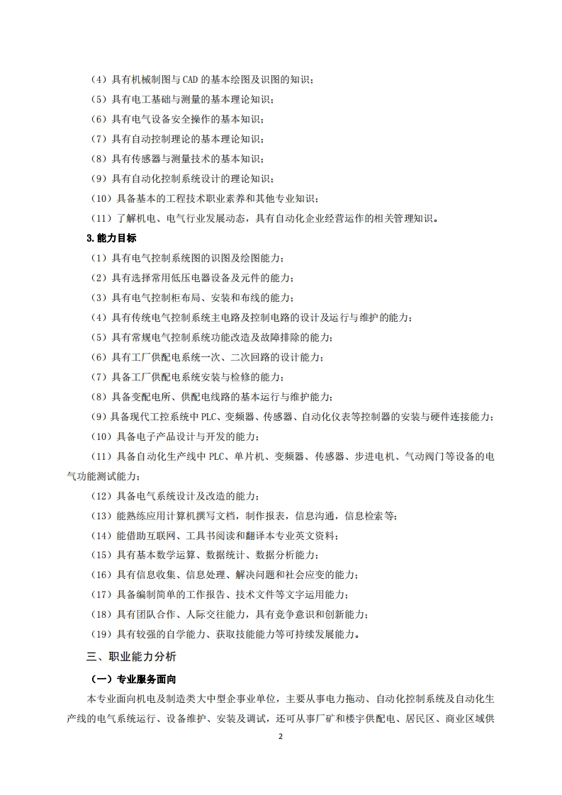 高等职业技术教育《电气自动化技术》专业人才培养方案(普招三年制)专业代码:560302一、学制及招生对象(一)学制:三年。(二)招生对象:高中(中职)毕业生。(三)招生类型:理科。二、培养目标与人才规格(一)培养目标本专业培养德、智、体全面发展,具有较高综合素质、良好职业道德、创新精神和创业意识,掌握电气设备及自动化生产线所需的理论知识,具备电气设备运行管理、自动化生产线安装与检修、调试维护、产品销售和技术服务能力,在各大中型生产企业、供用电企业、厂矿企业、事业单位,从事电气设备选型配套、工业自动化控制、电气系统运行及生产、建设、服务和管理等一线需要的高素质技术技能人才。(二)人才规格1.素质目标(1)思想政治素质:拥护党的基本路线,具有坚定正确的政治方向:掌握毛泽东思想和邓小平理论以及“三个代表”的重要思想和科学发展观:具有正确的世界观、人生观和价值观,具有良好的诚信品质、敬业精神、责任意识、团队意识和诚信意识,恪守公民基本道德规范。(2)职业素质:具有良好的职业安全、环境保护意识、职业道德、创新精神、创业意识,能够立足生产、建设、管理、服务一线,踏实进取,敬业奉献,善于合作,敢于竞争,勇于创新。(3)人文科学素质:具有宽阔的视野、良好的科学思维品质、高雅的审美情趣和正确的审美观:能够正确认识社会、主动适应社会,有较强文字和语言表达能力,有较强的人际交往能力和自我发展能力。(4)身体心理素质:具有健康的身体,良好的生活习惯,爱好体育运动,有一定的运动基础。具有健康积极的人生态度,良好的个性心理品质,有较强的心理调适能力和抗挫折能力。2.知识目标(1)具有必须的公共英语听、说、读、写基本知识和职业英语知识:(2)具有必备的文化基础知识和人文社会科学知识:(3)具有计算机应用的基本知识: