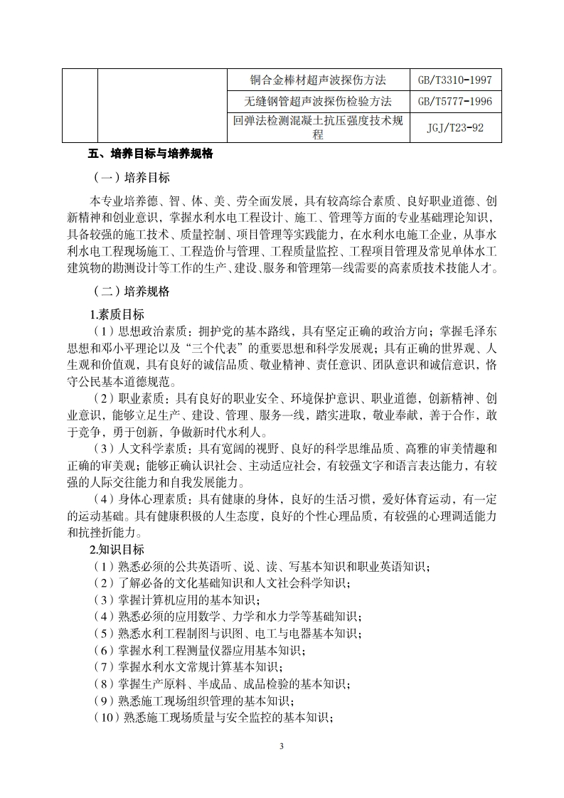 高等职业技术教育水利水电建筑工程专业人才培养方案一、专业名称及代码专业名称:水利水电建筑工程专业专业代码:450205二、入学要求普通高级中学毕业、中等职业学校毕业或具备同等学历三、修业年限三年四、职业面向所属专业所属对应行业主要职业大类专业类类别主要岗位群或技职业资格证书(代码)(代码)(代码)和职业技能等(代码)术领域举例级证书举例水利水电工程(国水利水电建际工程)施工现场筑工程技术技术管理人员水利水电工程施水工闸门运行水利工水利和水(2-02-18-1工现场测量工水利大类程与管运工程建3)水利水电工程施水工监测工(45)理类筑(482)水利工程管工现场质量监控工程测量员(4502)水利管理理工程技术水利水电工程施水利工程质量业(769)人员工现场安全监控检测员资格(2-02-21-0小型水利水电工3)程设计水利工程运行管理专业课程在教学过程中引入的教学标准举例序号课程名称引入行业标准名称标准编号水利水电工程制图标准基础制图SL73.1-20131工程制图及CAD水利水电工程制图标准水工建筑图SL73.2-2013混凝土强度检验评定标准GBT-50107-20102建筑材料水泥细度检验方法筛析法GB/T1345-2005