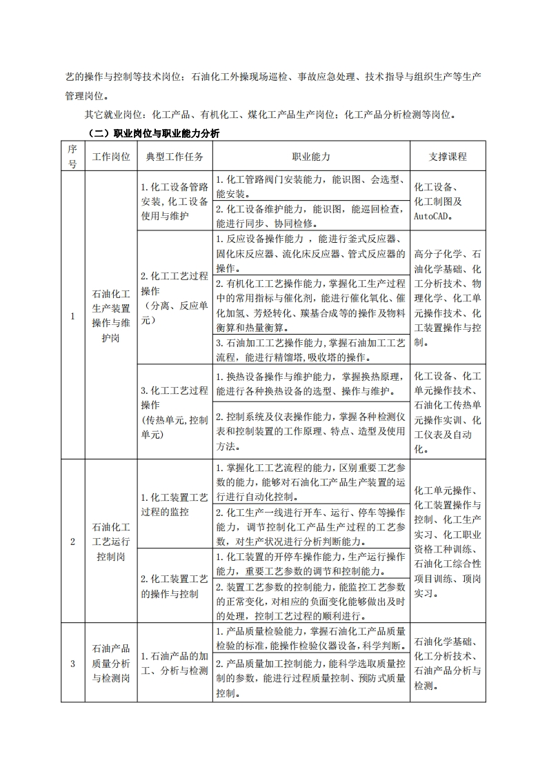 高等职业技术教育《石油化工技术》专业人才培养方案(普招三年制)专业代码:570203一、学制及招生对象(一)学制:三年。(二)招生对象:高中(中职)毕业生。(三)招生类型:文理兼收。二、培养目标与人才规格(一)培养目标本专业培养德、智、体、美、劳全面发展,具有较高综合素质、良好职业道德、创新精神和创业意识,掌握石油产品分析、石油化工设备维护和化工装置的操作和控制等相关知识,具备石油化工生产装置工艺操作与控制、石油产品分析、化工设备维护能力,在石油化工、石油炼制等相关企业或部门从事化工生产、工程建设、产品检测及技术服务和管理等一线需要的高素质技术技能人才。(二)人才规格1.素质目标(1)思想政治素质:拥护党的基本路线,具有坚定正确的政治方向:掌握毛泽东思想和邓小平理论以及“三个代表”的重要思想和科学发展观:具有正确的世界观、人生观和价值观,具有良好的诚信品质、敬业精神、责任意识、团队意识和诚信意识,格守公民基本道德规范。(2)职业素质:具有良好的职业安全、环境保护意识、职业道德、创新精神、创业意识,能够立足生产、建设、管理、服务一线,踏实进取,敬业奉献,善于合作,敢于竞争,勇于创新。(3)人文科学素质:具有宽阔的视野、良好的科学思维品质、高雅的审美情趣和正确的审美观:能够正确认识社会、主动适应社会,有较强文字和语言表达能力,有较强的人际交往能力和自我发展能力。(4)身体心理素质:具有健康的身体,良好的生活习惯,爱好体育运动,有一定的运动基础。具有健康积极的人生态度,良好的个性心理品质,有较强的心理调适能力和抗挫折能力。2.知识目标(1)具有公共英语听、说、读、写基本知识和职业英语知识:(2)具有文化基础知识和人文社会科学知识:(3)具有计算机应用的基本知识:(4)具有必须的分析化学、石油基础化学、物理化学等基础知识:(5)具有化工制图与识图、电工与电子基本知识: