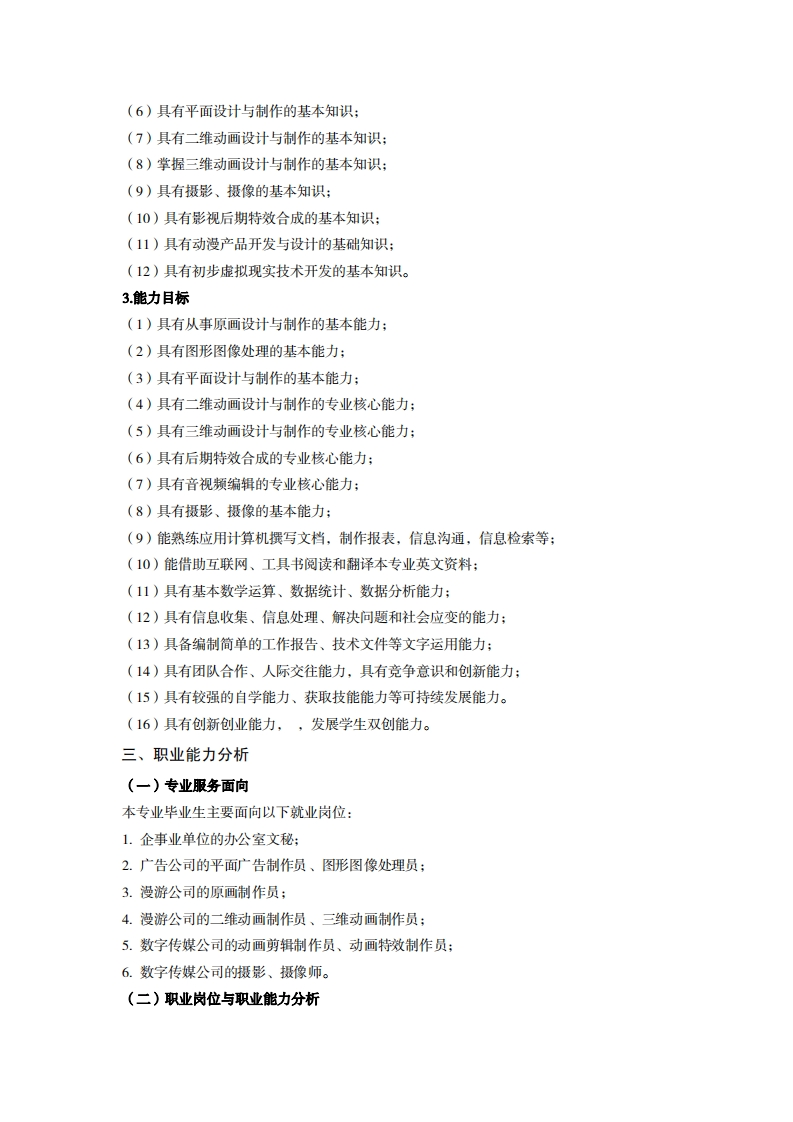 高等职业技术教育《动漫制作技术》专业人才培养方案(普招三年制)专业代码:610207一、学制及招生对象(一)学制:三年。(二)招生对象:高中(中职)毕业生。(三)招生类型:文理兼收。二、培养目标与人才规格(一)培养目标本专业培养德、智、体、美、劳全面发展,具有较高综合素质、良好职业道德、创新精神和创业意识,掌握原画、平面设计、图像处理、二维动画、三维动画、摄影、摄像、视频编辑知识,具备平面设计与制作、动画、动漫游戏制作、摄影、摄像、音视频特效制作的基本能力,在动漫、影视、出版、T服务和应用行业,从事动画设计与制作、广告设计与包装、图形图像处理、影视后期制作游戏开发等工作的生产、建设、服务和管理第一线需要的高素质技术技能人才。(二)人才规格1.素质目标(1)思想政治索质:拥护党的基本路线,具有坚定正确的政治方向:掌握毛泽东思想和邓小平理论以及“三个代表”的重要思想和科学发展观;具有正确的世界观、人生观和价值观,具有良好的诚信品质、敬业精神、责任意识、团队意识和诚信意识,格守公民基本道德规范。(2)职业素质:具有良好的职业安全、环境保护意识、职业道德,创新精神、创业意识,能够立足生产、建设、管理、服务一线,踏实进取,敬业奉献,善于合作,敢于竞争,勇于创新。(3)人文科学素质:具有宽阔的视野、良好的科学思维品质、高雅的审美情趣和正确的审美观:能够正确认识社会、主动适应社会,有较强文字和语言表达能力,有较强的人际交往能力和自我发展能力。(4)身体心理索质:具有健康的身体,良好的生活习惯,爱好体育运动,有一定的运动基础。具有健康积极的人生态度,良好的个性心理品质,有较强的心理调适能力和抗挫折能力。2.知识目标(1)具有必须的公共英语听、说、读、写基本知识和职业英语知识;(2)具有必备的文化基础知识和人文社会科学知识:(3)具有计算机应用的基本知识:(4)具有必须的原画制作的基础知识:(5)具有图形图像处理的基本知识: