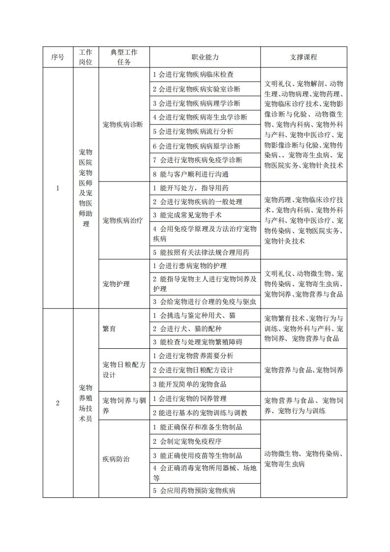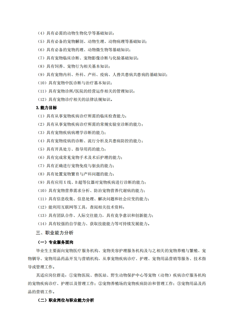 高等职业技术教育《宠物临床诊疗技术》专业人才培养方案(普招三年制)专业代码:510315一、学制及招生对象(一)学制:三年。(二)招生对象:高中(中职)毕业生。(三)招生类型:文理兼收。二、培养目标与人才规格(一)培养目标本专业培养德、智、体全面发展,具有较高综合素养,良好职业道德、创新精神和创业意识,掌握宠物疾病诊疗、保健及护理等知识,具备宠物疾病诊断、治疗、护理、保健以及宠物医院经营管理等能力,适应宠物行业发展需求,能在宠物医院、宠物养殖场、宠物用品与药品企业等领域从事宠物疾病诊疗、宠物饲养、保健、护理、经营管理及宠物用品与药品营销等工作的高素质技术技能人才。(二)人才规格1.素质目标(1)思想政治素质:拥护党的基本路线,具有坚定正确的政治方向:掌握毛泽东思想和邓小平理论以及“三个代表”的重要思想和科学发展观:具有正确的世界观、人生观和价值观,具有良好的诚信品质、敬业精神、责任意识、团队意识和诚信意识,格守公民基本道德规范。(2)职业素质:具有良好的职业安全、环境保护意识、职业道德、创新精神、创业意识,能够立足生产、建设、管理、服务一线,踏实进取,敬业奉献,善于合作,敢于竞争,勇于创新。(3)人文科学素质:具有宽阔的视野、良好的科学思维品质、高雅的审美情趣和正确的审美观:能够正确认识社会、主动适应社会,有较强文字和语言表达能力,有较强的人际交往能力和自我发展能力。(4)身体心理素质:具有健康的身体,良好的生活习惯,爱好体育运动,有一定的运动基础。具有健康积极的人生态度,良好的个性心理品质,有较强的心理调适能力和抗挫折能力。2.知识目标(1)具有必需的公共英语听、说、读、写基本知识和职业英语知识:(2)具有必备的文化基础知识和人文社会科学知识:(3)具有计算机应用的基本知识: