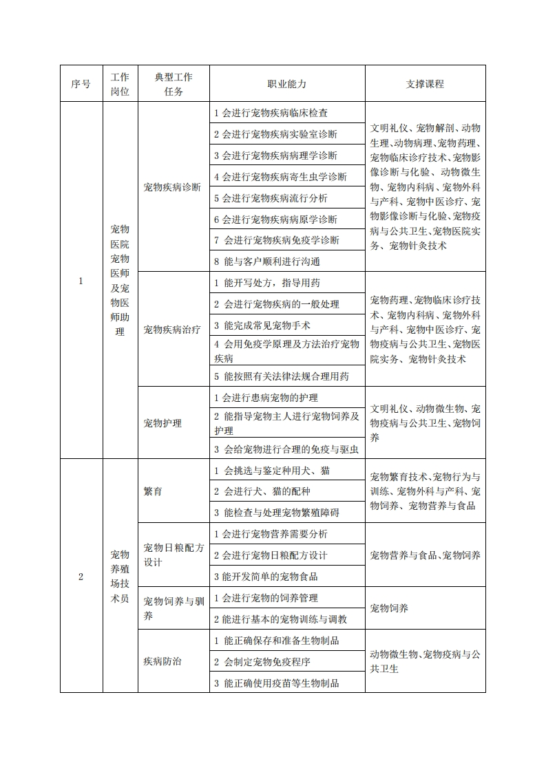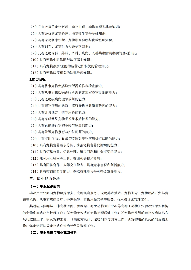 高等职业技术教育《宠物临床诊疗技术》专业人才培养方案(普招三年制)专业代码:510315一、学制及招生对象(一)学制:三年。(二)招生对象:高中(中职)毕业生。(三)招生类型:理科。二、培养目标与人才规格(一)培养目标本专业培养德、智、体、美、劳全面发展,具有较高综合素质、良好职业道德、创新精神和创业意识,掌握宠物疾病诊疗、保健及护理等知识,具备宠物疾病诊断、治疗、护理、保健以及宠物医院经营管理等能力,适应宠物行业发展需求,能在宠物医院、宠物养殖场、宠物用品与药品企业等领域从事宠物疾病诊疗、宠物饲养、保健、护理、经营管理及宠物用品与药品营销等工作的高素质技术技能人才。(二)人才规格1素质目标(1)思想政治素质:拥护党的基本路线,具有坚定正确的政治方向;掌握毛泽东思想和邓小平理论以及“三个代表”的重要思想和科学发展观;具有正确的世界观、人生观和价值观,具有良好的诚信品质、敬业精神、责任意识、团队意识和诚信意识,恪守公民基本道德规范。(2)职业素质:具有良好的职业安全、环境保护意识、职业道德、创新精神、创业意识,能够立足生产、建设、管理、服务一线,踏实进取,敬业奉献,善于合作,敢于竞争,勇于创新。(3)人文科学素质:具有宽阔的视野、良好的科学思维品质、高雅的审美情趣和正确的审美观:能够正确认识社会、主动适应社会,有较强文字和语言表达能力,有较强的人际交往能力和自我发展能力。(4)身体心理素质:具有健康的身体,良好的生活习惯,爱好体育运动,有一定的运动基础。具有健康积极的人生态度,良好的个性心理品质,有较强的心理调适能力和抗挫折能力。2.知识目标(1)具有必需的公共英语听、说、读、写基本知识和职业英语知识:(2)具有必备的文化基础知识和人文社会科学知识:(3)具有计算机应用的基本知识:(4)具有必需的动物生物化学等基础知识: