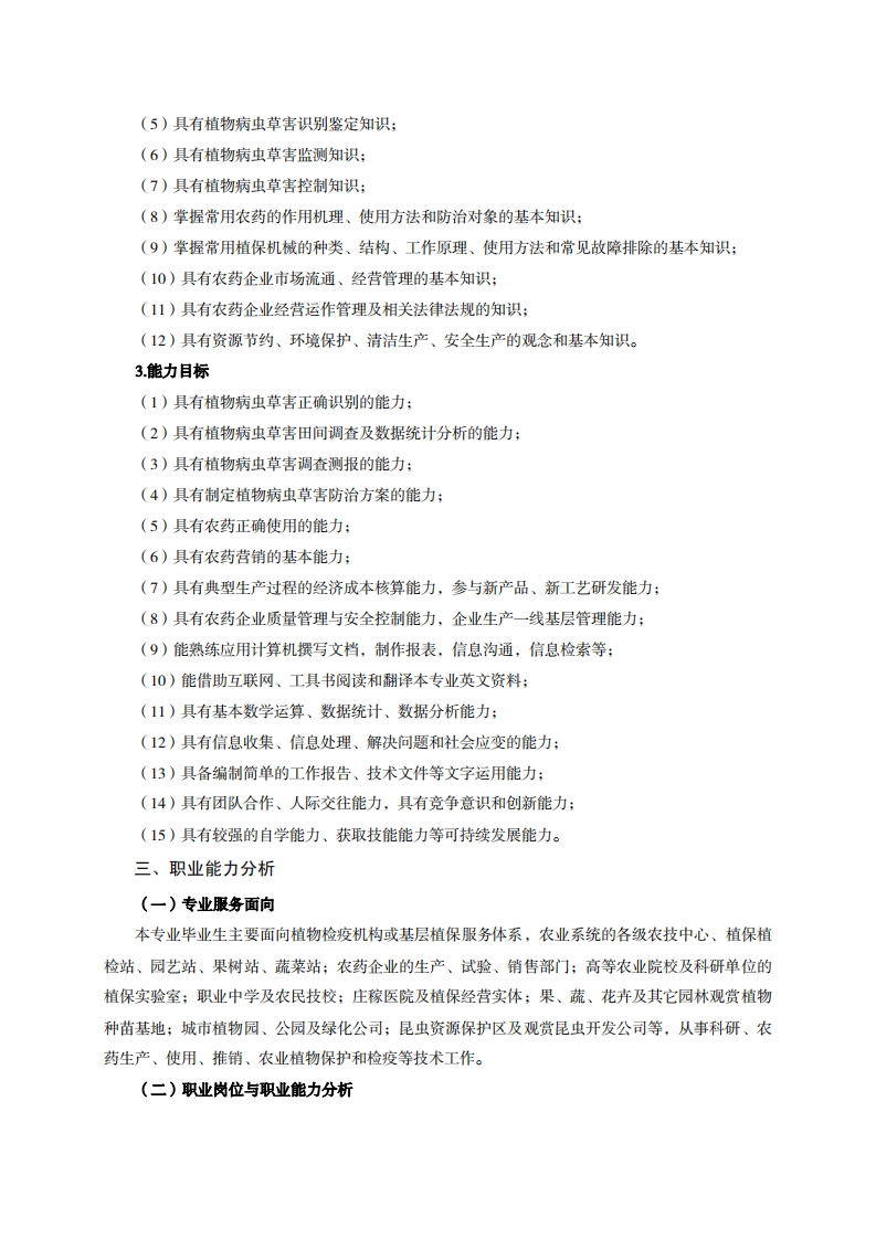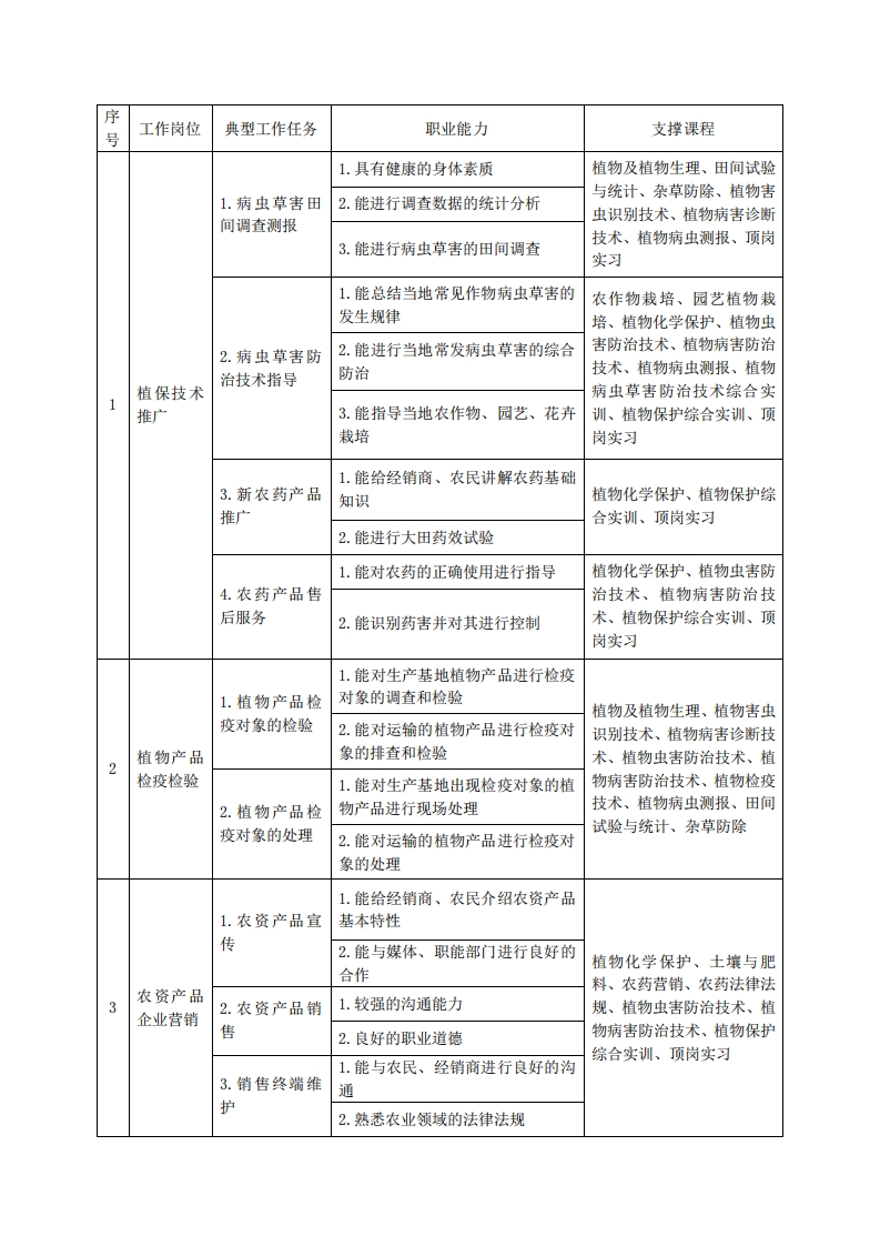 高等职业技术教育《植物保护与检疫技术》专业人才培养方案(普招三年制)专业代码:510108一、学制及招生对象(一)学制:三年。(二)招生对象:高中(中职)毕业生。(三)招生类型:文理兼收。二、培养目标与人才规格(一)培养目标本专业培养德、智、体、美、劳全面发展,具有较高综合素质、良好职业道德、创新精神和创业意识,掌握植物病虫草害的的识别与防治的基本知识,具备农作物有害生物的诊断与防治、农药的应用与营销等方面的基本技能,能在农业及相关企事业单位从事植物病、虫、草害诊断、防治,以及农资产品的生产销售、技术推广等工作的生产、建设、服务和管理第一线需要的技术技能人才。(二)人才规格1.素质目标(1)思想政治素质:拥护党的基本路线,具有坚定正确的政治方向:掌握毛泽东思想和邓小平理论以及“三个代表”的重要思想和科学发展观;具有正确的世界观、人生观和价值观,具有良好的诚信品质、敬业精神、责任意识、团队意识和诚信意识,格守公民基本道德规范。(2)职业素质:具有良好的职业安全、环境保护意识、职业道德、创新精神、创业意识,能够立足生产、建设、管理、服务一线,踏实进取,敬业奉献,善于合作,敢于竞争,勇于创新。(3)人文科学素质:具有宽阔的视野、良好的科学思维品质、高雅的审美情趣和正确的审美观:能够正确认识社会、主动适应社会,有较强文字和语言表达能力,有较强的人际交往能力和自我发展能力。(4)身体心理素质:具有健康的身体,良好的生活习惯,爱好体育运动,有一定的运动基础:具有健康积极的人生态度,良好的个性心理品质,有较强的心理调适能力和抗挫折能力。2、知识目标(1)具有必须的公共英语听、说、读、写基本知识和职业英语知识:(2)具有必备的文化基础知识和人文社会科学知识:(3)具有计算机应用的基本知识:(4)具有必须的化学、植物栽培、微生物等基础知识: