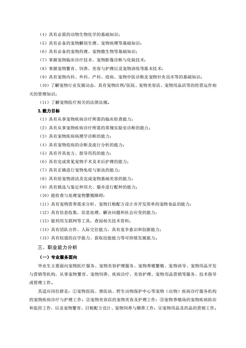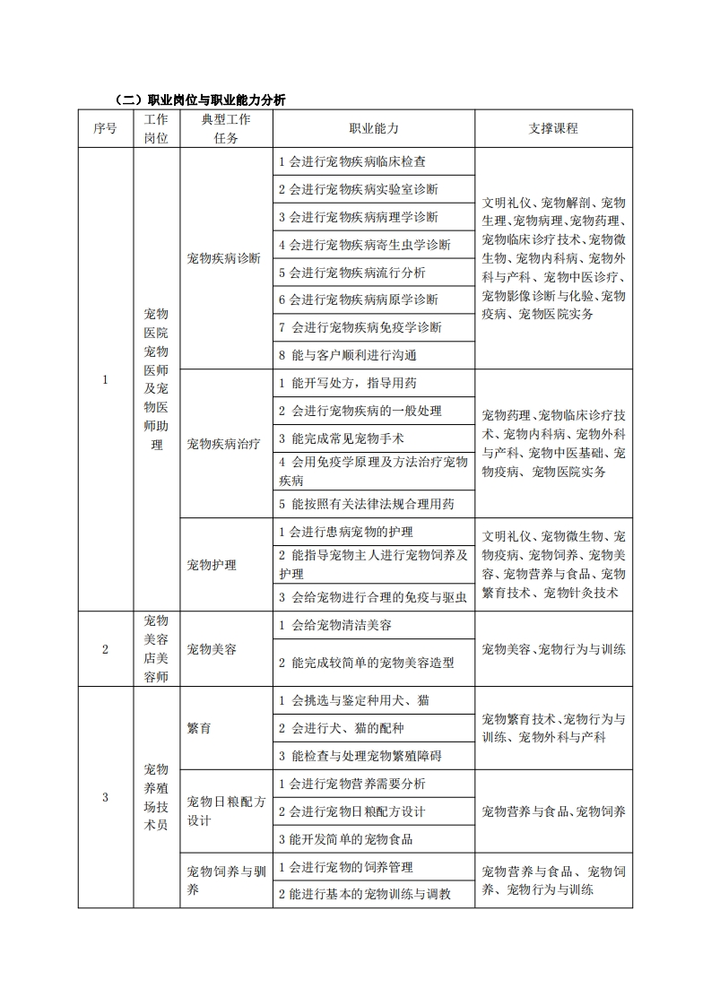 高等职业技术教育《宠物养护与驯导》专业人才培养方案(普招三年制)专业代码:510306一、学制及招生对象(一)学制:三年。(二)招生对象:高中(中职)毕业生。(三)招生类型:文理兼收。二、培养目标与人才规格(一)培养目标本专业培养德、智、体全面发展,具有较高综合素养,良好职业道德、创新精神和创业意识,掌握宠物饲养管理、宠物疾病诊疗、宠物美容与保健等知识,具备宠物疾病诊断与治疗、美容、护理、繁殖和饲养等能力,适应宠物行业发展需求,能在宠物医院、宠物美容店、宠物养殖场、宠物用品与药品等企业从事宠物疾病诊疗、宠物饲养与驯导、宠物美容与护理、宠物用品与药品营销等工作的技术技能人才。(二)人才规格1.素质目标(1)思想政治素质:拥护党的基本路线,具有坚定正确的政治方向:掌握毛泽东思想和邓小平理论以及“三个代表”的重要思想和科学发展观:具有正确的世界观、人生观和价值观,具有良好的诚信品质、敬业精神、责任意识、团队意识和诚信意识,恪守公民基本道德规范,在实现“中国梦”的伟大征程中奋发学习、成就美好人生。(2)职业素质:具有良好的职业安全、环境保护意识、职业道德,创新精神、能够立足生产、建设、管理、服务一线,踏实进取,敬业奉献,善于合作,敢于竞争,勇于创新。(3)人文科学素质:具有宽阔的视野、良好的科学思维品质、高雅的审美情趣和正确的审美观:能够正确认识社会、主动适应社会,有较强文字和语言表达能力,有较强的人际交往能力和自我发展能力。(4)身体心理素质:具有健康的身体,良好的生活习惯,爱好体育运动,有一定的运动基础。具有健康积极的人生态度,良好的个性心理品质,有较强的心理调适能力和抗挫折能力。2.知识目标(1)具有必需的公共英语听、说、读、写基本知识和职业英语知识:(2)具有必备的文化基础知识和人文社会科学知识:(3)具有计算机应用的基本知识: