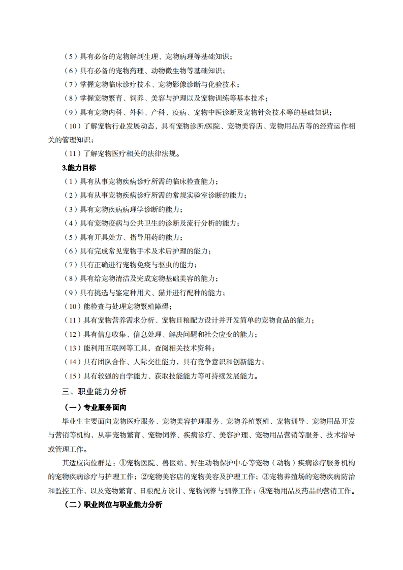 高等职业技术教育《宠物养护与驯导》专业人才培养方案(普招三年制)专业代码:510306一、学制及招生对象(一)学制:三年。(二)招生对象:高中(中职)毕业生。(三)招生类型:文理兼收。二、培养目标与人才规格(一)培养目标本专业培养德、智、体、美、劳全面发展,具有较高综合素质、良好职业道德、创新精神和创业意识,掌握宠物饲养管理、宠物疾病诊疗、宠物美容与保健、宠物驯导等知识,具备宠物疾病诊断与治疗、宠物美容、护理、繁殖和饲养等能力,适应宠物行业发展需求,能在宠物医院、宠物美容机构、宠物养殖场、宠物用品与药品经营等企业从事宠物疾病诊疗、宠物饲养与驯导、宠物美容与护理、宠物用品与药品营销、管理等工作的的高素质技术技能人才。(二)人才规格1.素质目标(1)思想政治素质:拥护党的基本路线,具有坚定正确的政治方向:掌握毛泽东思想和邓小平理论以及“三个代表”的重要思想和科学发展观;具有正确的世界观、人生观和价值观,具有良好的诚信品质、敬业精神、责任意识、团队意识和诚信意识,恪守公民基本道德规范。(2)职业素质:具有良好的职业安全、环境保护意识、职业道德、创新精神、创业意识,能够立足生产、建设、管理、服务一线,踏实进取,敬业奉献,善于合作,敢于竞争,勇于创新。(3)人文科学素质:具有宽阔的视野、良好的科学思维品质、高雅的审美情趣和正确的审美观:能够正确认识社会、主动适应社会,有较强文字和语言表达能力,有较强的人际交往能力和自我发展能力。(4)身体心理素质:具有健康的身体,良好的生活习惯,爱好体育运动,有一定的运动基础。具有健康积极的人生态度,良好的个性心理品质,有较强的心理调适能力和抗挫折能力。2.知识目标(1)具有必需的公共英语听、说、读、写基本知识和职业英语知识:(2)具有必备的文化基础知识和人文社会科学知识:(3)具有计算机应用的基本知识;(4)具有必需的动物生物化学的基础知识: