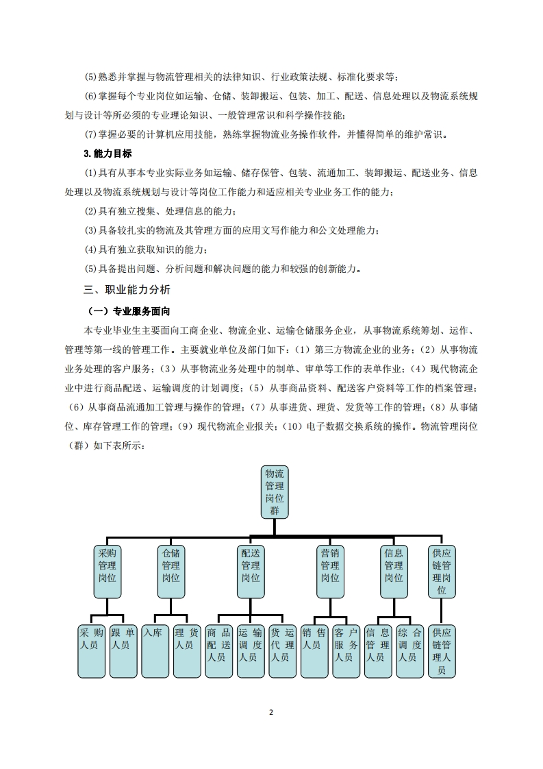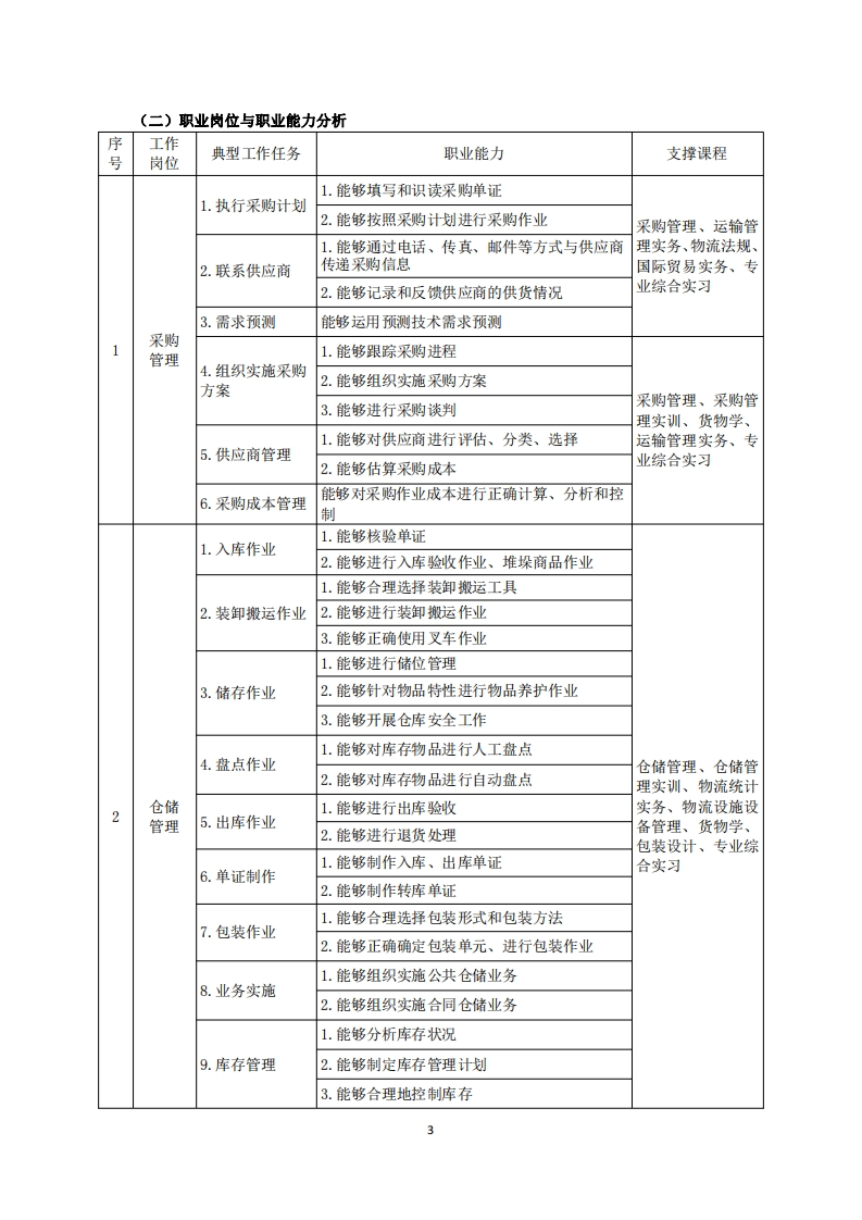 高等职业技术教育《物流管理》专业人才培养方案(普招三年制)专业代码:630903一、学制及招生对象(一)学制:三年。(二)招生对象:高中(中职)毕业生。(三)招生类型:文史。二、培养目标与人才规格(一)培养目标本专业培养德、智、体全面发展,具有较高综合素质、良好职业道德、创新精神和创业意识,掌握供应链管理、仓储管理、物流运输管理及物流营销等方面专业知识,具备配送、采购、仓储、供应链管理的能力,在行政事业单位的相关部门、第三方物流、商贸业物流、制造业物流及国际物流等企事业单位从事物流企业运营管理、日常行政管理、市场营销以及供应链管理等工作的服务、建设和管理第一线需要的技术技能人才。(二)人才规格1.素质目标(1)思想政治素质:拥护党的基本路线,具有坚定正确的政治方向:掌握毛泽东思想和邓小平理论以及“三个代表”的重要思想和科学发展观:具有正确的世界观、人生观和价值观,具有良好的诚信品质、敬业精神、责任意识、团队意识和诚信意识,恪守公民基本道德规范。(2)职业素质:具有良好的职业安全、环境保护意识、职业道德、创新精神、创业意识,能够立足生产、建设、管理、服务一线,踏实进取,敬业奉献,善于合作,敢于竞争,勇于创新。(3)人文科学素质:具有宽阔的视野、良好的科学思维品质、高雅的审美情趣和正确的审美观:能够正确认识社会、主动适应社会,有较强文字和语言表达能力,有较强的人际交往能力和自我发展能力。(4)身体心理素质:具有健康的身体,良好的生活习惯,爱好体育运动,有一定的运动基础。具有健康积极的人生态度,良好的个性心理品质,有较强的心理调适能力和抗挫折能力。2.知识目标(1)具有面向物流作业及其管理一线的高等应用型人才应必备的外语、数学、计算机及文化知识:(2)熟练掌握够用的物流理论知识:(3)熟练掌握物流设备的使用安装、GPS、EDI、RF、ITS等物流技术知识:(4)了解国内外物流发展的新理论、新动向、新成就:1