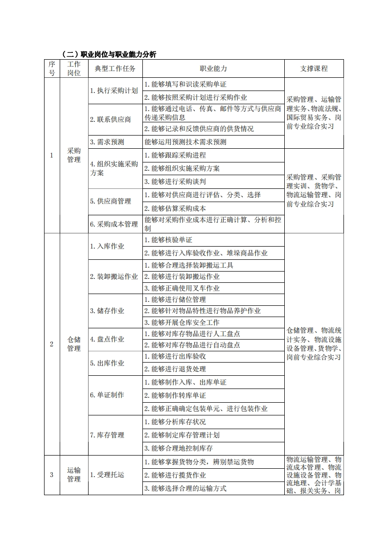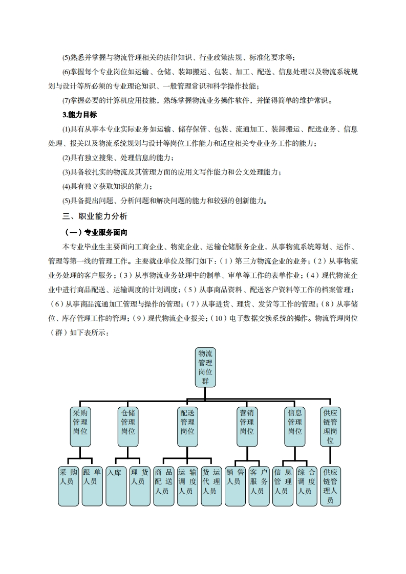 高等职业技术教育《物流管理》专业人才培养方案(普招三年制)专业代码:630903一、学制及招生对象(一)学制:三年。(二)招生对象:高中(中职)毕业生。(三)招生类型:文理兼收。二、培养目标与人才规格(一)培养目标本专业培养德、智、体、美、劳全面发展,具有较高综合素质、良好职业道德、创新精神和创业意识,掌握供应链管理、仓储管理、物流运输管理及物流营销等方面专业知识,具备配送、采购、仓储、供应链管理的能力,在行政事业单位的相关部门、第三方物流、商贸业物流、制造业物流及国际物流等企事业单位从事物流企业运营管理、日常行政管理、市场营销以及供应链管理等工作的服务、建设和管理第一线需要的技术技能人才。(二)人才规格1素质目标(1)思想政治素质:拥护党的基本路线,具有坚定正确的政治方向:掌握毛泽东思想和邓小平理论以及“三个代表”的重要思想和科学发展观;具有正确的世界观、人生观和价值观,具有良好的诚信品质、敬业精神、责任意识、团队意识和诚信意识,格守公民基本道德规范。(2)职业素质:具有良好的职业安全、环境保护意识、职业道德、创新精神、创业意识,能够立足生产、建设、管理、服务一线,踏实进取,敬业奉献,善于合作,敢于竞争,勇于创新。(3)人文科学素质:具有宽阔的视野、良好的科学思维品质、高雅的审美情趣和正确的审美观:能够正确认识社会、主动适应社会,有较强文字和语言表达能力,有较强的人际交往能力和自我发展能力。(4)身体心理素质:具有健康的身体,良好的生活习惯,爱好体育运动,有一定的运动基础。具有健康积极的人生态度,良好的个性心理品质,有较强的心理调适能力和抗挫折能力。2知识目标(1)具有面向物流作业及其管理一线的高等应用型人才应必备的外语、数学、计算机及文化知识:(2)熟练掌握够用的物流理论知识:(3)熟练掌握物流设备的使用安装、GPS、EDI、RF、TS等物流技术知识;(4了解国内外物流发展的新理论、新动向、新成就: