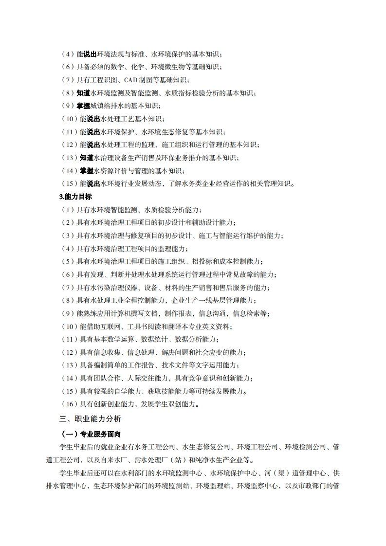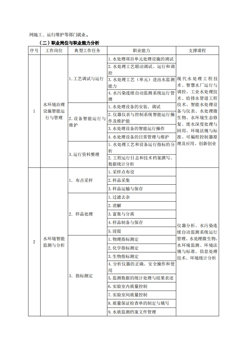 高等职业技术教育《水环境智能监测与治理》专业人才培养方案(普招三年制)专业代码:450402一、学制及招生对象(一)学制:三年。(二)招生对象:高中(中职)毕业生。(三)招生类型:理科。二、培养目标与人才规格(一)培养目标本专业培养德、智、体、美、劳全面发展,具有较高综合素质、良好职业道德、创新精神和创业意识,掌握水资源利用、水环境保护、水生态修复等方面知识,具备水环境智能监测与评价、水环境治理与修复工艺设计、水处理设施智能运行与管理等方面能力,在水利、水务、市政、环保等行业从事水环境智能监测、水污染治理、水生态修复和污水(自来水)运行管理等工作的生产、建设、服务和管理一线需要的高素质技术技能人才。(二)人才规格1.素质目标(1)思想政治素质:系统掌握马克思主义基本原理和马克思主义中国化理论成果,了解党史、新中国史、改革开放史、社会主义发展史,认识世情、国情、党情,深刻领会习近平新时代中国特色社会主义思想,培养运用马克思主义立场观点方法分析和解决问题的能力:自觉践行社会主义核心价值观,尊重和维护宪法法律权威,识大局、尊法治、修美德:矢志不渝听党话跟党走,争做社会主义合格建设者和可靠接班人。(2)职业素质:具有良好的职业安全、环境保护意识、职业道德、创新精神、创业意识,能够立足生产、建设、管理、服务一线,踏实进取,敬业奉献,善于合作,敢于竞争,勇于创新。(3)人文科学素质:具有宽阔的视野、良好的科学思维品质、高雅的审美情趣和正确的审美观:能够正确认识社会、主动适应社会,有较强文字和语言表达能力,有较强的人际交往能力和自我发展能力。(4)身体心理素质:具有健康的身体,良好的生活习惯,爱好体育运动,有一定的运动基础。具有健康积极的人生态度,良好的个性心理品质,有较强的心理调适能力和抗挫折能力。2.知识目标(1)具有必须的公共英语听、说、读、写基本知识和职业英语知识;(2)具有必备的文化基础知识和人文社会科学知识:(3)具备计算机应用的基本知识: