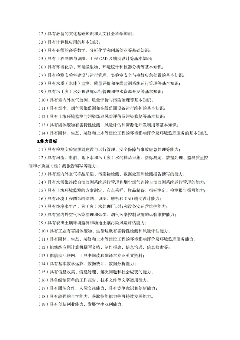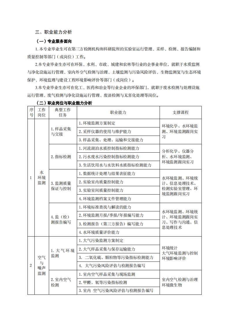 高等职业技术教育《环境监测技术》专业人才培养方案(普招三年制)专业代码:420801一、学制及招生对象(一)学制:三年。(二)招生对象:高中(中职)毕业生。(三)招生类型:文理兼收。二、培养目标与人才规格(一)培养目标本专业培养德、智、体、美、劳全面发展,具有较高综合素质、良好职业道德、创新精神和创业意识,掌握空气、水体、土壤、生物等环境的监测、评价及污染风险评估等方面基本知识,具备环境监测与评价、污染源在线监测系统与环保设施运行管理、污染风险评估与环境监理、实验室建设与日常管理等能力,在环保、水利、市政、国土、城建、化工、医药和农林等行业的行政管理部门或企业,从事第三方检测服务、污(废)水监测与净化设施运行管理、室内外空气检测与治理、土壤污染检测与风险评估、生物监测与生态风险评估、环境监理与建设工程环境影响评价等工作的生产、建设、服务和管理第一线需要的高素质技术技能人才。(二)人才规格1.素质目标(1)思想政治素质:拥护党的基本路线,具有坚定正确的政治方向:掌握毛泽东思想和邓小平理论、“三个代表”重要思想、科学发展观和习近平新时代中国特色社会主义思想:具有正确的世界观、人生观和价值观,具有良好的诚信品质、敬业精神、责任意识、团队意识和诚信意识,格守公民基本道德规范。(2)职业素质:具有良好的职业安全、环境保护意识、职业道德、创新精神、创业意识,能够立足生产、建设、管理、服务一线,踏实进取,敬业奉献,善于合作,敢于竞争,勇于创新。(3)人文科学素质:具有宽阔的视野、良好的科学思维品质、高雅的审美情趣和正确的审美观;能够正确认识社会、主动适应社会,有较强文字和语言表达能力,有较强的人际交往能力和自我发展能力。(4)身体心理素质:具有健康的身体,良好的生活习惯,爱好体育运动,有一定的运动基础。具有健康积极的人生态度,良好的个性心理品质,有较强的心理调适能力和抗挫折能力。2.知识目标(1)具有必须的公共英语听、说、读、写基本知识和职业英语知识;