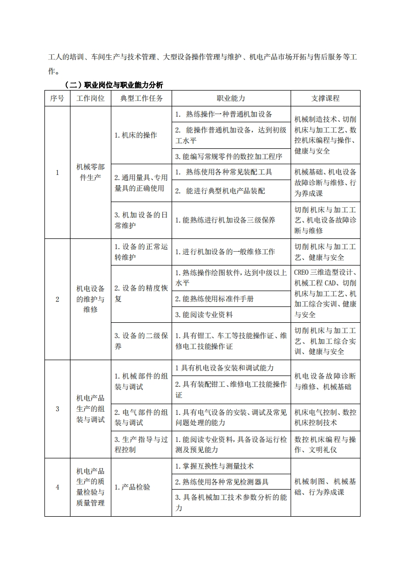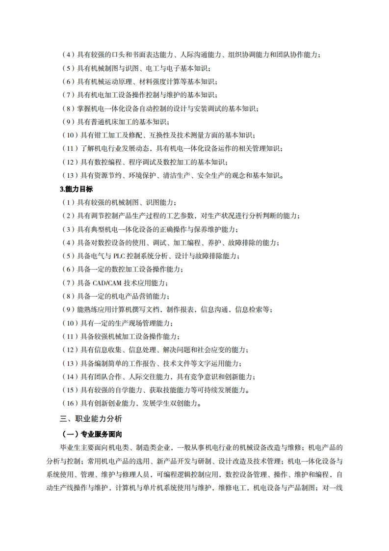 高等职业技术教育《机电一体化技术》专业人才培养方案(普招三年制)专业代码:560301一、学制及招生对象(一)学制:三年。(二)招生对象:高中(中职)毕业生。(三)招生类型:理科。二、培养目标与人才规格(一)培养目标本专业培养德、智、体、美、劳全面发展,具有较高综合素质、良好职业道德、创新精神和创业意识,掌握机械运动原理、电气控制、识图绘图、机械加工等知识,具备机构运动分析、电气控制设计与安装、机械造型设计、数控加工等能力,在机电、制造行业从事机电设备的控制、安装与使用、故障分析和维修,普通机床的操作与维修,机电控制系统操作及机电设备营销,数控设备的操作、维护和编程,安装调试及维修等工作的生产、建设、服务和管理第一线需要的高素质技术技能人才。(二)人才规格1.素质目标(1)思想政治素质:拥护党的基本路线,具有坚定正确的政治方向;掌握毛泽东思想和邓小平理论以及“三个代表”的重要思想和科学发展观;具有正确的世界观、人生观和价值观,具有良好的诚信品质、敬业精神、责任意识、团队意识和诚信意识,格守公民基本道德规范。(2)职业素质:具有良好的职业安全、环境保护意识、职业道德、创新精神、创业意识,能够立足生产、建设、管理、服务一线,踏实进取,敬业奉献,善于合作,敢于竞争,勇于创新。(3)人文科学素质:具有宽阔的视野、良好的科学思维品质、高雅的审美情趣和正确的审美观:能够正确认识社会、主动适应社会,有较强文字和语言表达能力,有较强的人际交往能力和自我发展能力。(4)身体心理素质:具有健康的身体,良好的生活习惯,爱好体育运动,有一定的运动基础。具有健康积极的人生态度,良好的个性心理品质,有较强的心理调适能力和抗挫折能力。2.知识目标(1)具有必须的公共英语听、说、读、写基本知识和职业英语知识;(2)具有必备的文化基础知识和人文社会科学知识:(3)具有计算机应用的基本知识: