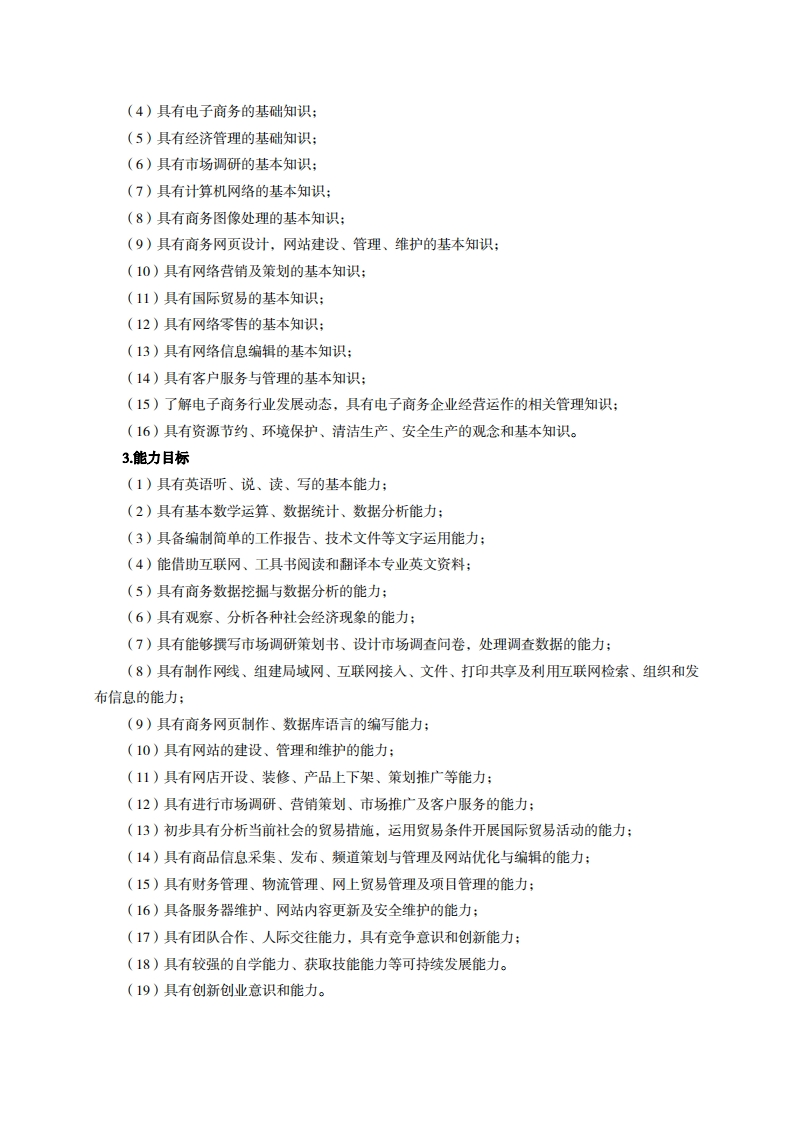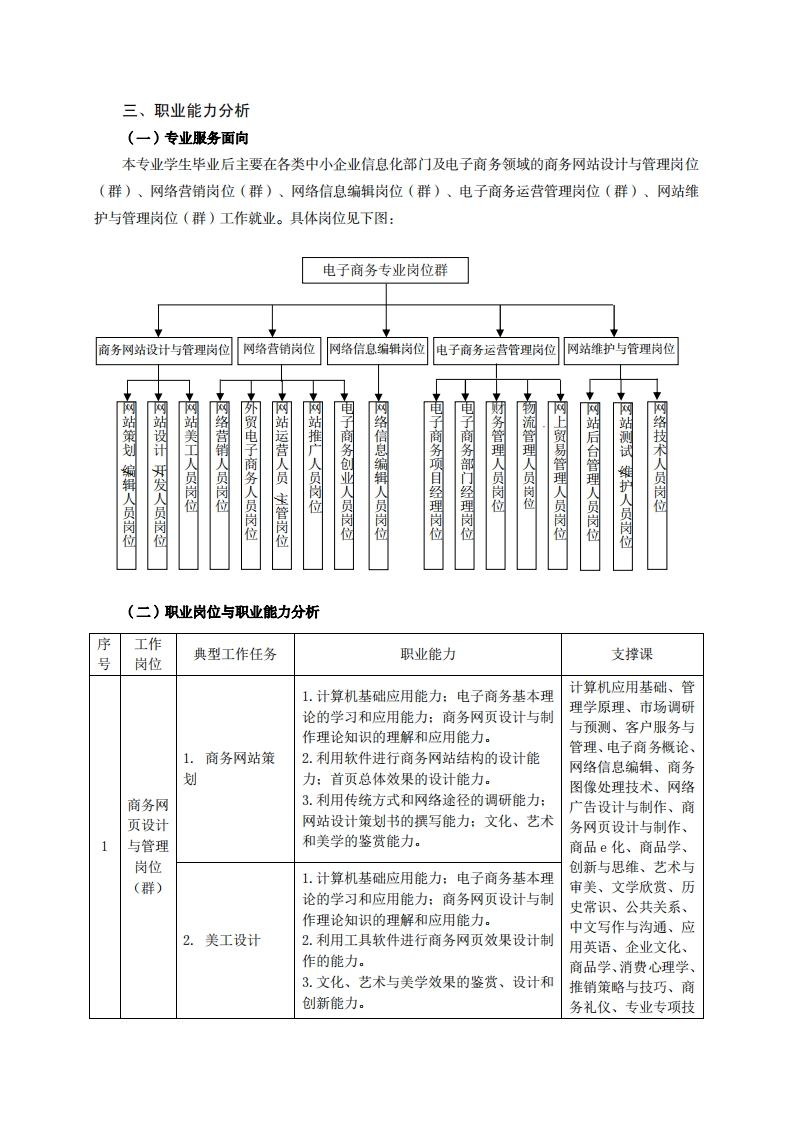 高等职业技术教育《电子商务》专业人才培养方案(普招三年制)专业代码:630801一、学制及招生对象(一)学制:三年。(二)招生对象:高中(中职)毕业生。(三)招生类型:理科。二、培养目标与人才规格(一)培养目标本专业培养德、智、体、美、劳全面发展,具有较高综合素质、良好职业道德、创新精神和创业意识,掌握网络技术、商务图像处理、商务网页设计与制作、网络信息编辑、网络营销与策划、市场调研与预测、推销策略与技巧、客户服务与管理、电子商务运营与管理、移动电子商务、跨境电子商务等专业领域实际工作的基本知识,具备使用网络开展商务活动的能力,在各类中小企业的视觉设计、营销推广、运营、客服、物流等岗位从事视觉美设计、商务网页设计与制作、网络营销、电子商务运营与管理等工作的建设、服务、管理第一线需要的高素质技术技能人才。(二)人才规格1素质目标(1)思想政治素质:拥护党的基本路线,具有坚定正确的政治方向:掌握毛泽东思想和邓小平理论以及“三个代表”的重要思想和科学发展观:具有正确的世界观、人生观和价值观,具有良好的诚信品质、敬业精神、责任意识、团队意识和诚信意识,恪守公民基本道德规范。(2)职业素质:具有良好的职业安全、环境保护意识、职业道德,创新精神、创业意识,能够立足生产、建设、管理、服务一线,踏实进取,敬业奉献,善于合作,敢于竞争,勇于创新。(3)人文科学素质:具有宽阔的视野、良好的科学思维品质、高雅的审美情趣和正确的审美观:能够正确认识社会、主动适应社会,有较强文字和语言表达能力,有较强的人际交往能力和自我发展能力。(4)身体心理素质:具有健康的身体,良好的生活习惯,爱好体育运动,有一定的运动基础。具有健康积极的人生态度,良好的个性心理品质,有较强的心理调适能力和抗挫折能力。2.知识目标(1)具有必须的公共英语听、说、读、写基本知识和职业英语知识;(2)具有必备的文化基础知识和人文社会科学知识:(3)具有计算机应用的基本知识: