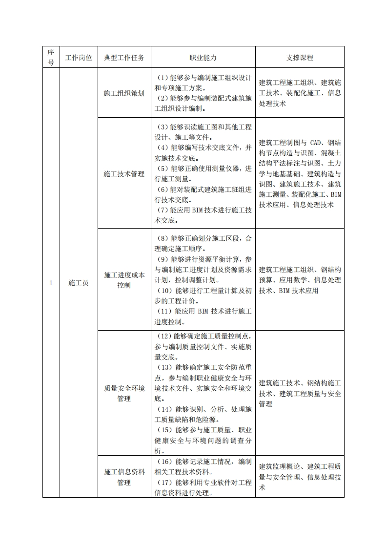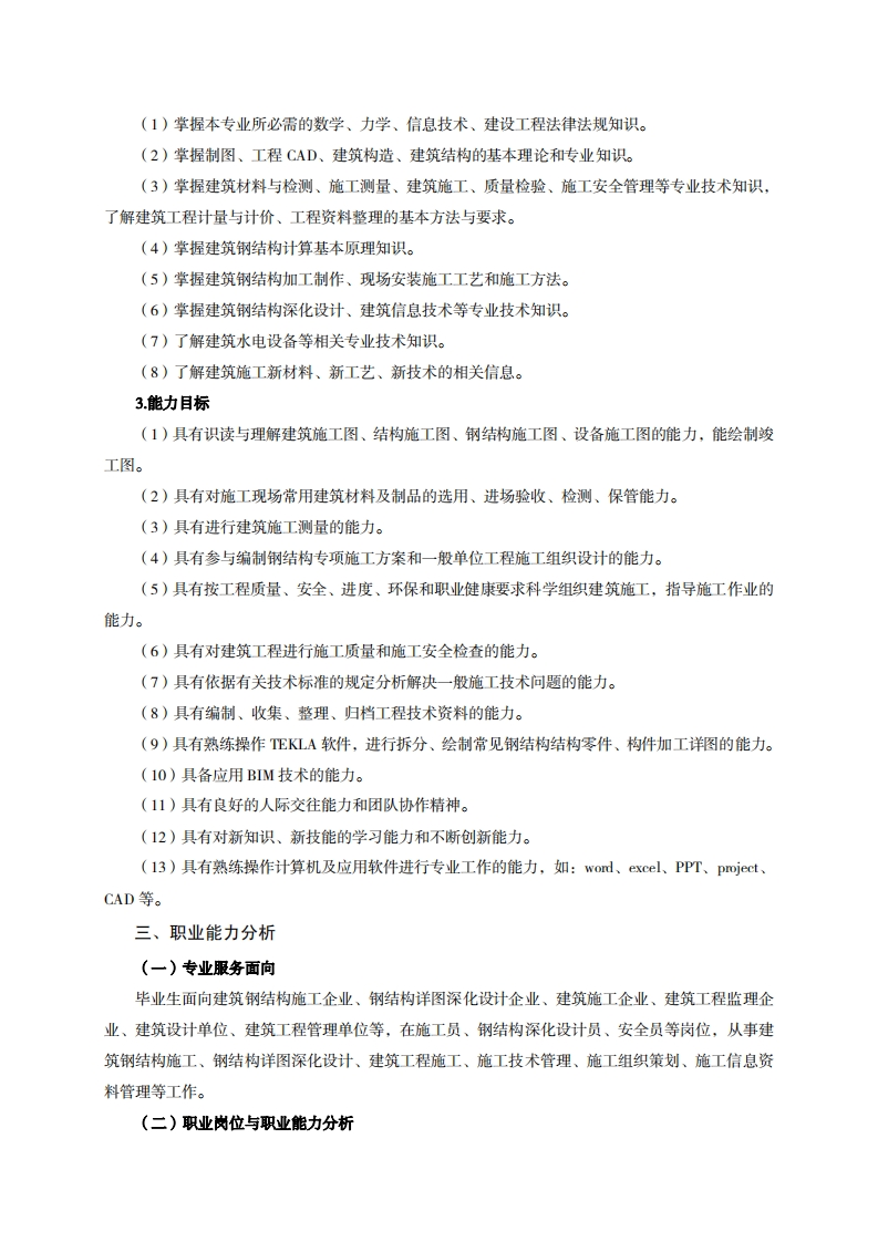 高等职业技术教育《建筑工程技术》专业人才培养方案(普招三年制)(建筑钢结构工程施工技术方向)专业代码:540301一、学制及招生对象(一)学制:三年。(二)招生对象:高中(中职)毕业生。(三)招生类型:理科。二、培养目标与人才规格(一)培养目标本专业培养德、智、体、美、劳全面发展,具有较高综合素质、良好职业道德、创新精神和创业意识,掌握建筑材料及钢结构材料、识图、测量、施工工艺、项目管理等专业知识,具备识图、钢结构深化设计、施工测量、工程技术文件编制及施工现场管理能力,在钢结构施工企业、建筑工程施工、工程管理等企业,从事钢结构详图深化设计、施工组织策划、施工技术管理、施工进度成本控制、施工信息资料管理、作业安全管理、安全资料管理等工作的生产、建设、服务和管理第一线需要的高素质技术技能人才。(二)人才规格1.素质目标(1)思想政治素质:拥护党的基本路线,具有坚定正确的政治方向:掌握毛泽东思想和邓小平理论以及“三个代表”的重要思想和科学发展观:具有正确的世界观、人生观和价值观,具有良好的诚信品质、敬业精神、责任意识、团队意识和诚信意识,恪守公民基本道德规范。(2)职业素质:具有良好的职业安全、环境保护意识、职业道德、创新精神、创业意识,能够立足生产、建设、管理、服务一线,踏实进取,敬业奉献,善于合作,敢于竞争,勇于创新。(3)人文科学素质:具有宽阔的视野、良好的科学思维品质、高雅的审美情趣和正确的审美观:能够正确认识社会、主动适应社会,有较强文字和语言表达能力,有较强的人际交往能力和自我发展能力。(4)身体心理素质:具有健康的身体,良好的生活习惯,爱好体育运动,有一定的运动基础。具有健康积极的人生态度,良好的个性心理品质,有较强的心理调适能力和抗挫折能力。2.知识目标