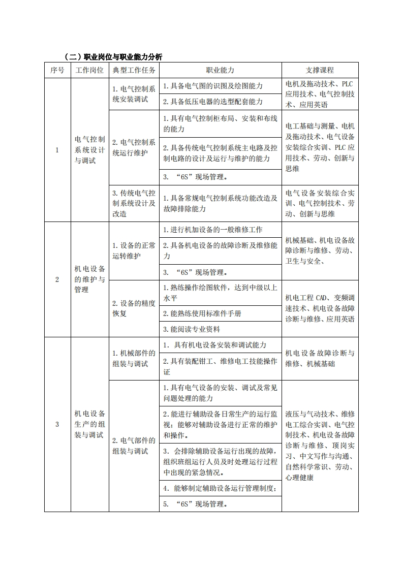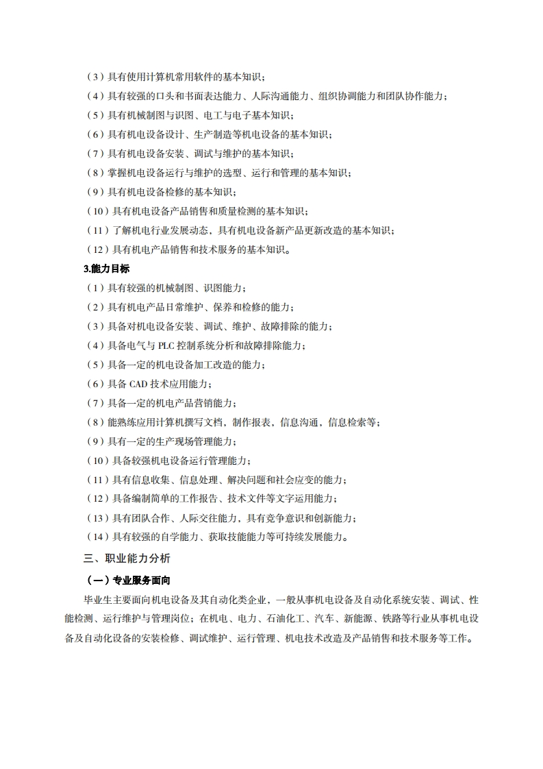 高等职业技术教育《机电设备维修与管理》专业人才培养方案(普招三年制)专业代码:560203一、学制及招生对象(一)学制:三年。(二)招生对象:高中(中职)毕业生。(三)招生类型:理科。二、培养目标与人才规格(一)培养目标本专业培养德、智、体、美、劳全面发展,具有较高综合素质、良好职业道德、创新精神和创业意识,掌握现代机电设备控制技术、维修与管理、安装检修、调试维护、产品销售和技术服务的理论知识,具备现代机电产品安装调试的识图能力,设备的安装、检修操作能力以及产品的销售、维护和管理等能力,在机电、电力、石油化工、汽车、新能源、铁路等行业,从事机电设备及自动化设备的安装检修、调试维护、运行管理、数控技术改造等工作的生产、建设、服务和管理第一线需要的高素质技术技能人才。(二)人才规格1素质目标(1)思想政治素质:拥护党的基本路线,具有坚定正确的政治方向:掌握毛泽东思想和邓小平理论以及“三个代表”的重要思想和科学发展观;具有正确的世界观、人生观和价值观,具有良好的诚信品质、敬业精神、责任意识、团队意识和诚信意识,格守公民基本道德规范。(2)职业素质:具有良好的职业安全、环境保护意识、职业道德;创新精神,创新意识,能够立足生产、建设、管理、服务一线,踏实进取,敏业奉献,善于合作,敢于竞争,勇于创新。(3)人文科学素质:具有宽阔的视野、良好的科学思维品质、高雅的审美情趣和正确的审美观:能够正确认识社会、主动适应社会,有较强文字和语言表达能力,有较强的人际交往能力和自我发展能力。(4)身体心理素质:具有健康的身体,良好的生活习惯,爱好体育运动,有一定的运动基础:具有健康积极的人生态度,良好的个性心理品质,有较强的心理调适能力和抗挫折能力。2.知识目标(1)具有必须的公共英语听、说、读、写基本知识和职业英语知识:(2)具有必备的文化基础知识和人文社会科学知识: