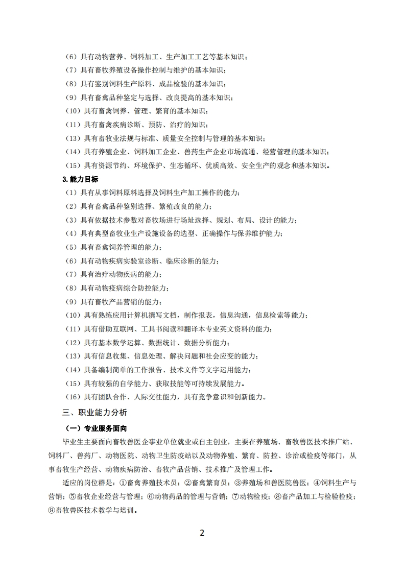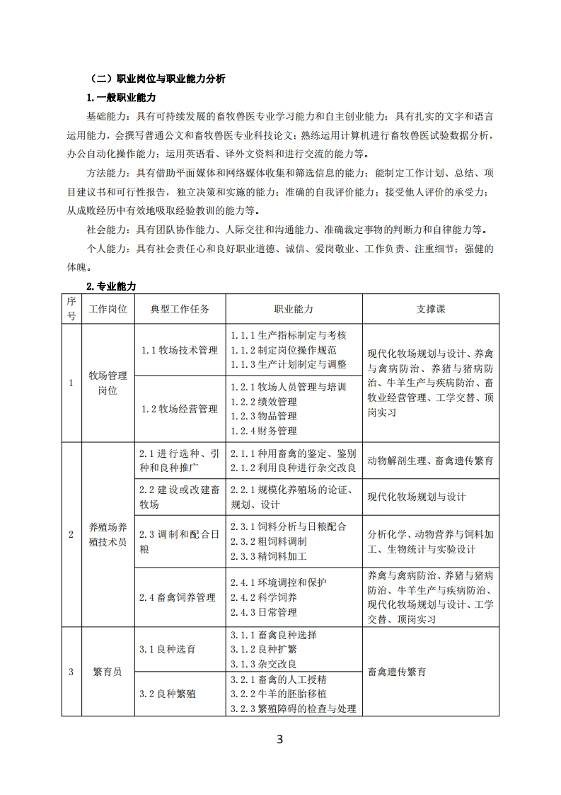 高等职业技术教育《畜牧兽医》专业人才培养方案(普招三年制)专业代码:510301一、学制及招生对象(一)学制:三年。(二)招生对象:高中(中职)毕业生。(三)招生类型:文理兼收。二、培养目标与人才规格(一)培养目标本专业培养德、智、体全面发展,具有较高综合素质、良好职业道德、创新精神和创业意识,掌握畜牧生产和疫病防控知识,具备选种、饲养、繁殖、改良、预防、诊断和治疗等能力,在养殖行业、兽药行业和饲料行业等企业或动物医院,从事动物养殖、饲料生产、疾病监测、经营管理、疾病防治、产品营销与售后服务等工作的生产、建设、服务和管理第一线需要的技术技能人才。(二)人才规格1.素质目标(1)思想政治素质:拥护党的基本路线,具有坚定正确的政治方向:掌握毛泽东思想和邓小平理论以及“三个代表”的重要思想和科学发展观:具有正确的世界观、人生观和价值观,具有良好的诚信品质、敬业精神、责任意识、团队意识和诚信意识,格守公民基本道德规范。(2)职业素质:具有良好的职业安全、环境保护意识、职业道德,能够立足生产、建设、管理、服务一线,踏实进取,敬业奉献,善于合作,敢于竞争,勇于创新。(3)人文科学素质:具有宽阔的视野、良好的科学思维品质、高雅的审美情趣和正确的审美观:能够正确认识社会、主动适应社会,有较强文字和语言表达能力,有较强的人际交往能力和自我发展能力。(4)身体心理素质:具有健康的身体,良好的生活习惯,爱好体育运动,有一定的运动基础。具有健康积极的人生态度,良好的个性心理品质,有较强的心理调适能力和抗挫折能力。2.知识目标(1)具有必须的公共英语听、说、读、写基本知识和职业英语知识:(2)具有必备的文化基础知识和人文社会科学知识:(3)具有计算机应用的基本知识:(4)具有必须的有机化学、分析化学、动物生物化学、动物微生物等基础知识:(5)具有动物解剖生理、病理、药理基本知识:1
