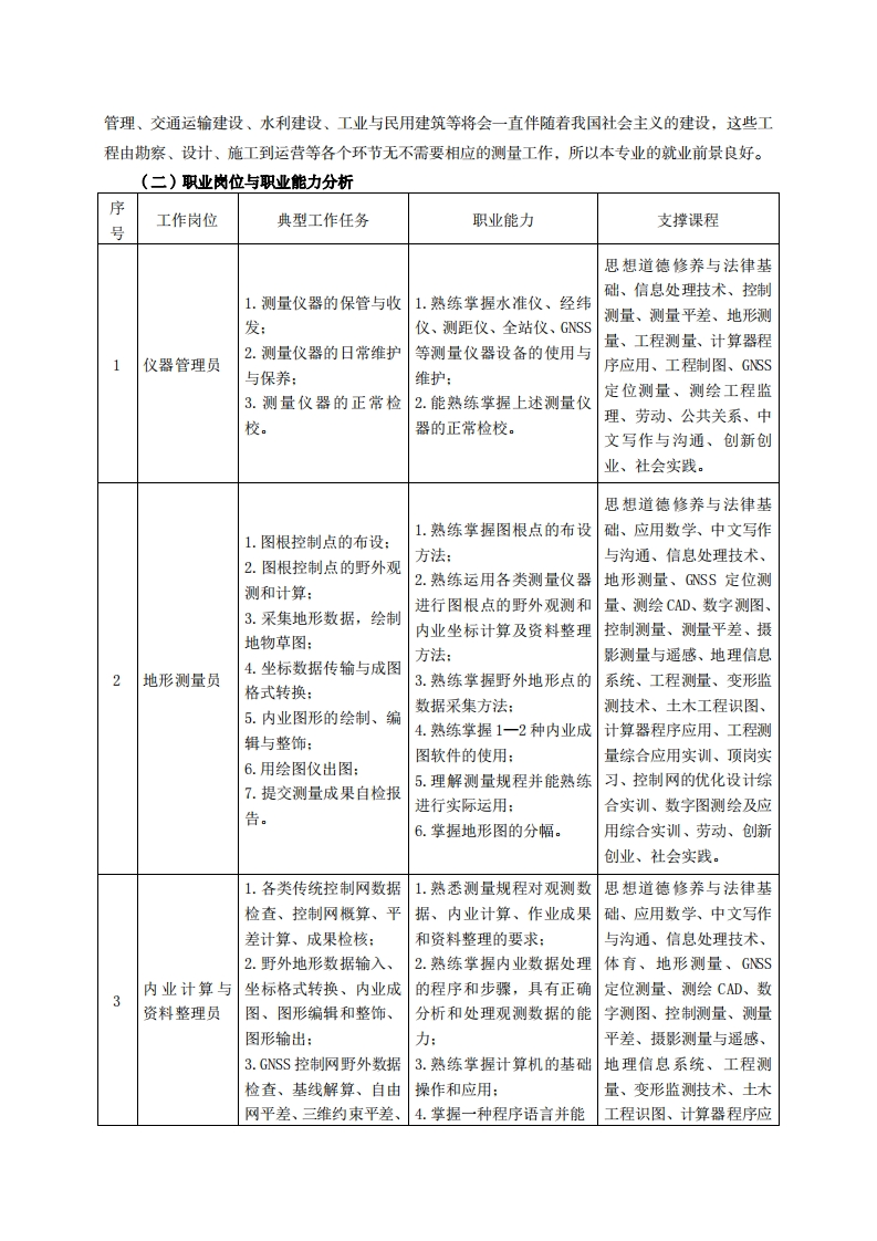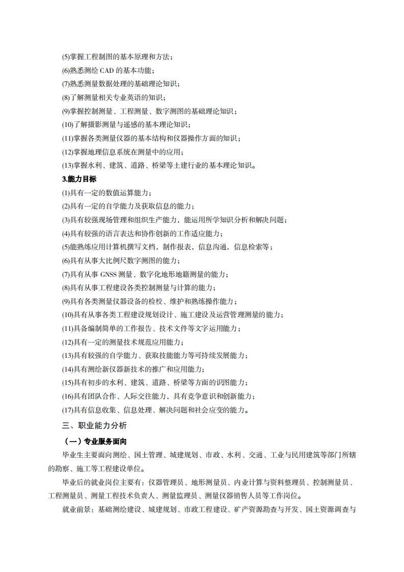 高等职业技术教育《工程测量技术》专业人才培养方案(普招三年制)专业代码:520301一、学制及招生对象(一)学制:三年。(二)招生对象:高中(中职)毕业生。(三)招生类型:理科。二、培养目标与人才规格(一)培养目标本专业培养德、智、体、美、劳全面发展,具有较高综合素质、良好职业道德、创新精神和创业意识,掌握测量仪器的基本原理及地形测量基本知识,具备现代测量仪器操作、空间数据采集处理和计算机绘图等能力,在测绘、国土管理、城建规划、市政、水利、交通、工业与民用建筑等行业从事数字图测绘、施工控制网的布设和实施、施工放样、变形监测、地籍房产管理、市政建设工程、城市部件测量等一线测量工作的生产、建设、服务和管理第一线需要的高素质技术技能人才。(二)人才规格1.素质目标(1)思想政治素质:拥护党的基本路线,具有坚定正确的政治方向;掌握毛泽东思想和邓小平理论以及“三个代表”的重要思想和科学发展观;具有正确的世界观、人生观和价值观,具有良好的诚信品质、敬业精神、责任意识、团队意识和诚信意识,恪守公民基本道德规范。(2)职业素质:具有良好的职业安全、环境保护意识、职业道德,能够立足生产、建设、管理、服务一线,踏实进取,敬业奉献,善于合作,敢于竞争,勇于创新。(3)人文科学素质:具有宽阔的视野、良好的科学思维品质、高雅的审美情趣和正确的审美观:能够正确认识社会、主动适应社会,有较强文字和语言表达能力,有较强的人际交往能力和自我发展能力。(4)身体心理素质:具有健康的身体,良好的生活习惯,爱好体育运动,有一定的运动基础。具有健康积极的人生态度,良好的个性心理品质,有较强的心理调适能力和抗挫折能力。2.知识目标(1)掌握应用数学方面的知识:(2)掌握法律及法规方面的知识:(3)掌握计算机操作与应用的基本知识:(4)掌握地形测量的基础理论知识;
