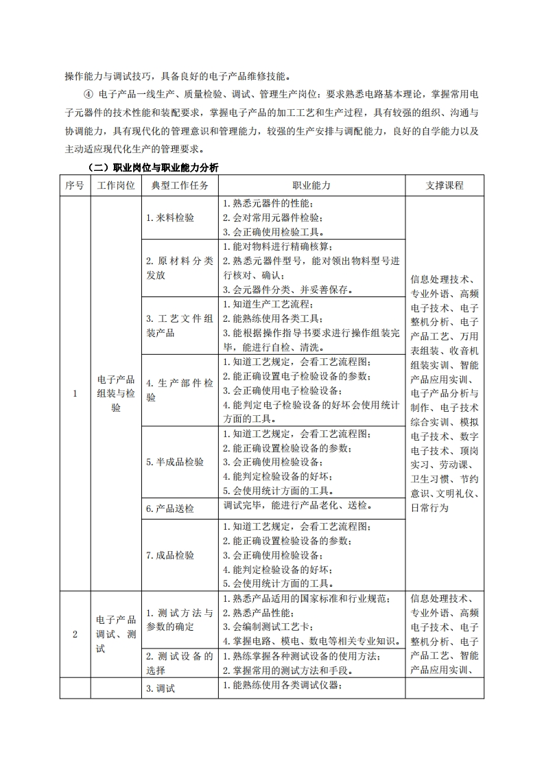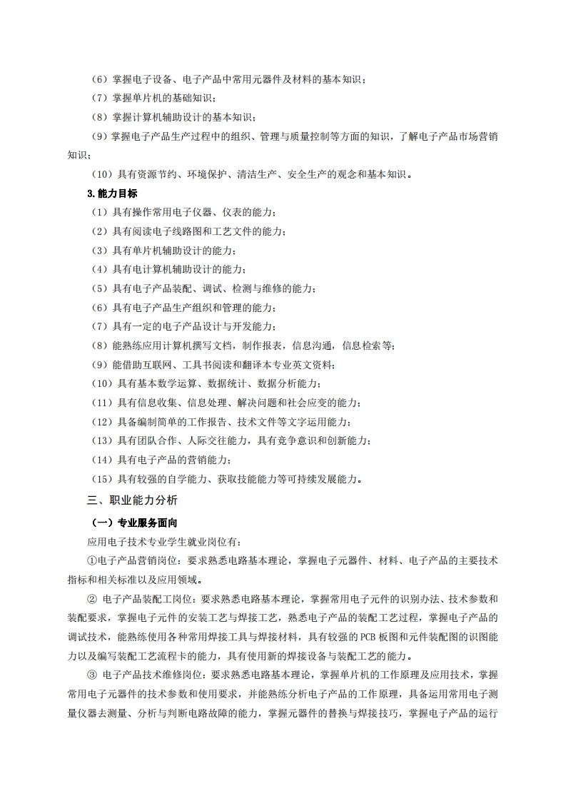 高等职业技术教育《应用电子技术》专业人才培养方案(普招三年制)专业代码:610102一、学制及招生对象(一)学制:三年。(二)招生对象:高中毕业生。(三)招生类型:理科。二、培养目标与人才规格(一)培养目标本专业培养德、智、体全面发展,具有较高综合素质、良好职业道德、创新精神和创业意识,掌握电路基础、模拟电子技术、数字电子技术、单片机技术、高频电子线路、现代电子设计与制作技术、电子产品生产工艺及管理、电子测量等知识,具备计算机辅助设计能力、单片机辅助开发与设计能力、电子产品的分析能力、常用电子仪器、工具使用能力,在电子行业(企业或岗位等)从事现代电子类工作的生产、建设、服务和管理第一线需要的高素质技术技能人才。(二)人才规格1.素质目标(1)思想政治素质:拥护党的基本路线,具有坚定正确的政治方向:掌握毛泽东思想和邓小平理论以及“三个代表”的重要思想和科学发展观:具有正确的世界观、人生观和价值观,具有良好的诚信品质、敬业精神、责任意识、团队意识和诚信意识,格守公民基本道德规范。(2)职业素质:具有良好的职业安全、环境保护意识、职业道德、创新精神、创业意识,能够立足生产、建设、管理、服务一线,踏实进取,敬业奉献,善于合作,敢于竞争,勇于创新。(3)人文科学素质:具有宽阔的视野、良好的科学思维品质、高雅的审美情趣和正确的审美观:能够正确认识社会、主动适应社会,有较强文字和语言表达能力,有较强的人际交往能力和自我发展能力。(4)身体心理素质:具有健康的身体,良好的生活习惯,爱好体育运动,有一定的运动基础。具有健康积极的人生态度,良好的个性心理品质,有较强的心理调适能力和抗挫折能力。2.知识目标(1)具有必须的公共英语听、说、读、写基本知识和职业英语知识:(2)具有必备的文化基础知识和人文社会科学知识:(3)具有计算机应用的基本知识:(4)具有必须的电路基础知识:(5)掌握电子专业的基础知识、基本理论和基本技术: